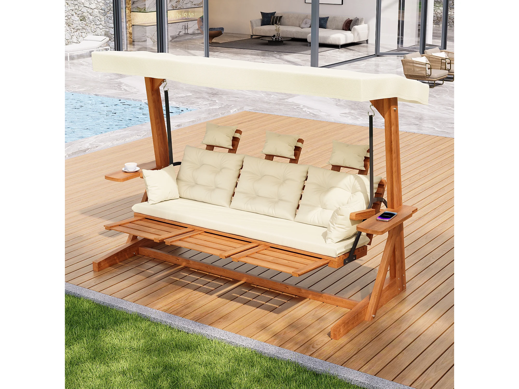 Balançoire mobilier de jardin robuste - avec coussins + oreillers + toit + repose-pieds - bois - naturel