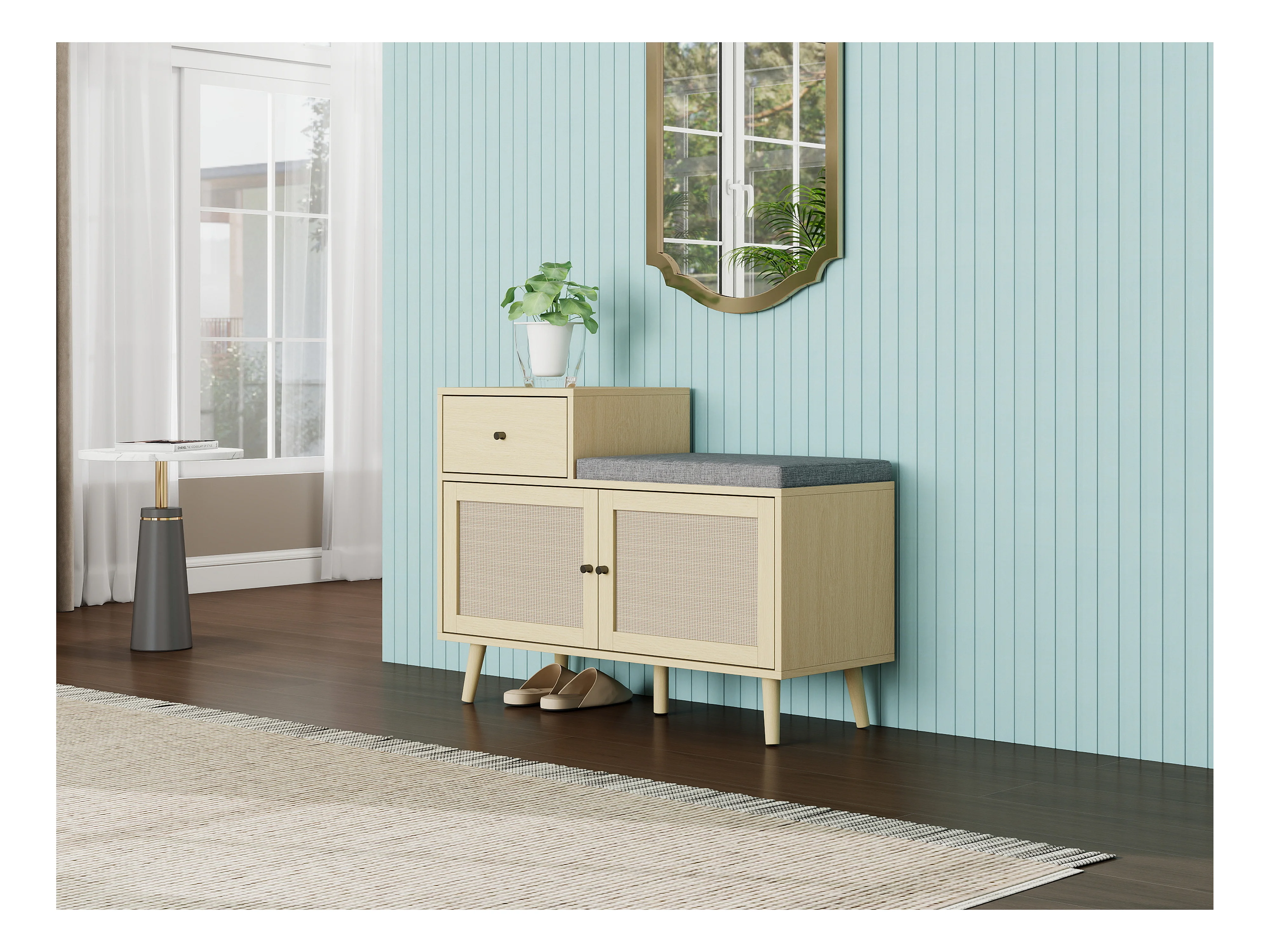 Banc à chaussures en style boho, avec 2 portes en rotin, 1 tiroir, assise rembourrée, en bois naturel (90x35x65 cm)