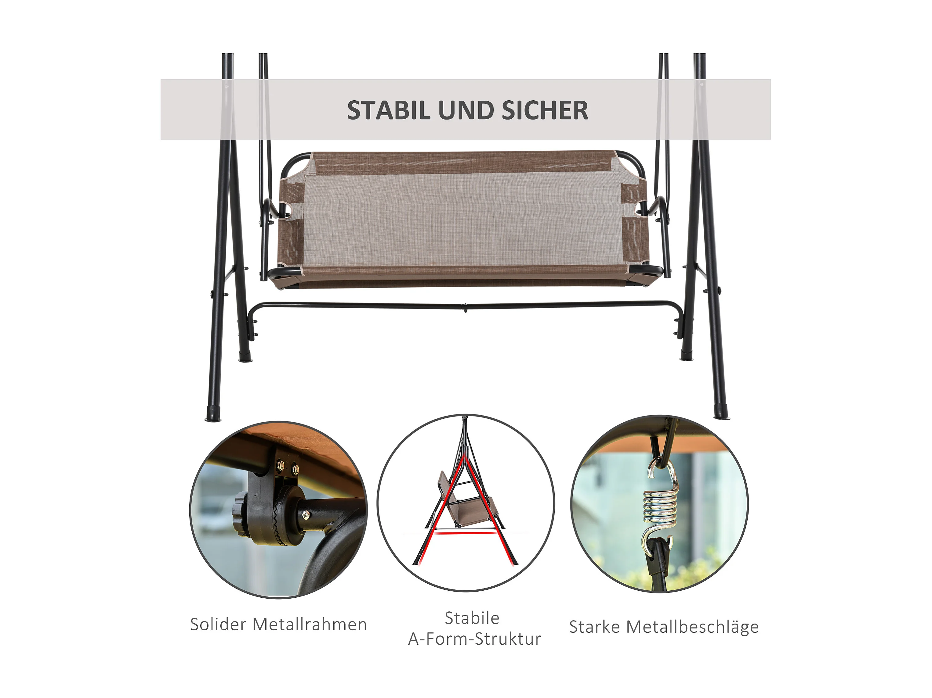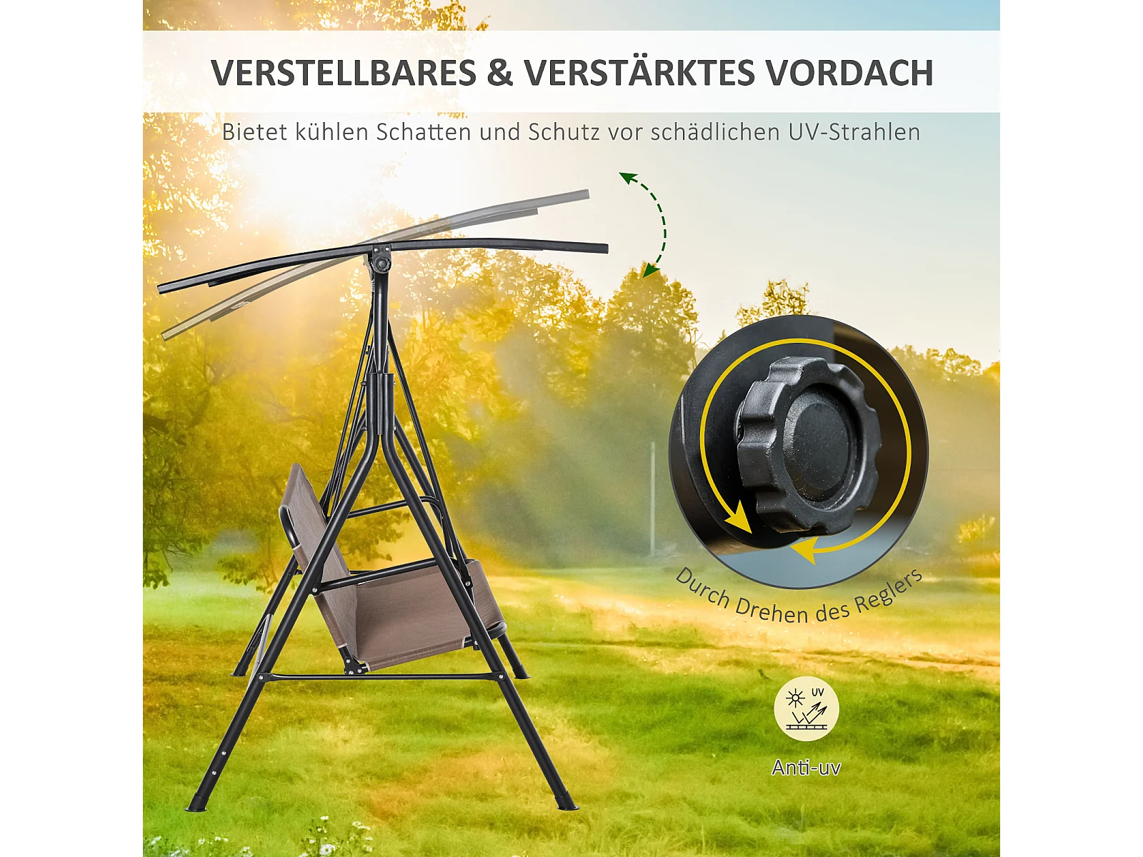 Banc balançoire 2 places avec toit réglable, métal, brun (172x110x155 cm)
