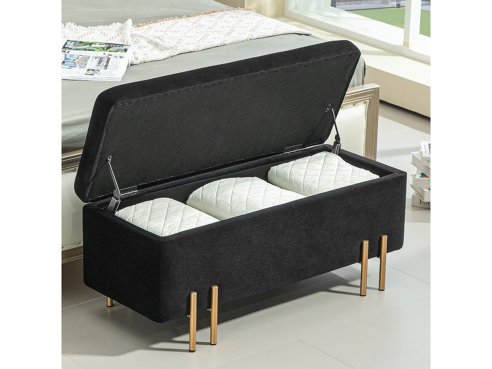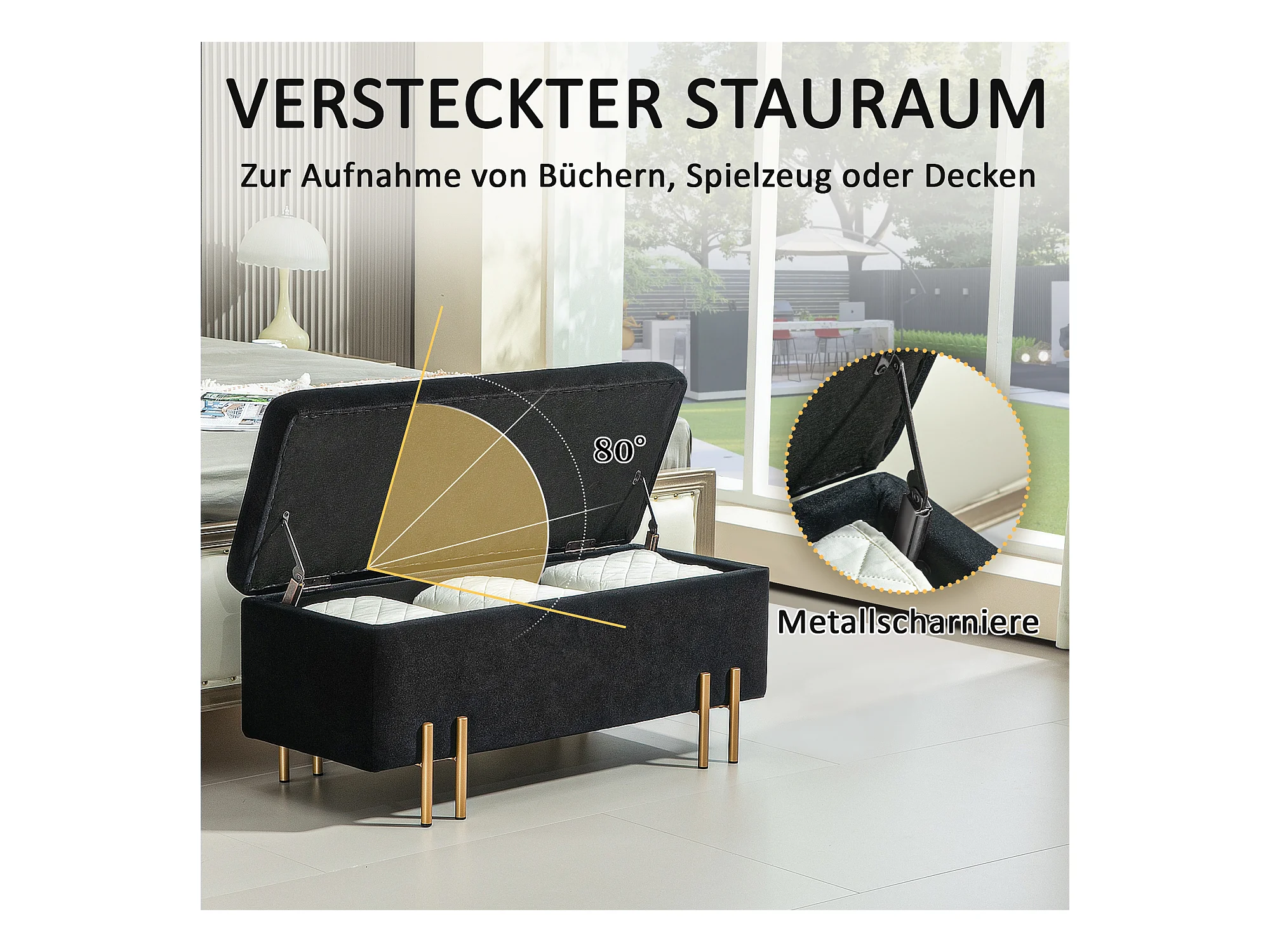 Banc de rangement avec assise rembourrée, velours, pieds en acier, noir, (100x37.5x42 cm)