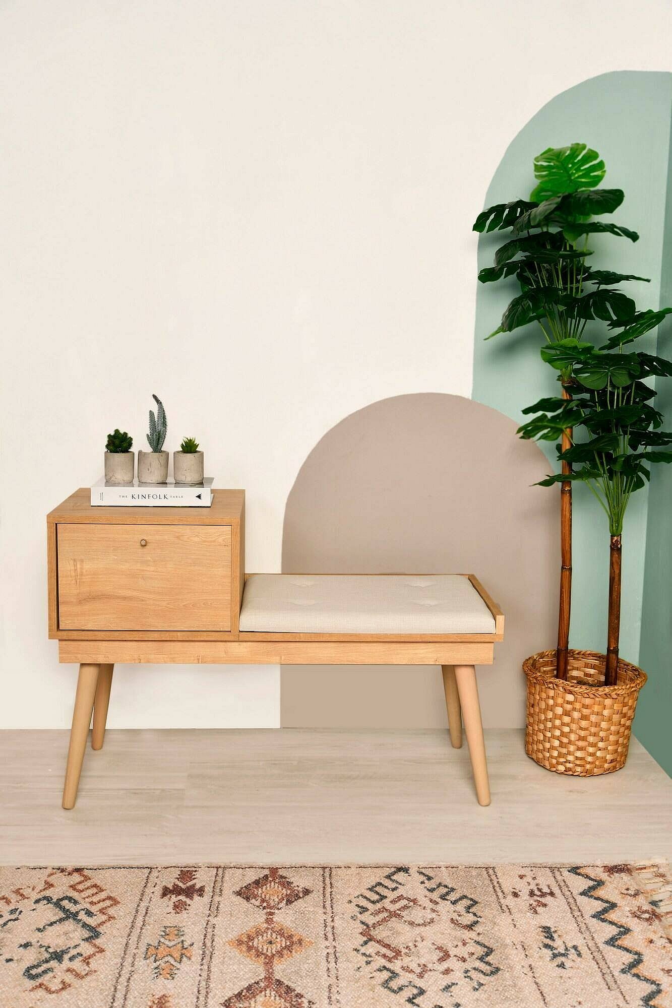 BANC - Banc polyvalent, Sièges pour les invités, Coffre multifonctionnel, 40x105h45 cm, Chêne et Crème. STRUCTURE ET UTILISATION - Banc pouvant être utilisé comme tapis de chevet moderne et élégant, entièrement rembourré et recouvert de tissu doux - Banc d'intérieur parfait pour compléter l'ameublement de votre chambre, entrée, couloir, hall ou chambre d'hôtel - Ce pouf repose-pieds est un accessoire d'ameublement indispensable, excellent pour meubler votre appartement avec style. QUALITÉ ET DESIGN - Meuble au design moderne et élégant, parfait pour meubler un environnement contemporain et lumineux - Idéal pour ceux qui recherchent des solutions fonctionnelles et peu encombrantes, ce produit est parfait pour les maisons et les appartements de toutes tailles - Garantie de deux ans à compter de la date d'achat. CARACTÉRISTIQUES TECHNIQUES - Accessoire d'ameublement polyvalent, conçu pour une intégration facile avec d'autres meubles - Emballage résistant, conçu pour le commerce électronique - Matériau: Bois massif 18 mm, Lin - Informations supplémentaires: Ouverture du clapet - Fermeture standard - Démontage - Finition mate. DIMENSIONS EN CM - Banc : Longueur: 40 Largeur: 105 Hauteur: 45