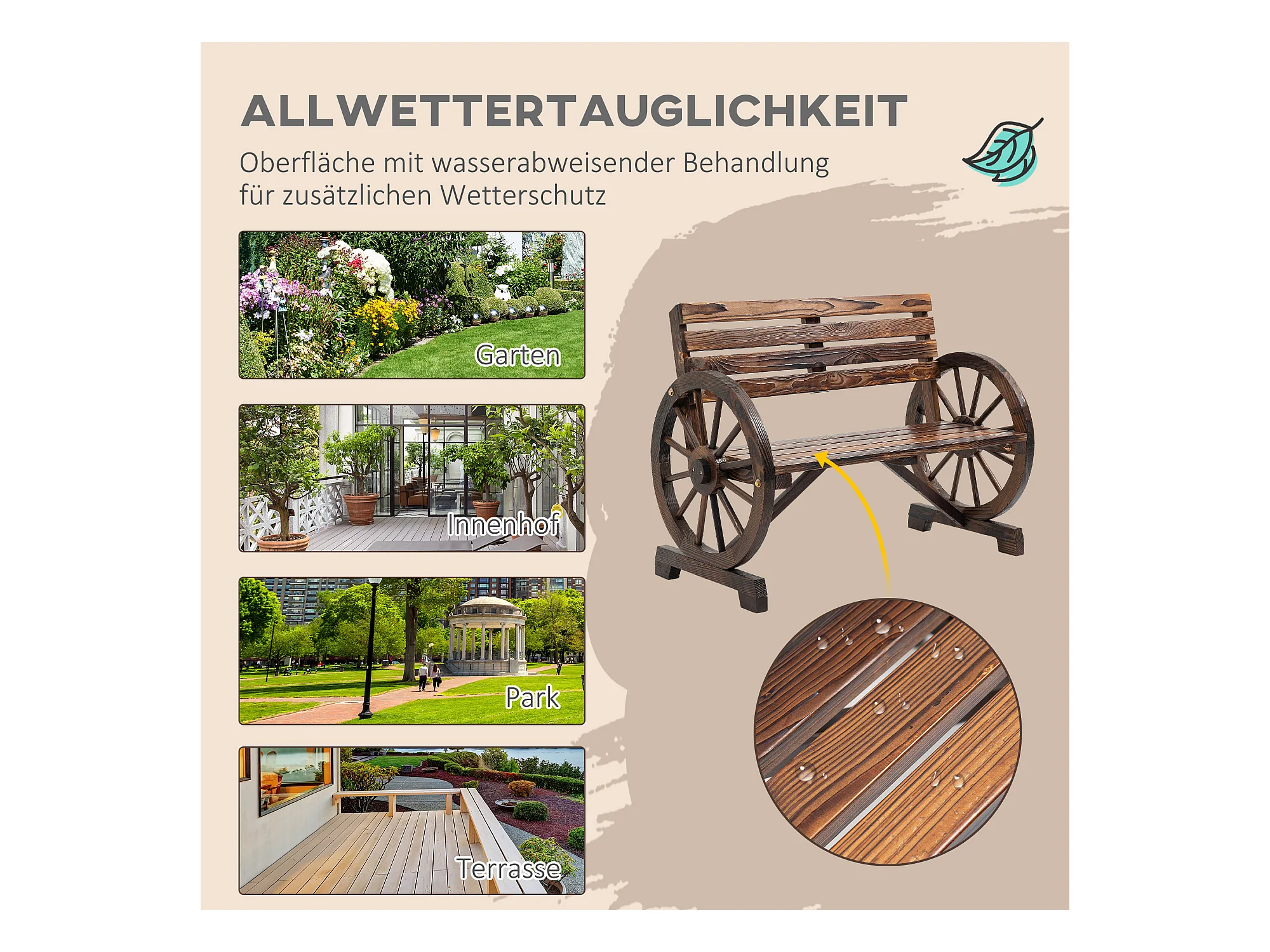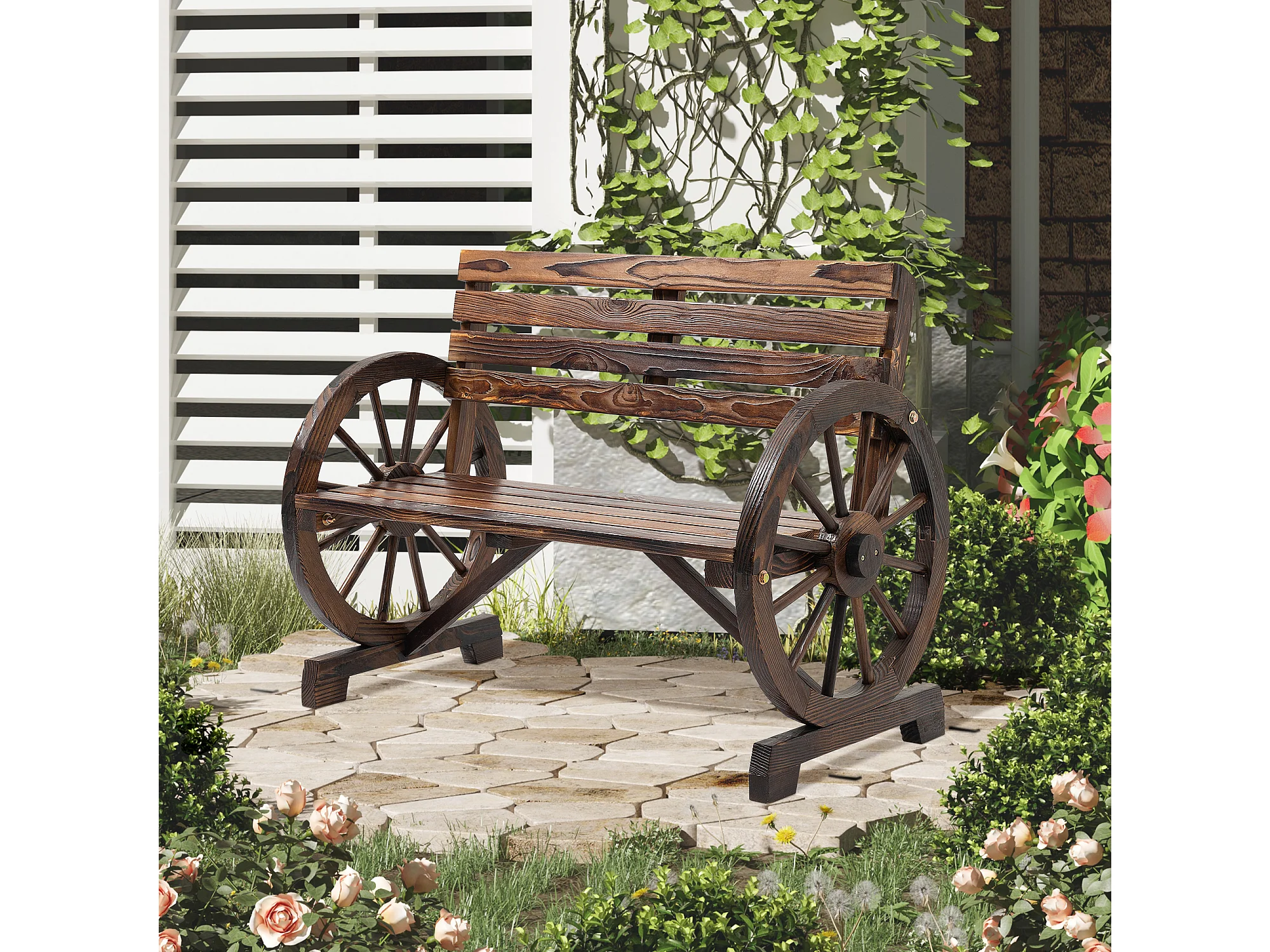Banc de jardin 2 places avec accoudoirs en roue de chariot, style campagne, bois de sapin, marron (105.5x56x79cm)