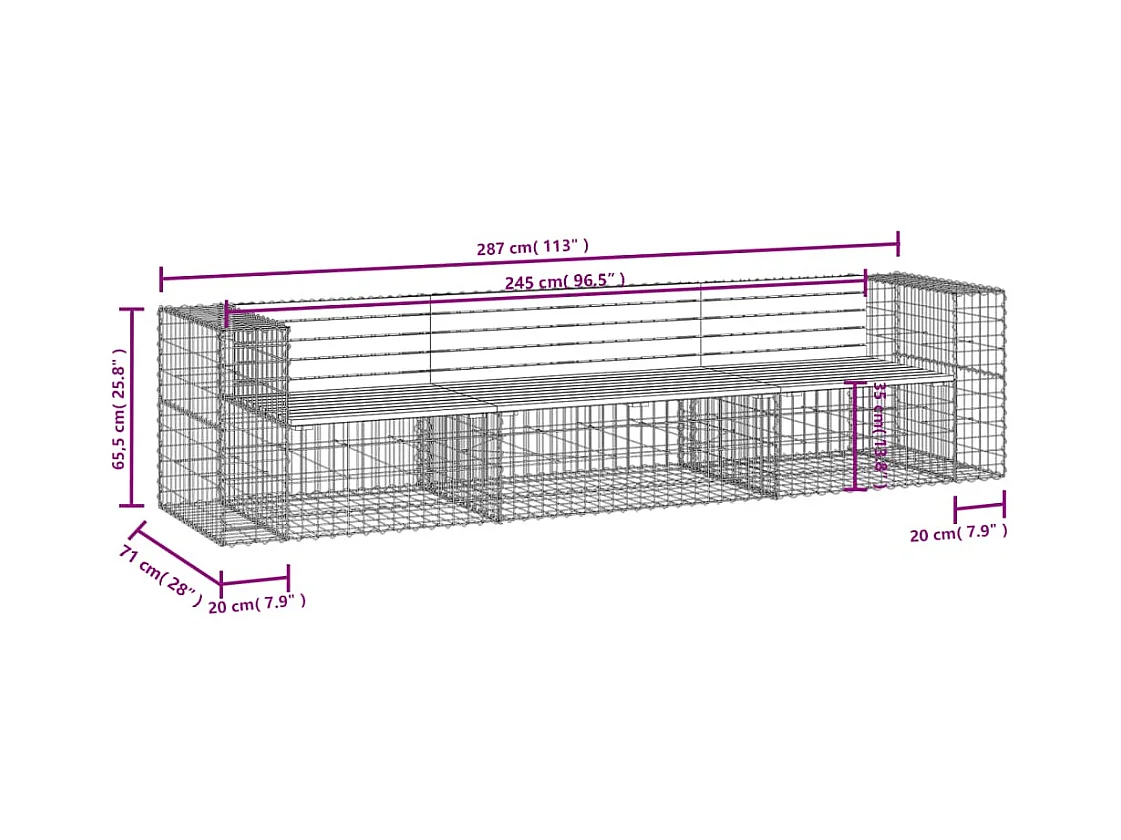 Banc de jardin design gabion 287x71x65,5cm bois de pin imprégné