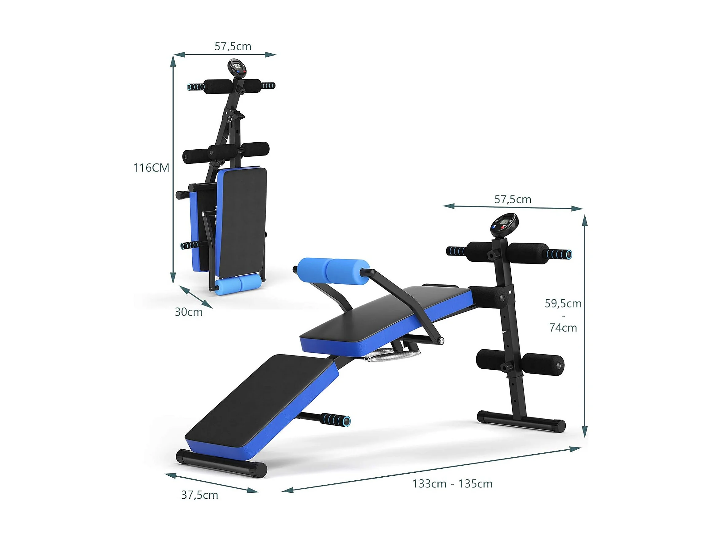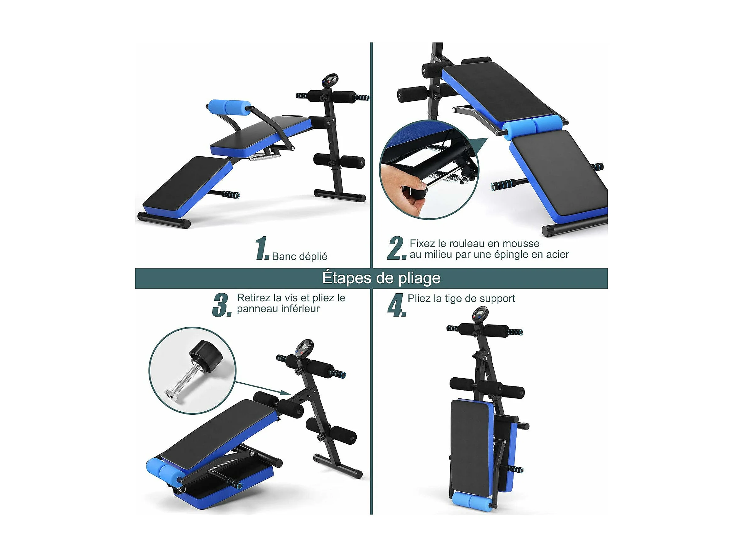 Banc de Musculation Pliable Abdos et Sit-up avec 5 Rouleaux de Mousse Charge 200KG pour Maison,Salle de Sport et Bureau, Bleu