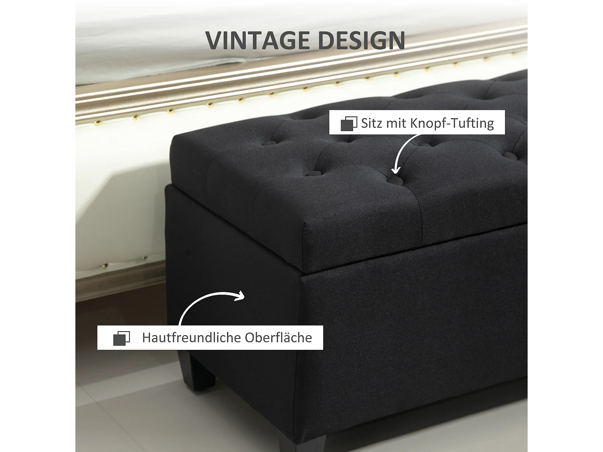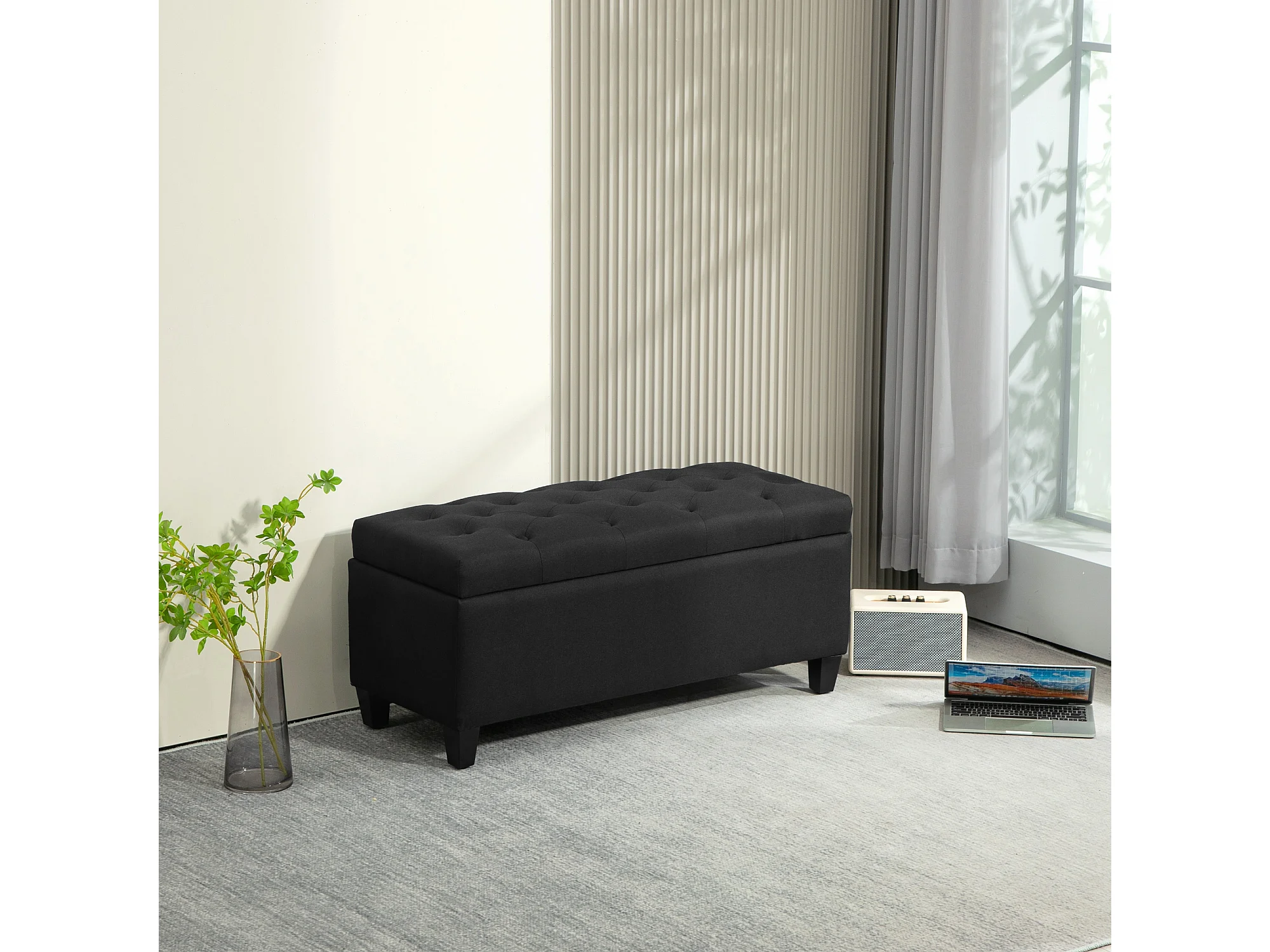 Banc de rangement avec coffre, tissu polyester effet lin, pieds en bois caoutchouc, noir (100x40x44cm)