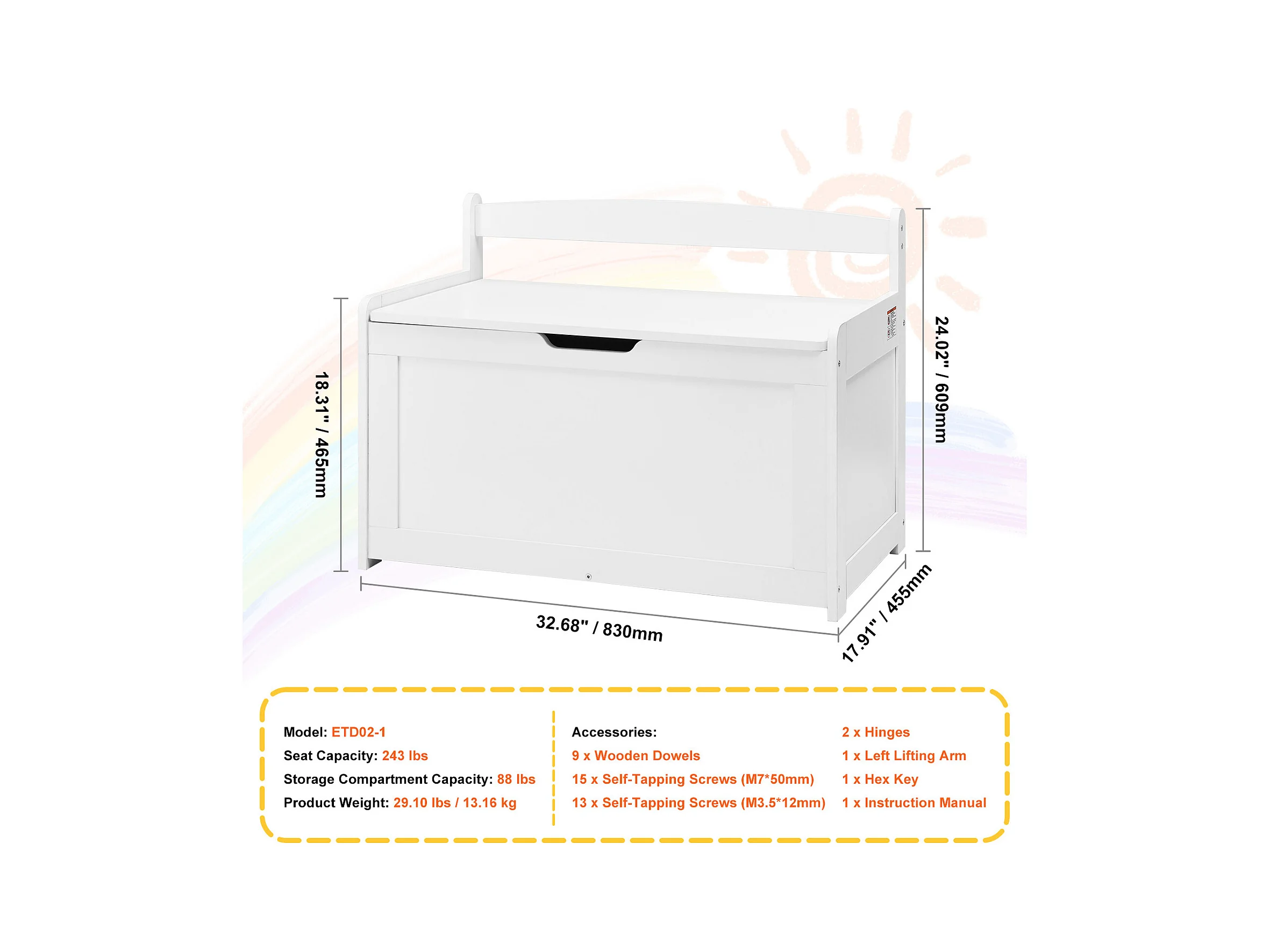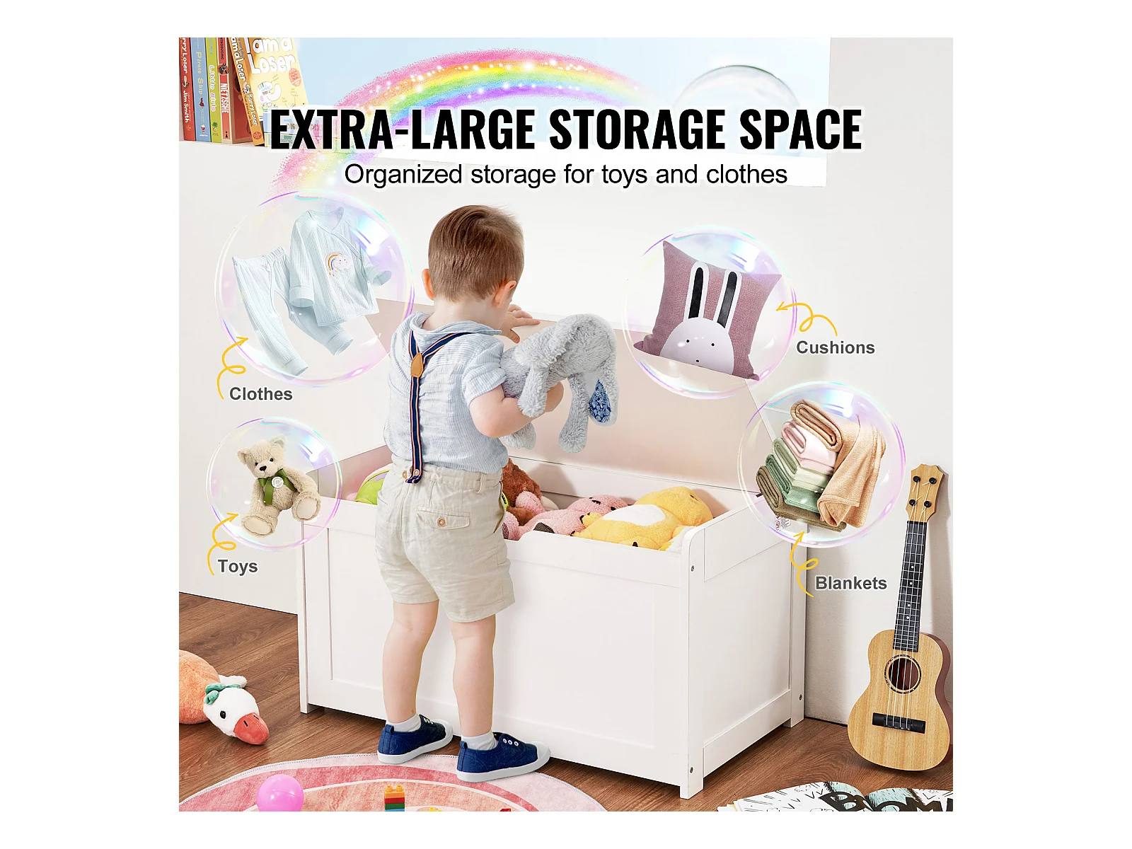 Banc de Rangement SucceBuy pour Jouets pour Enfants Coffre à Jouets en Bois 83x45,5x60,9 cm Blanc
