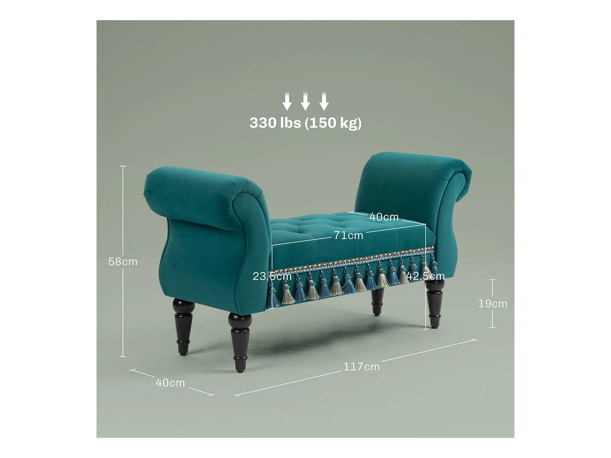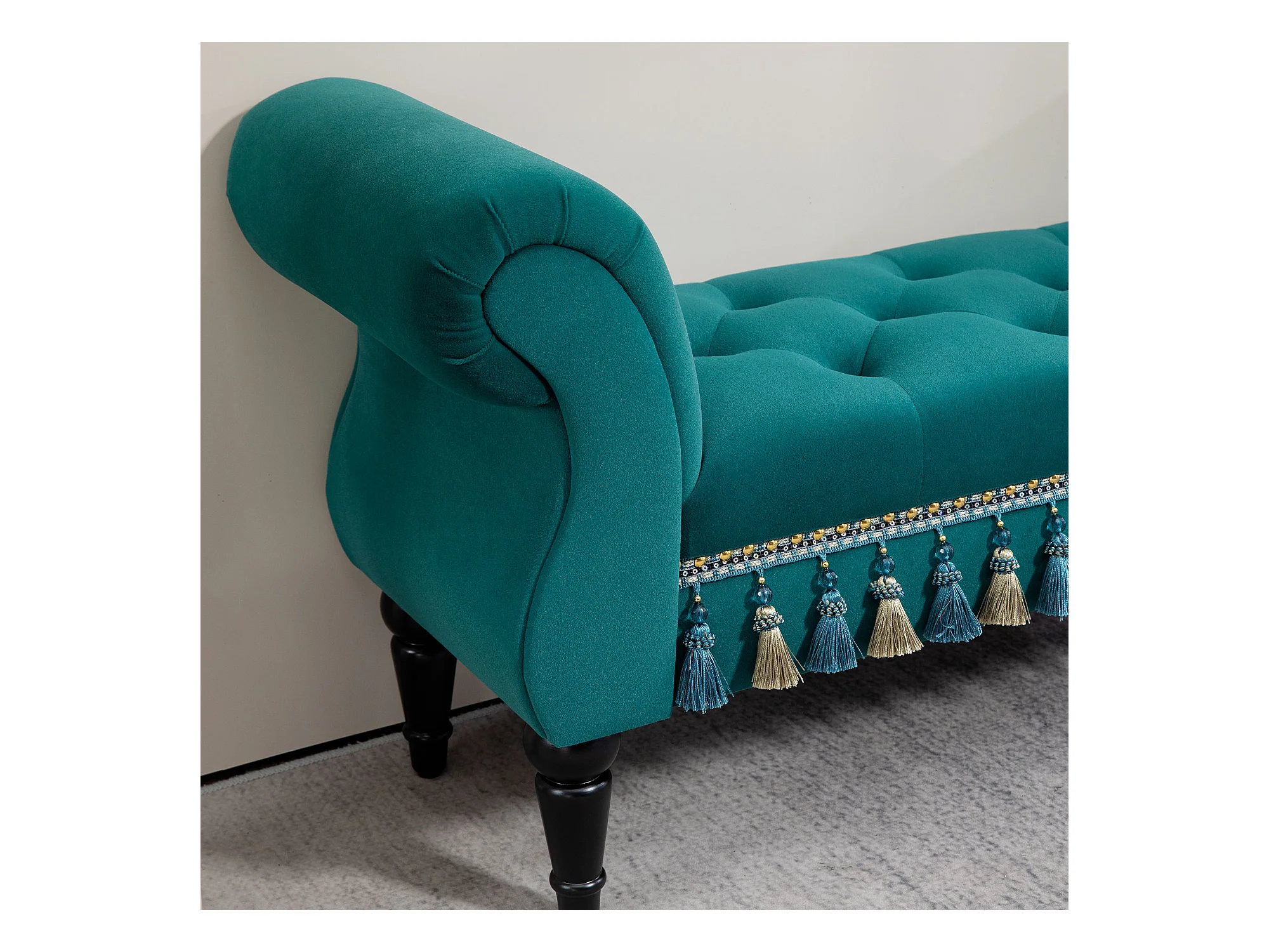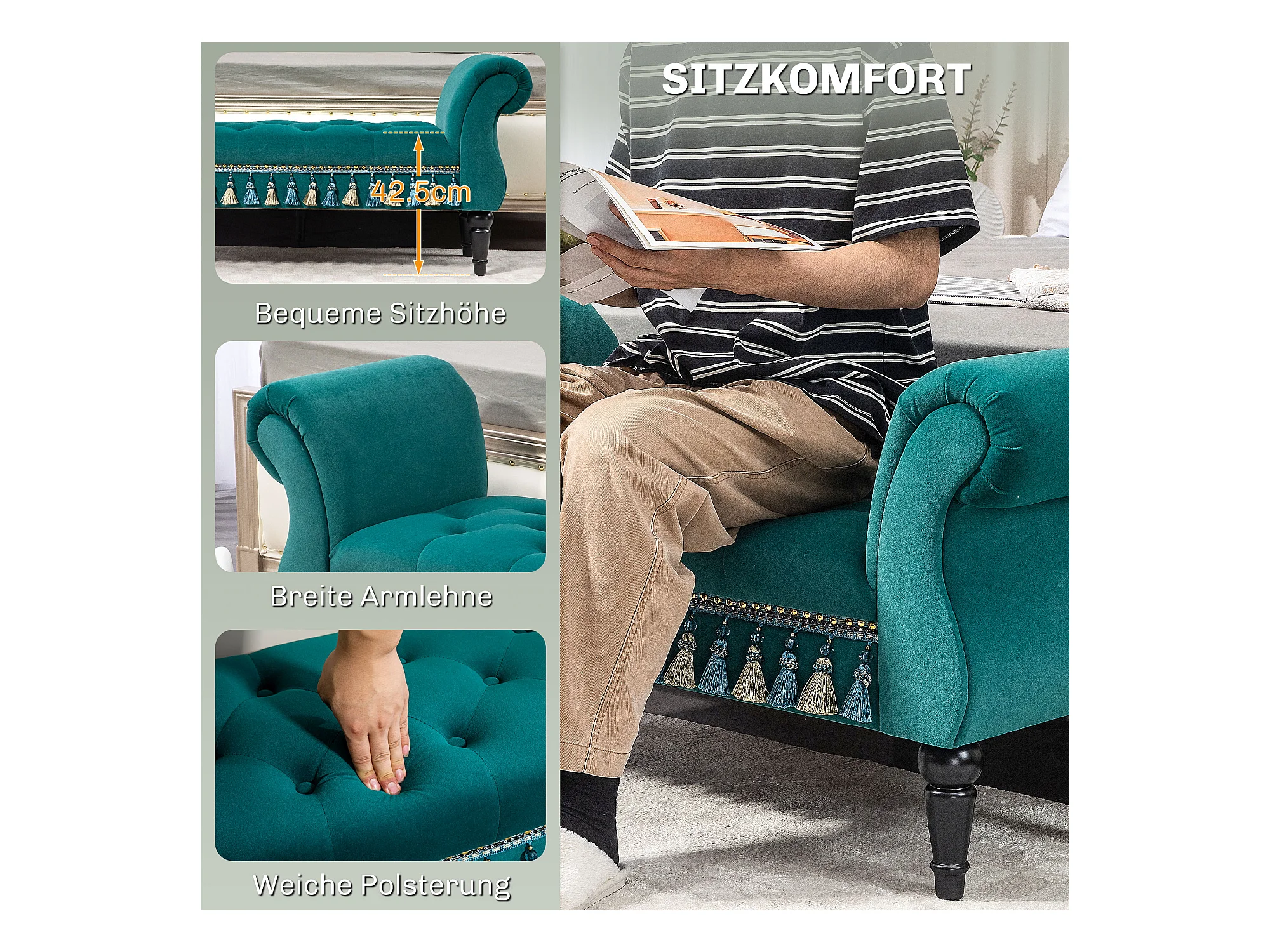 Banc de salon avec rembourrage en velours, design vintage, cadre en bois, vert (117x40x58 cm)