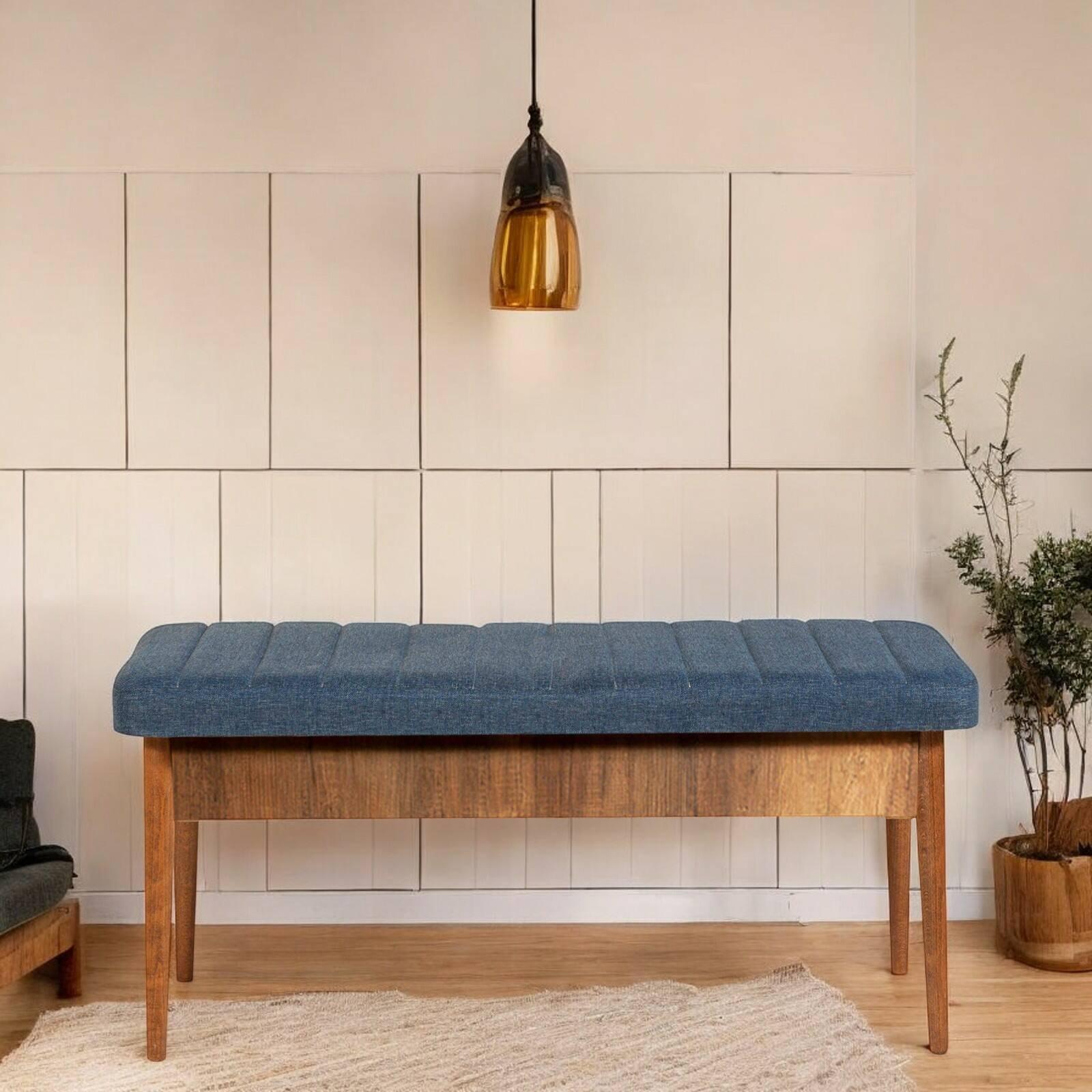 BANC - Banc polyvalent, Sièges pour les invités, Coffre multifonctionnel, 110x40 h48 cm, Noyer et bleu. STRUCTURE ET UTILISATION - Banc pouvant être utilisé comme tapis de chevet moderne et élégant, entièrement rembourré et recouvert de tissu doux - Banc d'intérieur parfait pour compléter l'ameublement de votre chambre, entrée, couloir, hall ou chambre d'hôtel - Ce pouf repose-pieds est un accessoire d'ameublement indispensable, excellent pour meubler votre appartement avec style. QUALITÉ ET DESIGN - Meuble au design moderne et élégant, parfait pour meubler un environnement contemporain et lumineux - Idéal pour ceux qui recherchent des solutions fonctionnelles et peu encombrantes, ce produit est parfait pour les maisons et les appartements de toutes tailles - Garantie de deux ans à compter de la date d'achat. CARACTÉRISTIQUES TECHNIQUES - Accessoire d'ameublement polyvalent, conçu pour une intégration facile avec d'autres meubles - Emballage résistant, conçu pour le commerce électronique - Matériau: Panneau de particules mélaminé 18mm - Informations supplémentaires: Composition tissu : 100% lin - Pieds en charme - Produit livré démonté. DIMENSIONS EN CM - Banc : Longueur: 110 Largeur: 40 Hauteur: 48 - Dimensions supplémentaires: Hauteur d'assise : 48 cm
