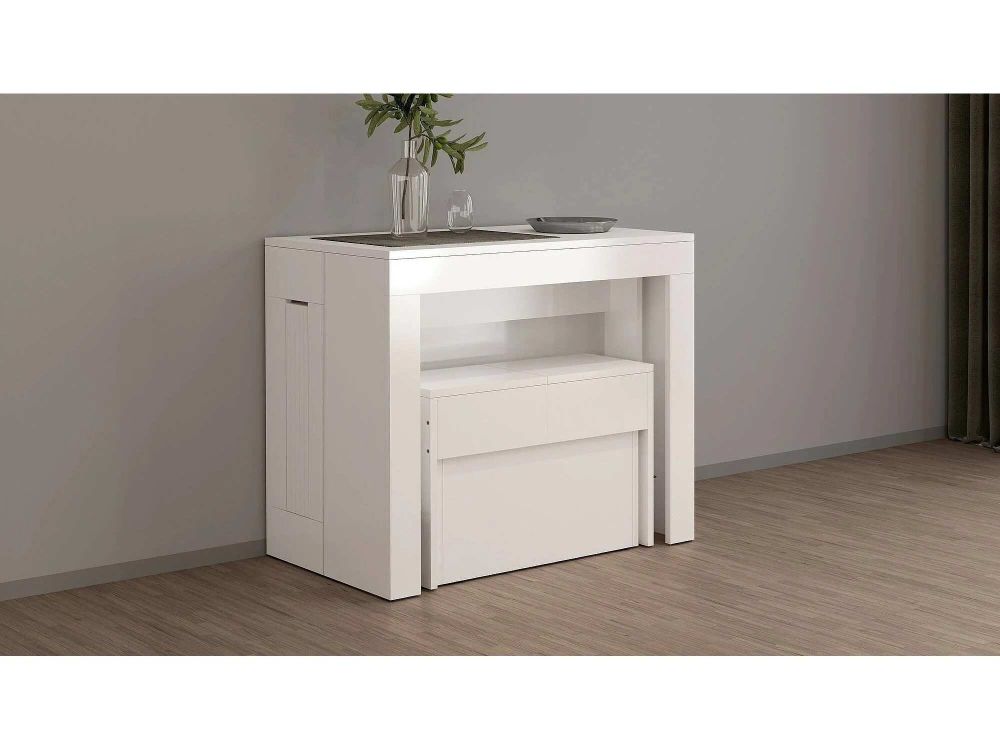 Banc Dollocol, Siège pour table à manger, Banc simple extensible, 290x25h45 cm, Blanc brillant