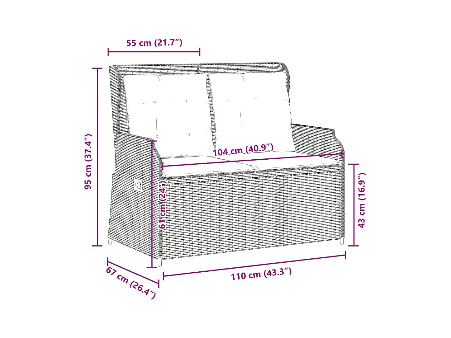 Banc inclinable de jardin avec coussins noir résine tressée
