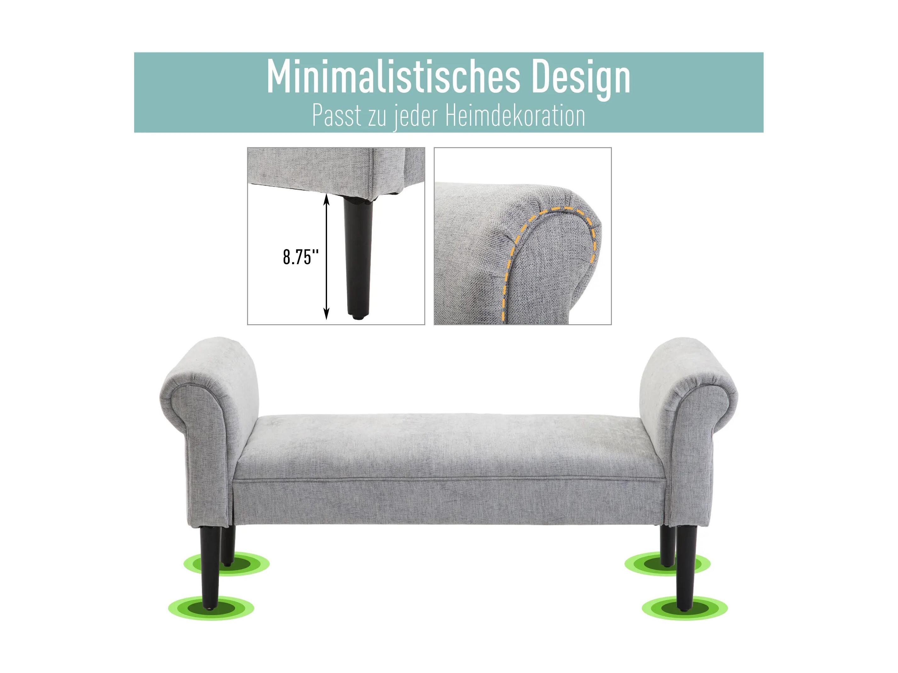 Banc rembourré élégant avec accoudoirs roulés, polyester, gris clair (132x45.5x58cm)