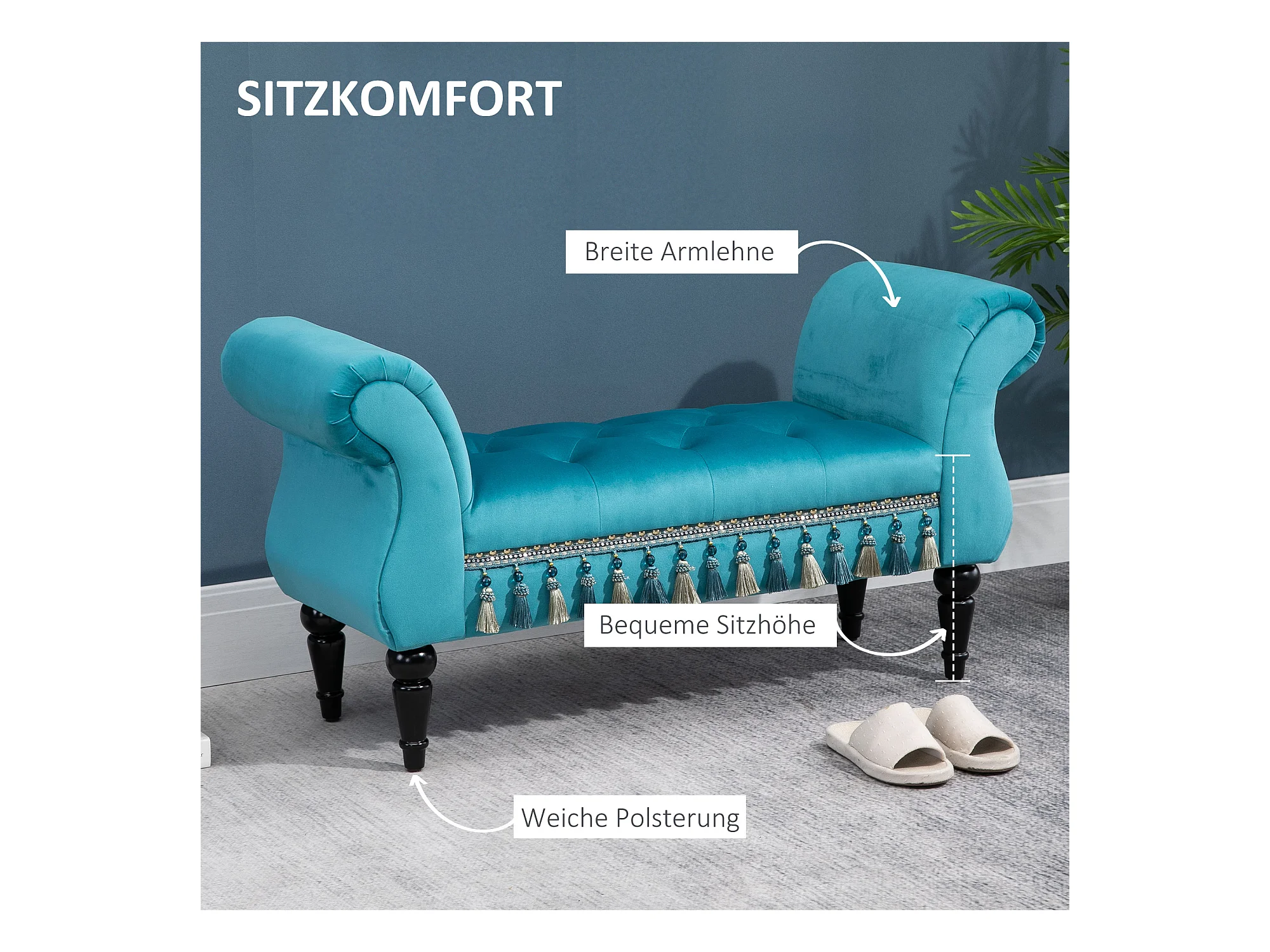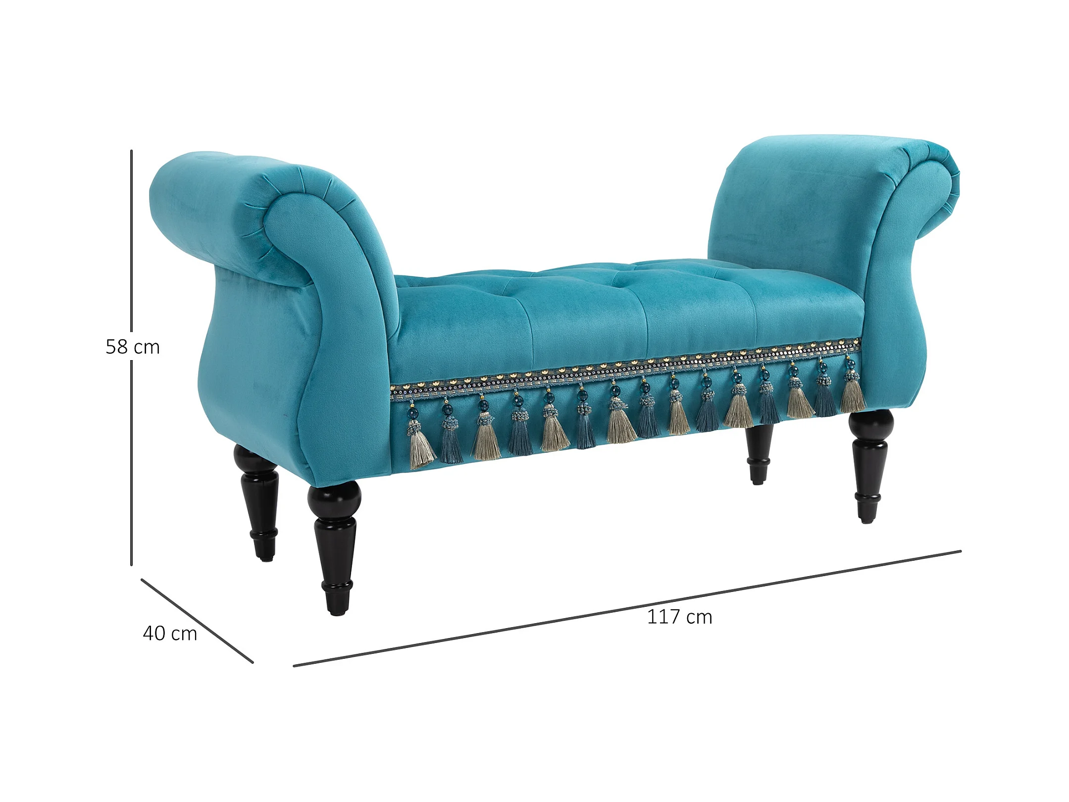 Banc rembourré luxueux, design vintage, polyester et caoutchouc, bleu (117x40x58 cm)