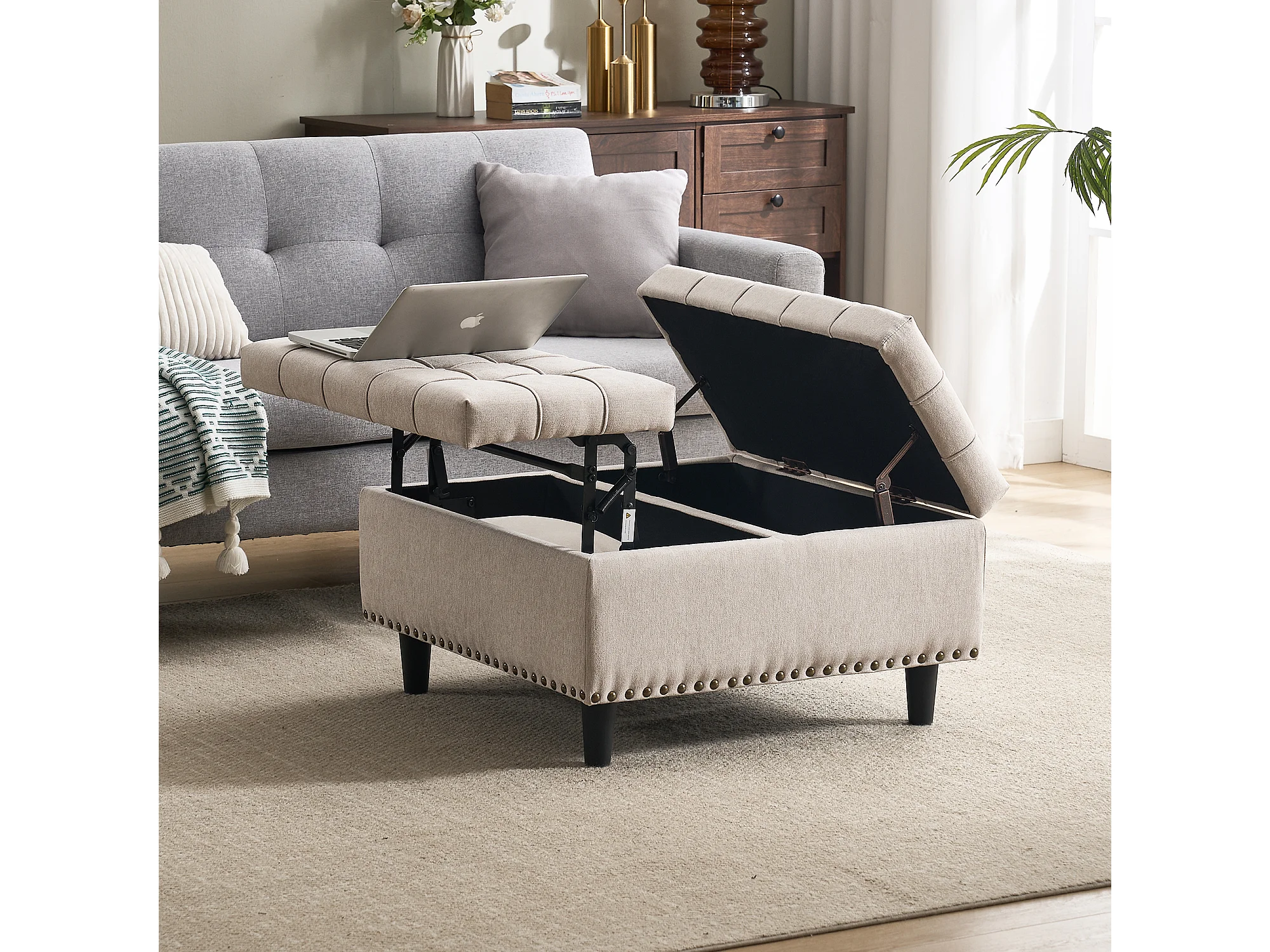 Banquette de rangement carrée, siège avec espace de stockage, tissu Lin et cadre en bois, beige (75x75x41 cm)