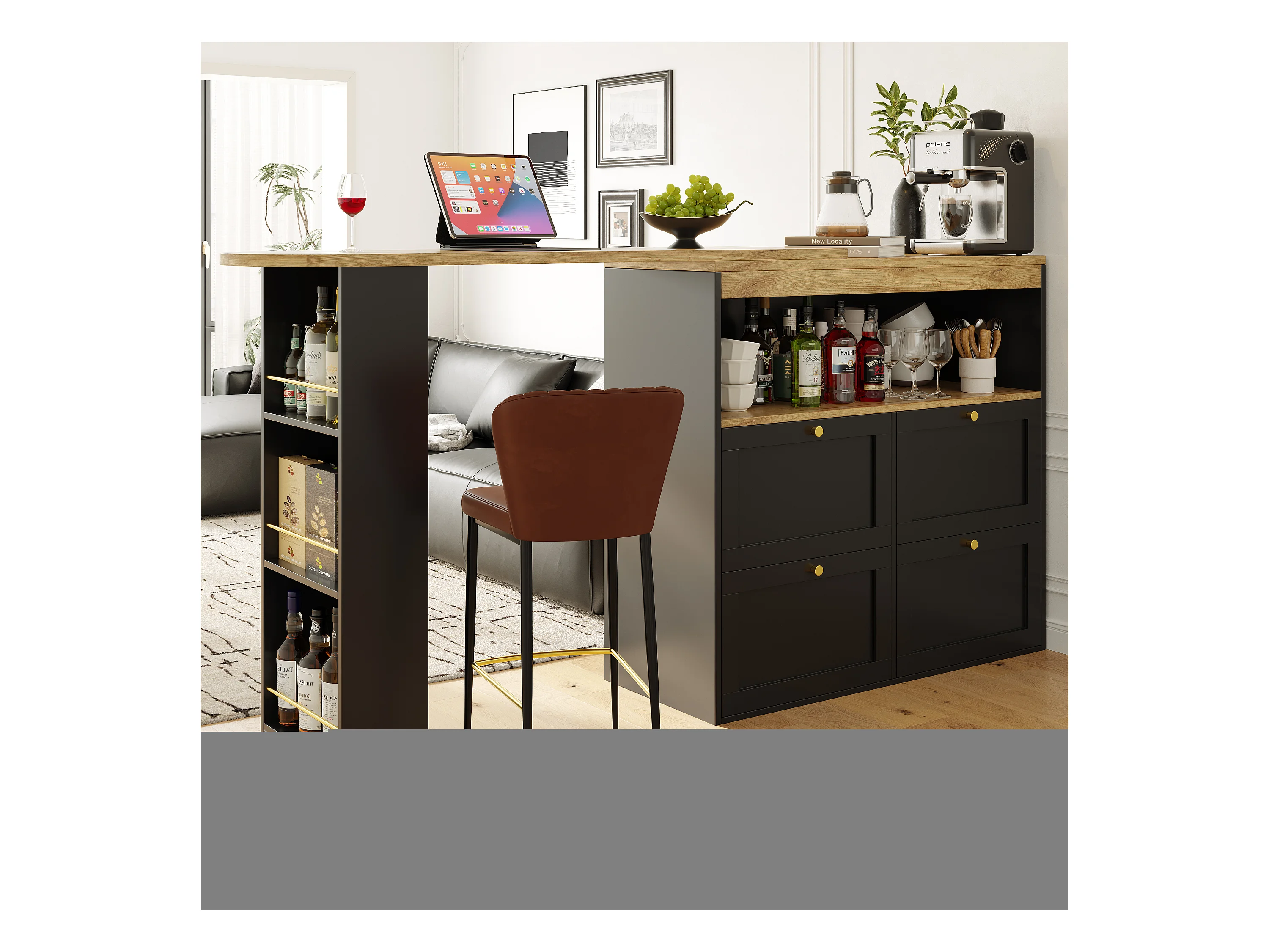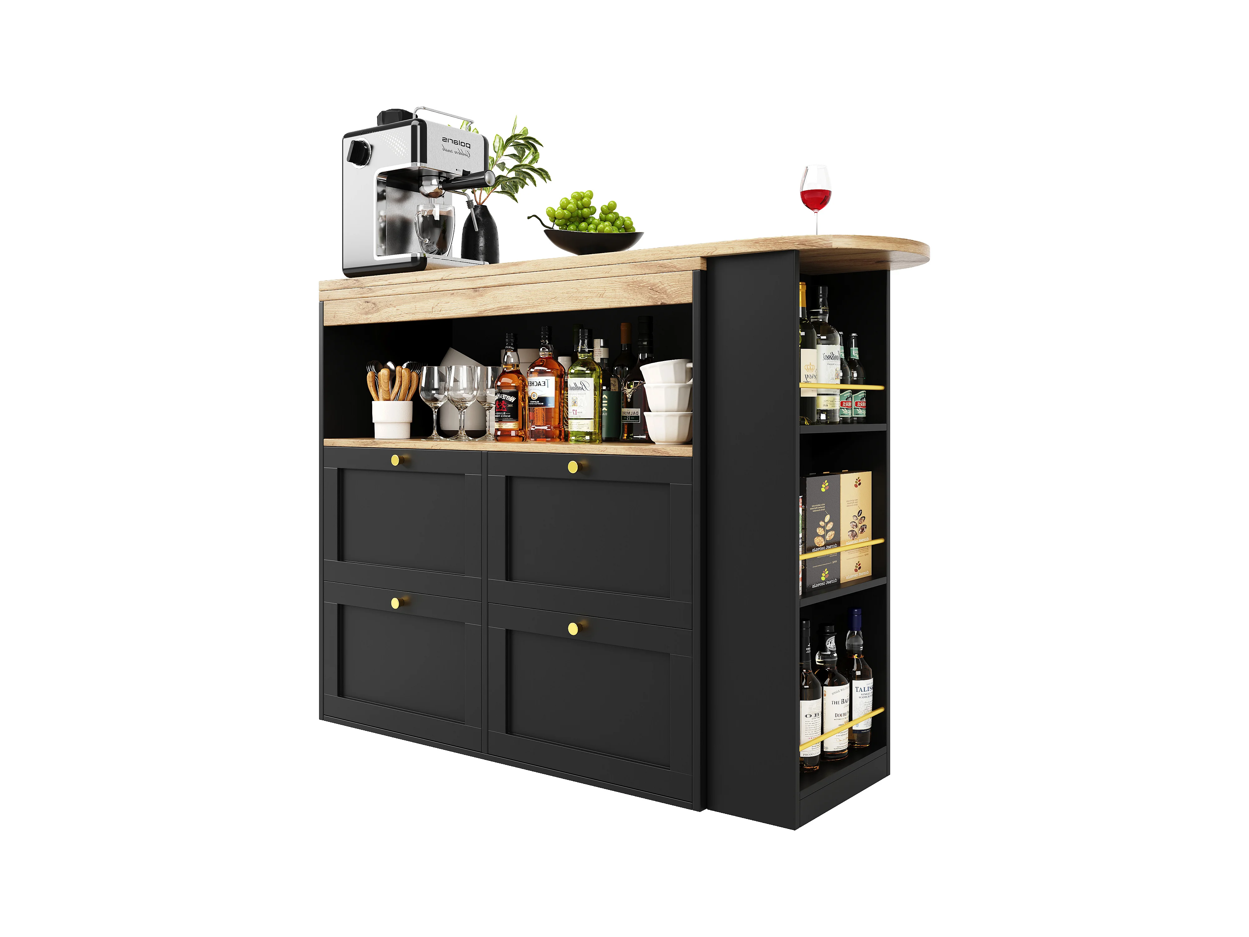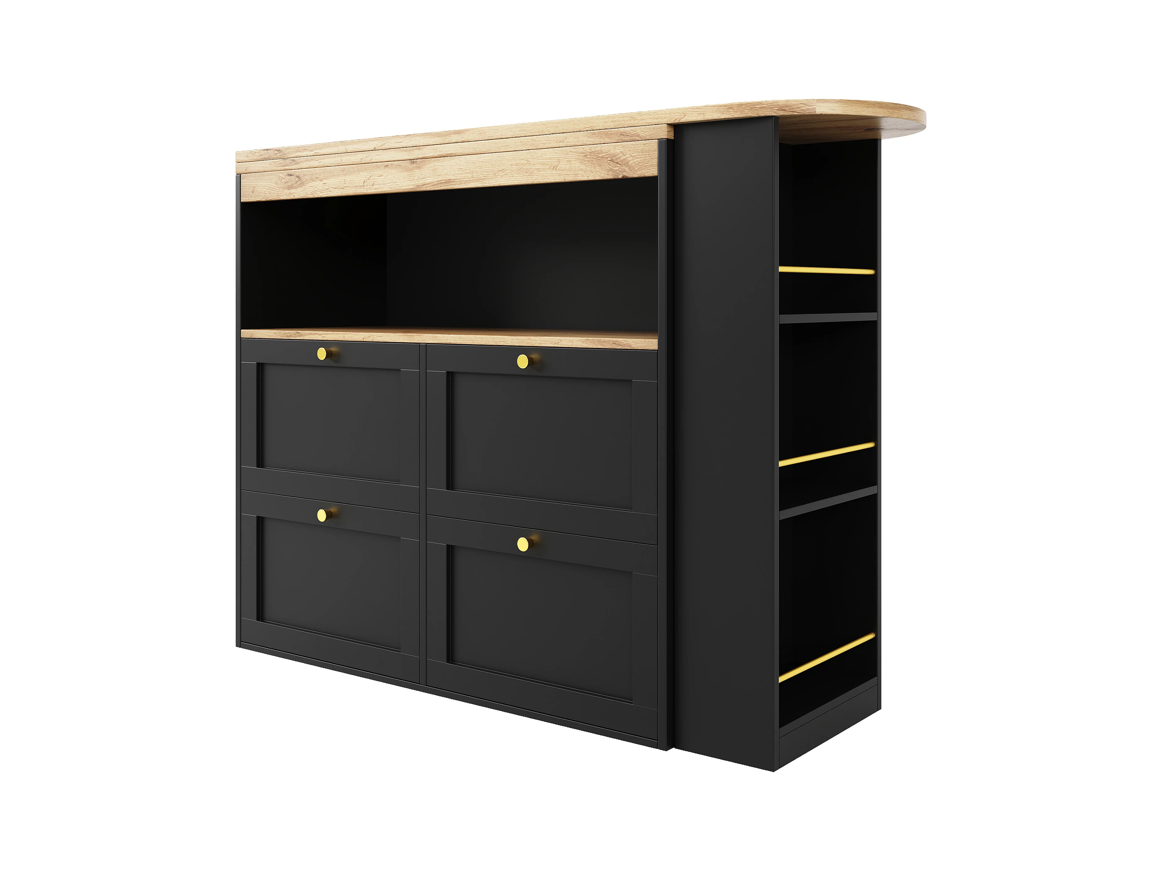 Bar à 360° pivotant, avec 4 tiroirs et étagères ouvertes, MDF noir, (105x39x102 cm)