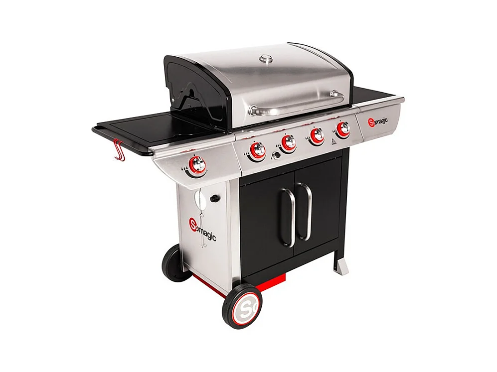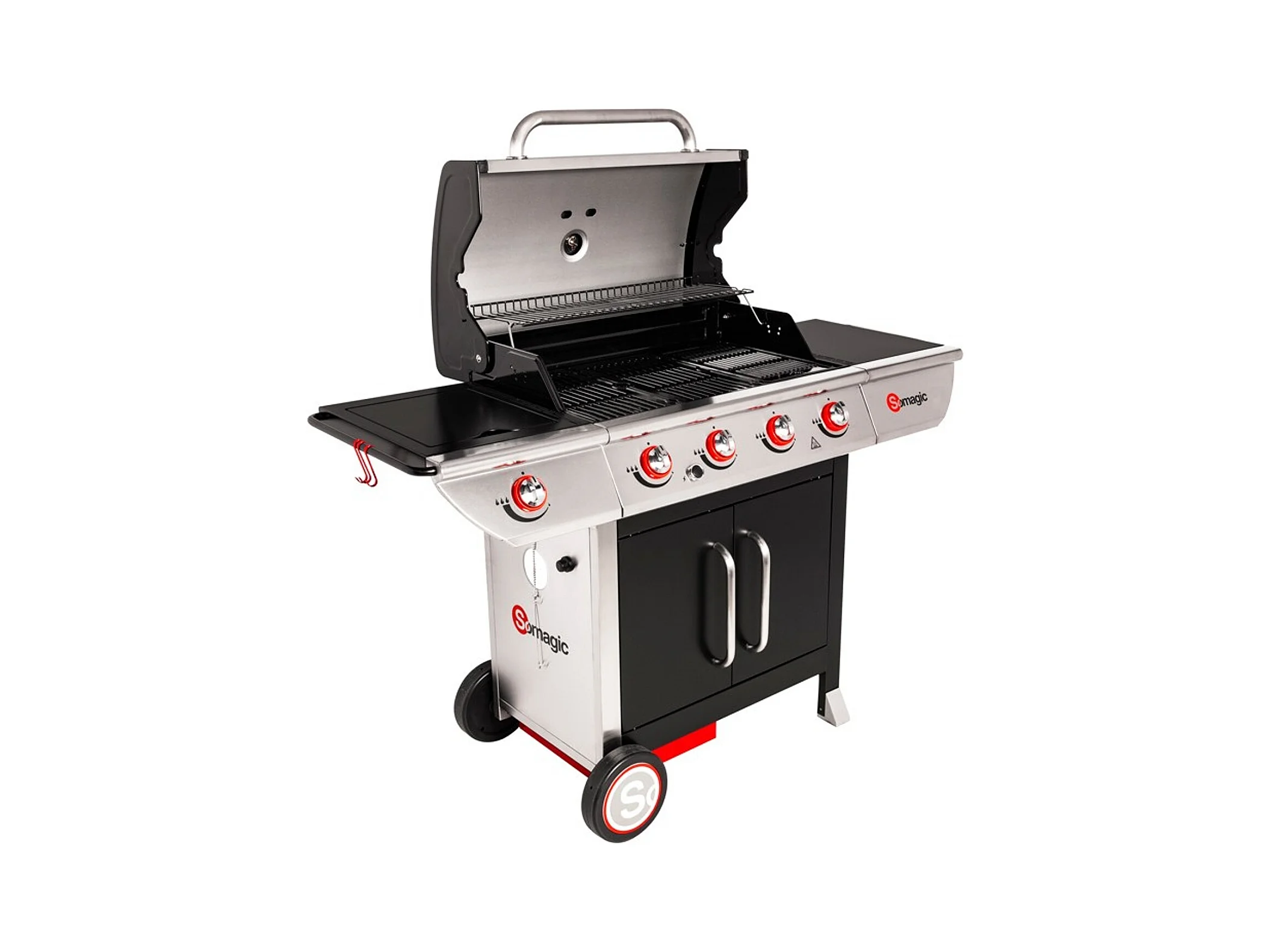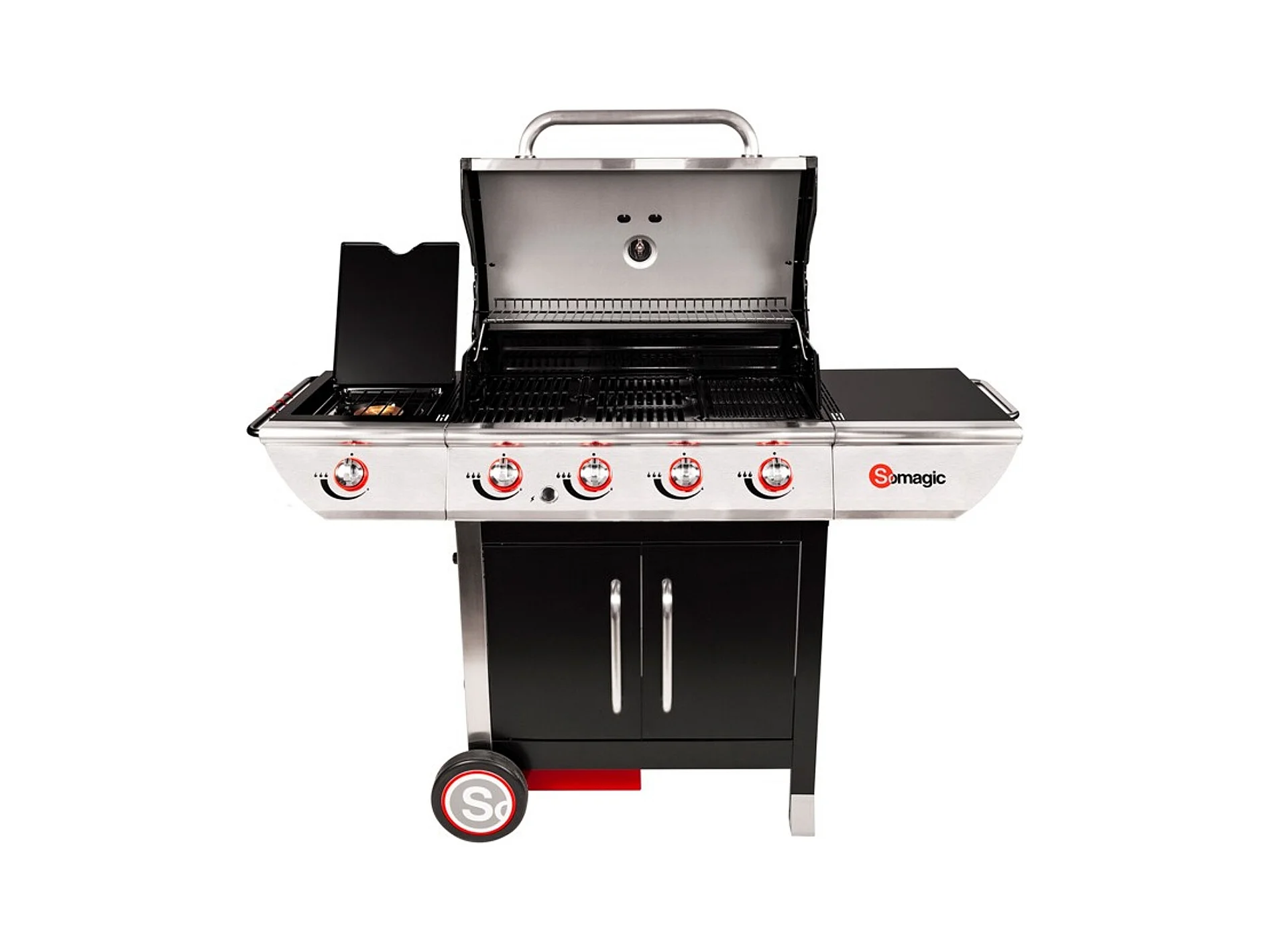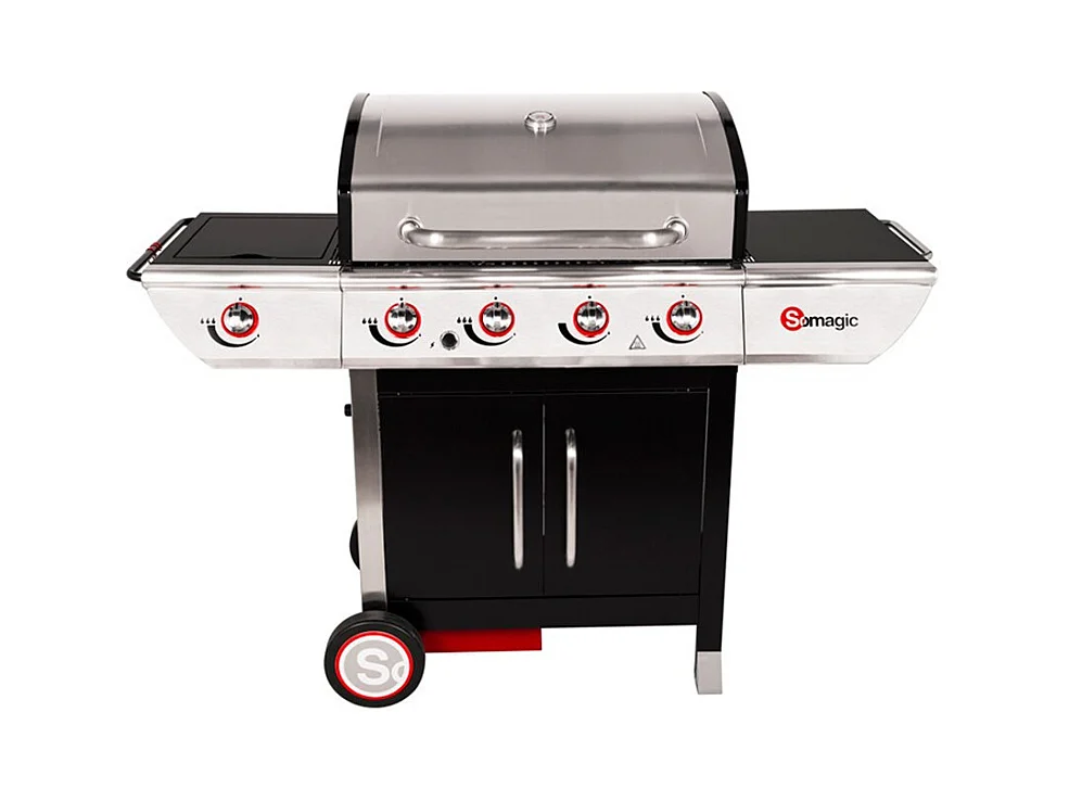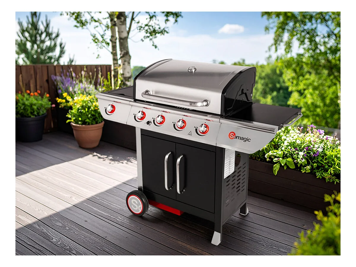 Barbecue à gaz avec chariot Manhattan 450GPI, 4 brûleurs, 1 réchaud latéral et plancha - Somagic