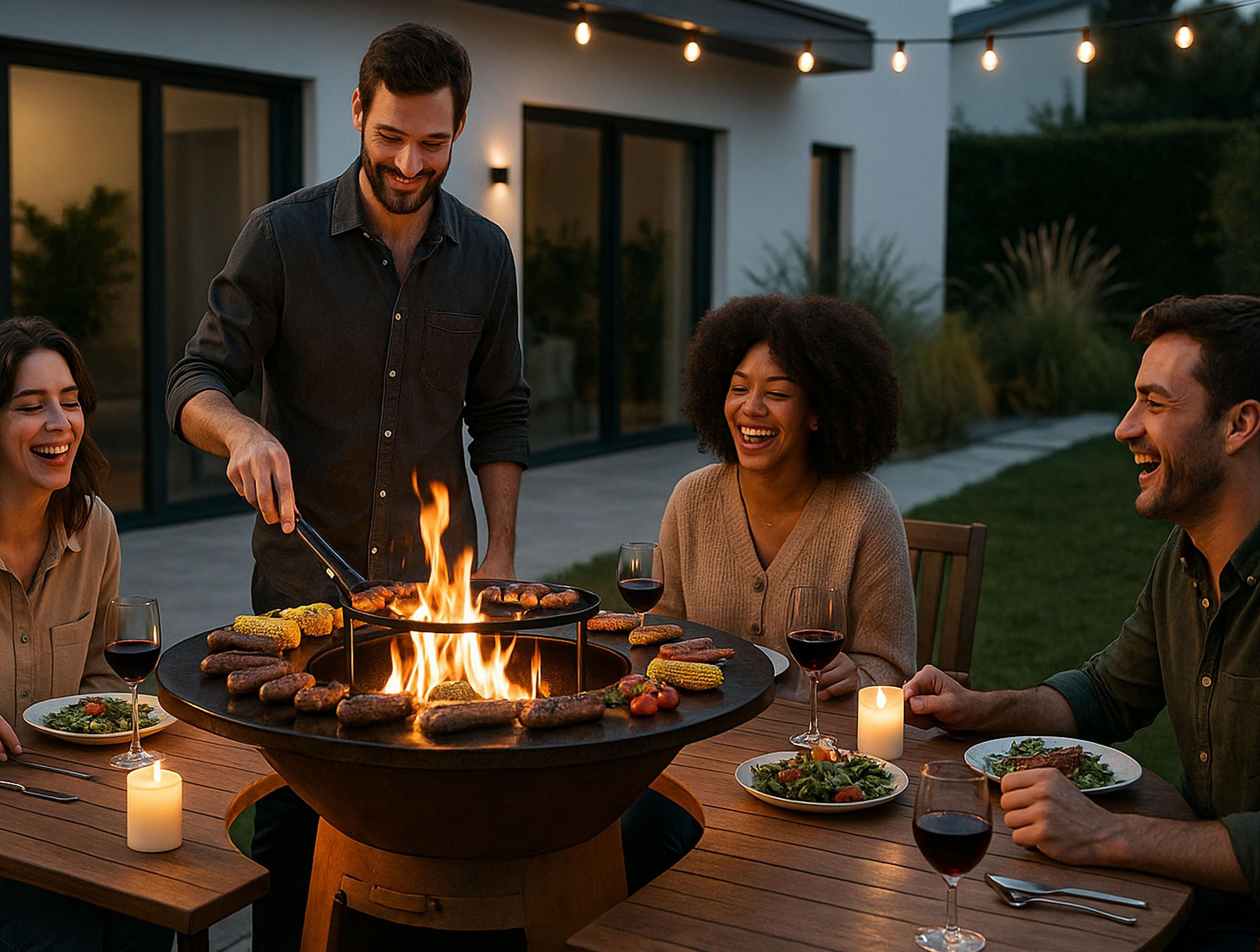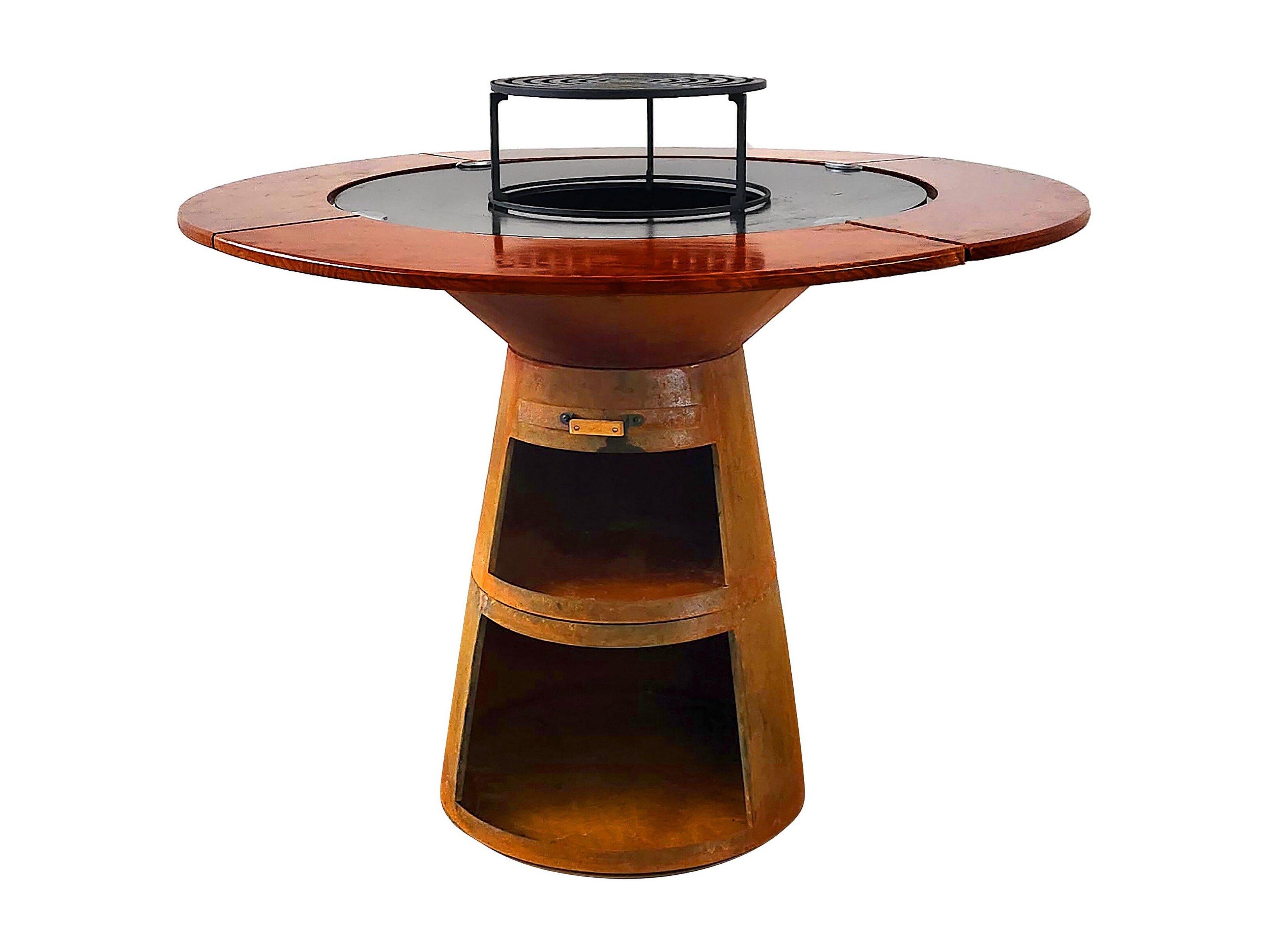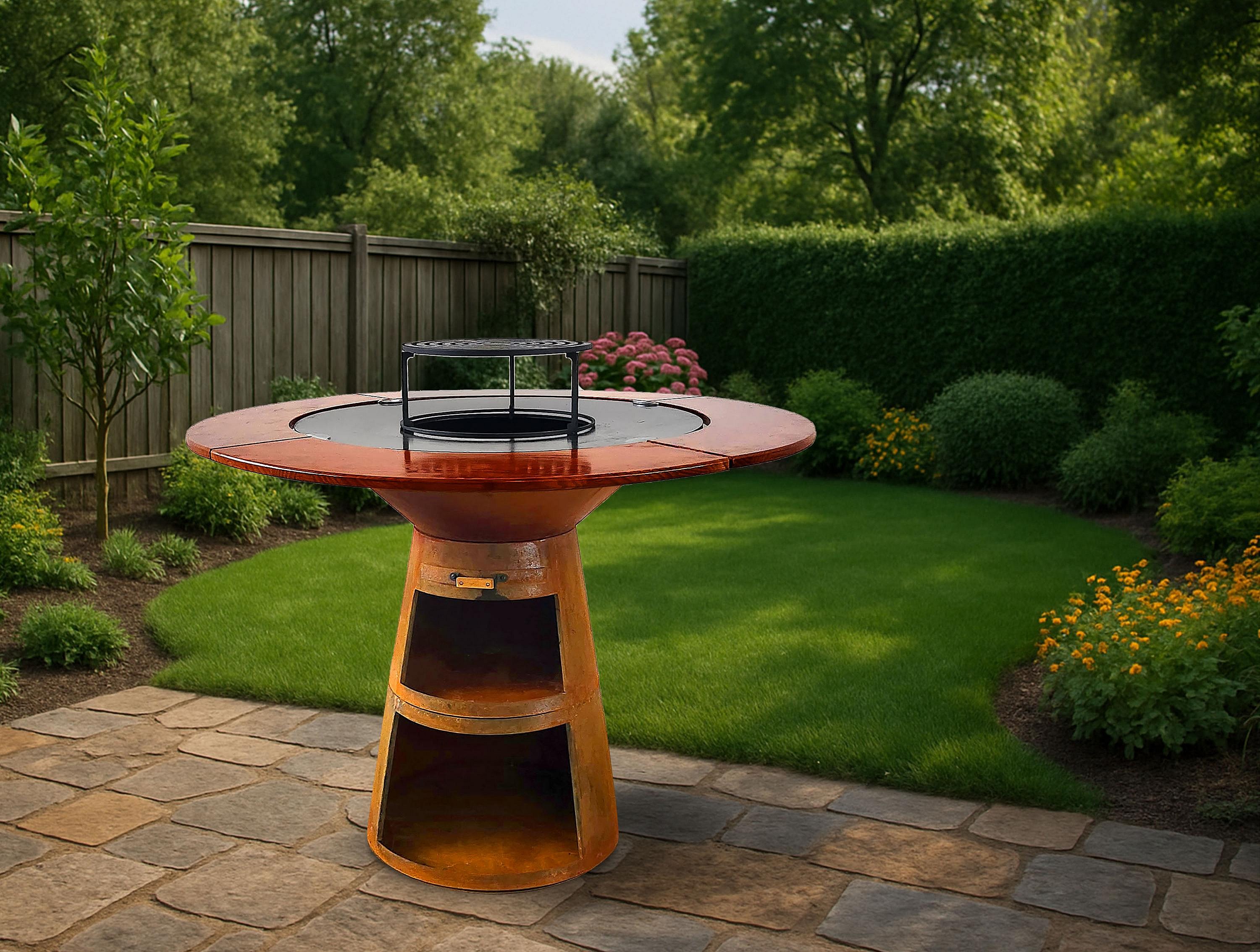 Barbecue rond avec plaque de cuisson et de gril en acier et planche en bois
