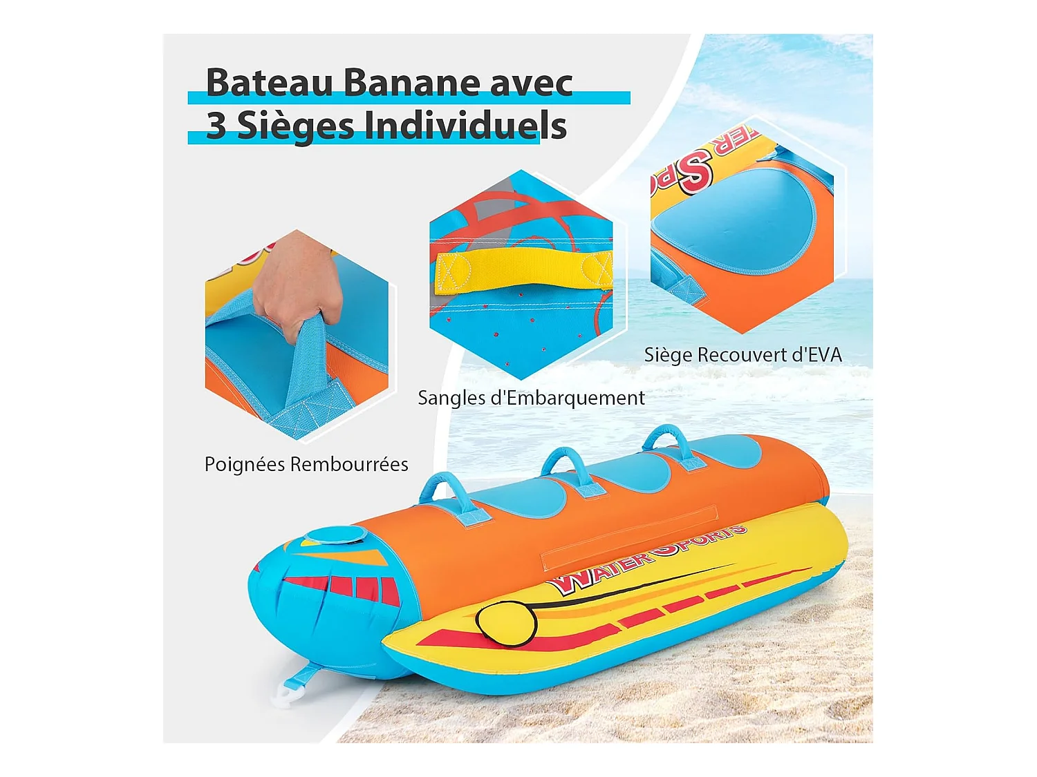Bateau Banane Gonflable pour 1 à 3 Passagers Charge 231KG, Flotteur Gonflable Remorquable avec 3 Sièges et Poignées Rembourrés en EVA, pour Navigation de Plaisance