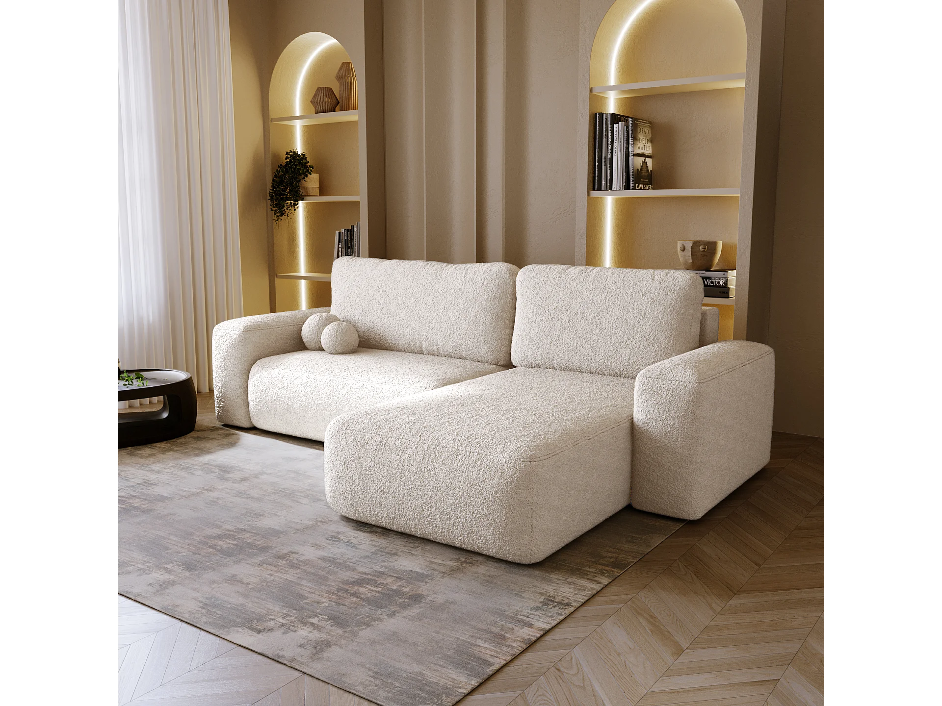 BESILIO Canapé d’angle droit convertible Ornello L – coussins ronds, fonction lit, méridienne en tissu bouclé – Beige