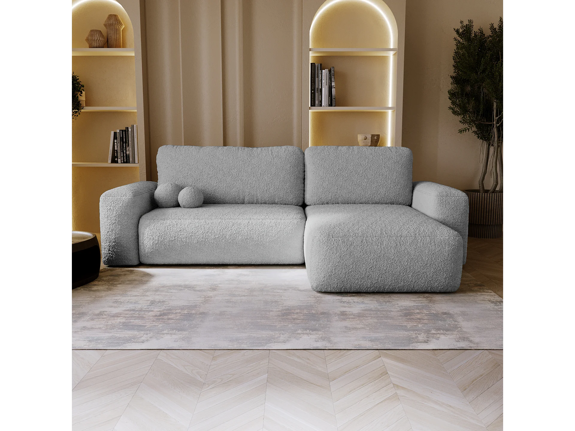 BESILIO Canapé d’angle droit convertible Ornello L – coussins ronds, fonction lit, méridienne en tissu bouclé – Gris clair