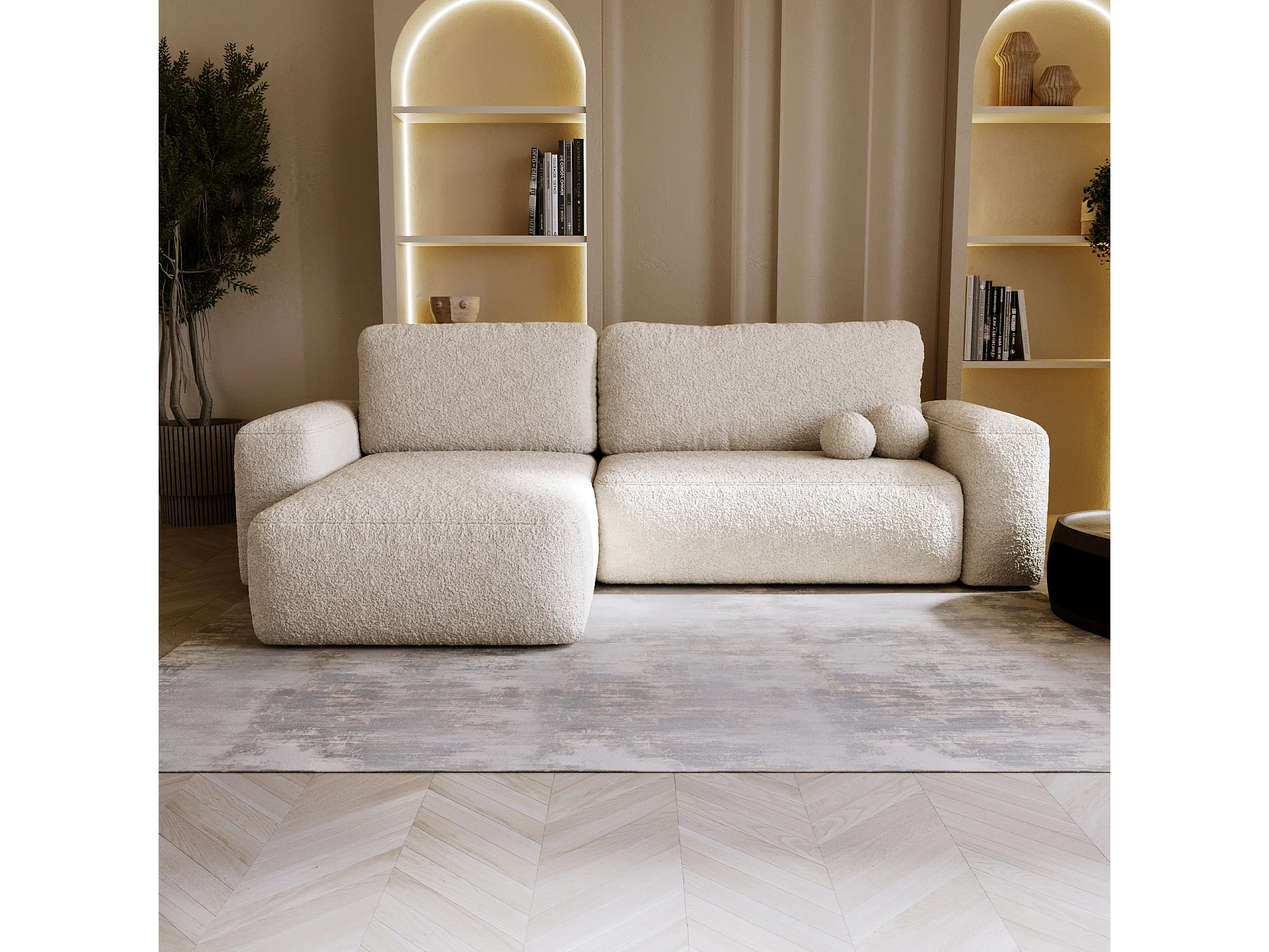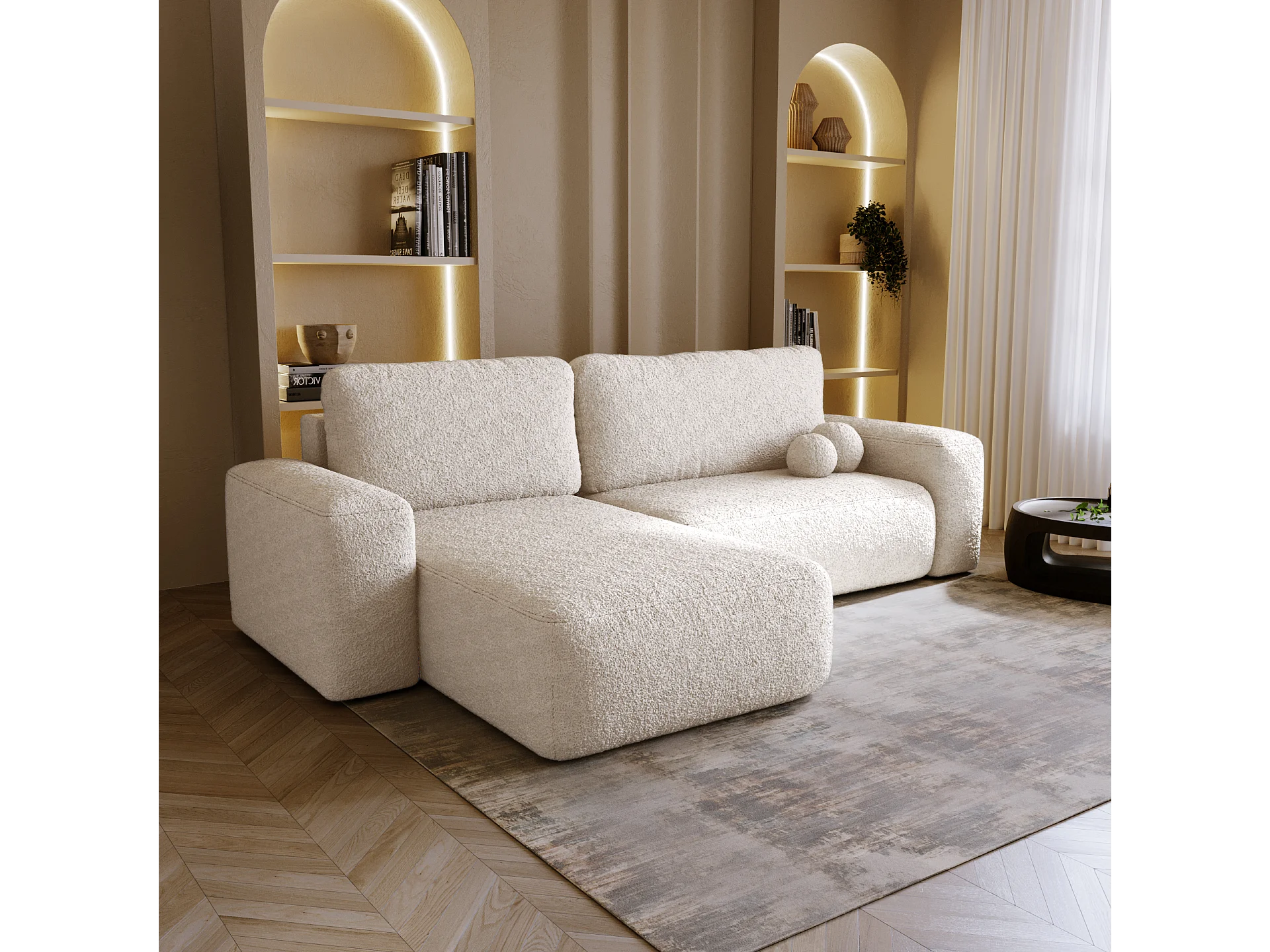 BESILIO Canapé d’angle gauche convertible Ornello L – coussins ronds, fonction lit, méridienne en tissu bouclé – Beige