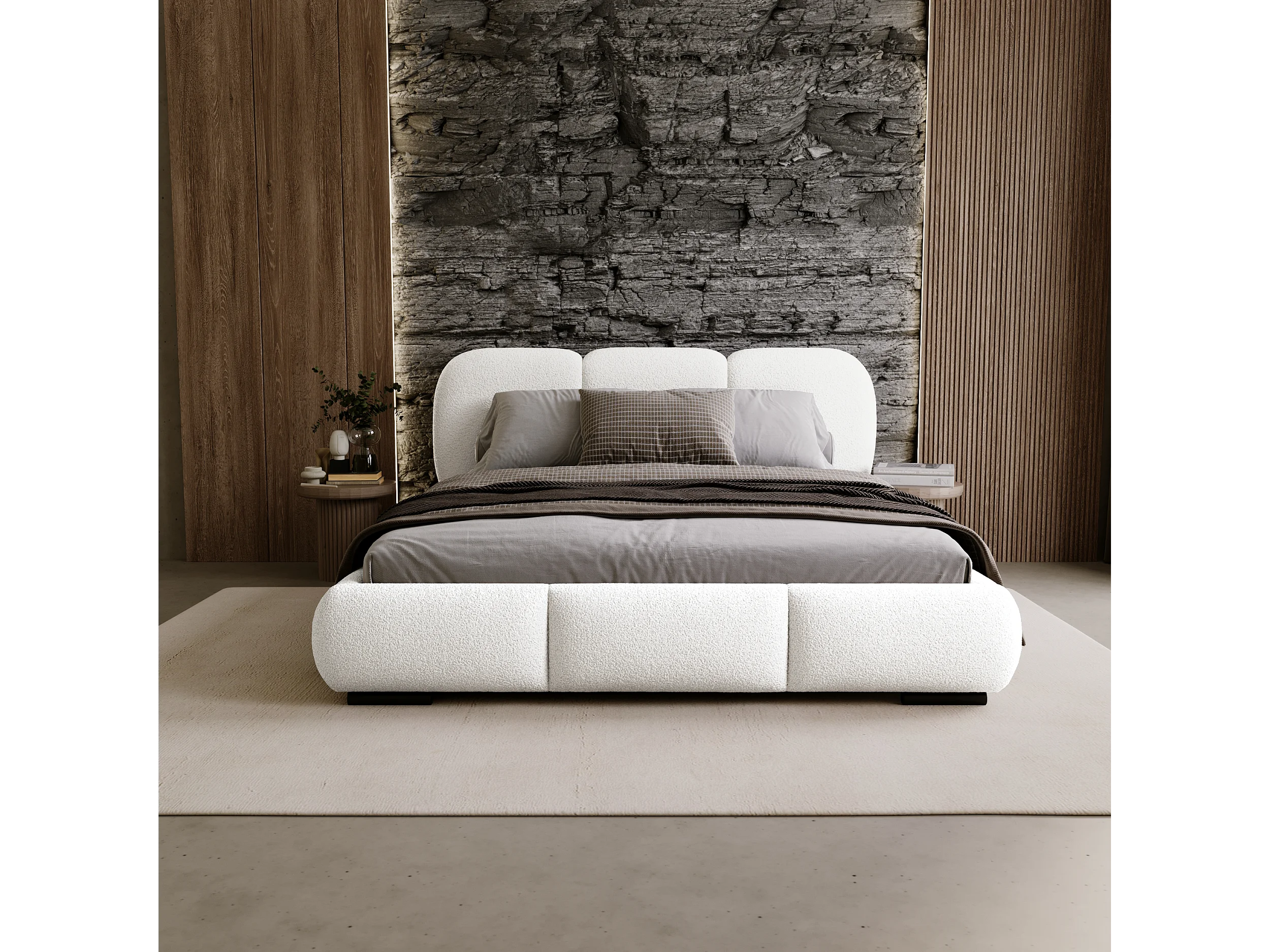 BESILIO Lit avec coffre de rangement et sommier 180x200 Holi – lit double tapissé en tissu bouclé/agneau – Blanc