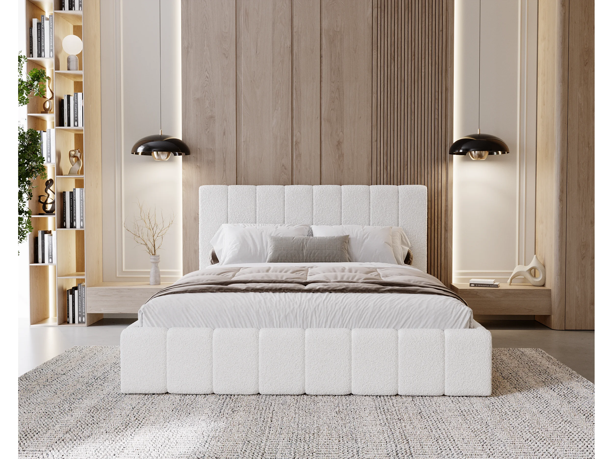BESILIO Lit de chambre Slim 200x200 Lexy – cadre en métal, coffre de rangement pour le linge de lit, lit fin, tissu bouclé – Blanc