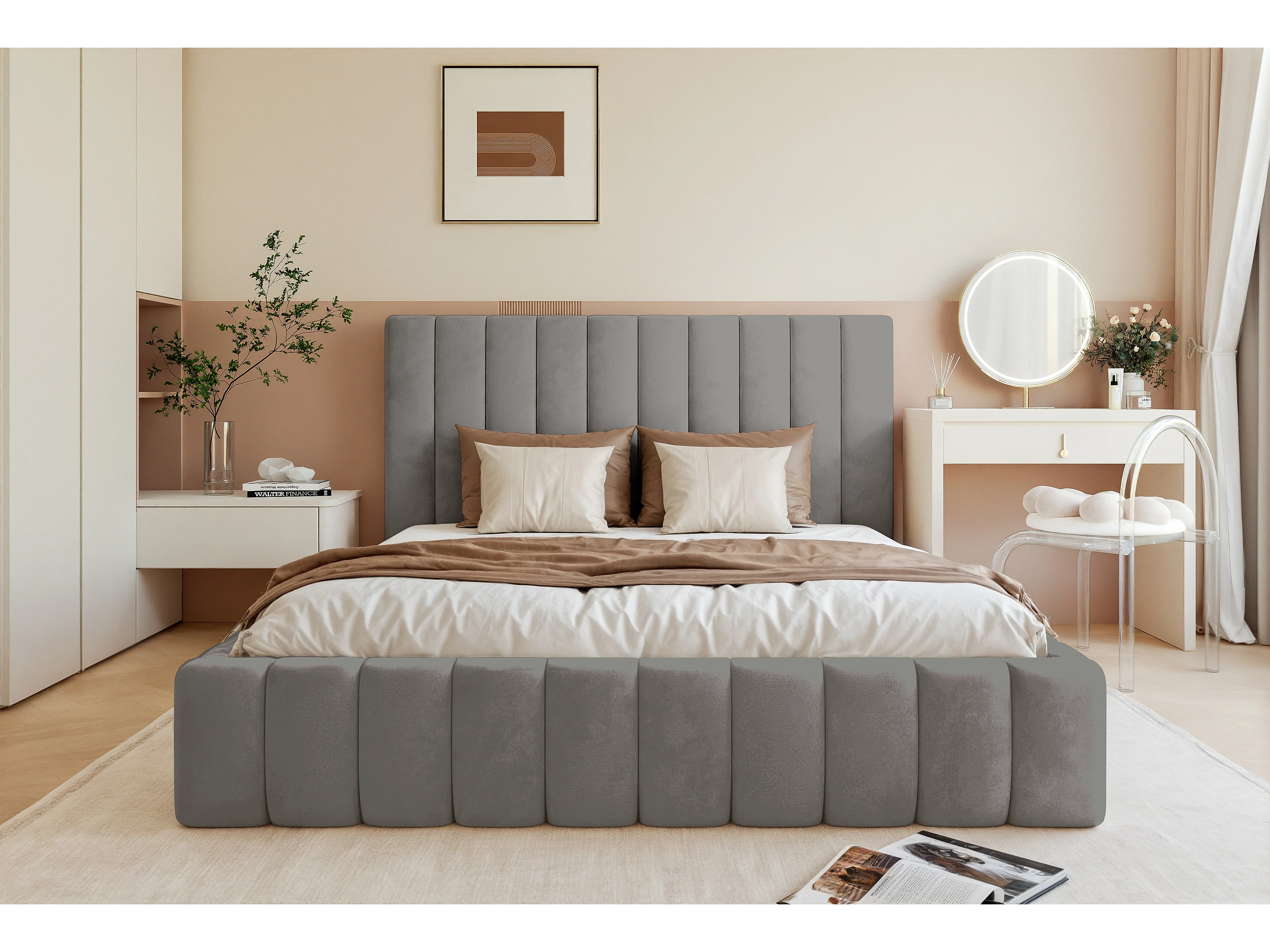 BESILIO Lit double 120x200 Tina – lit fin pour la chambre avec sommier et coffre de rangement – tissu velours – Gris