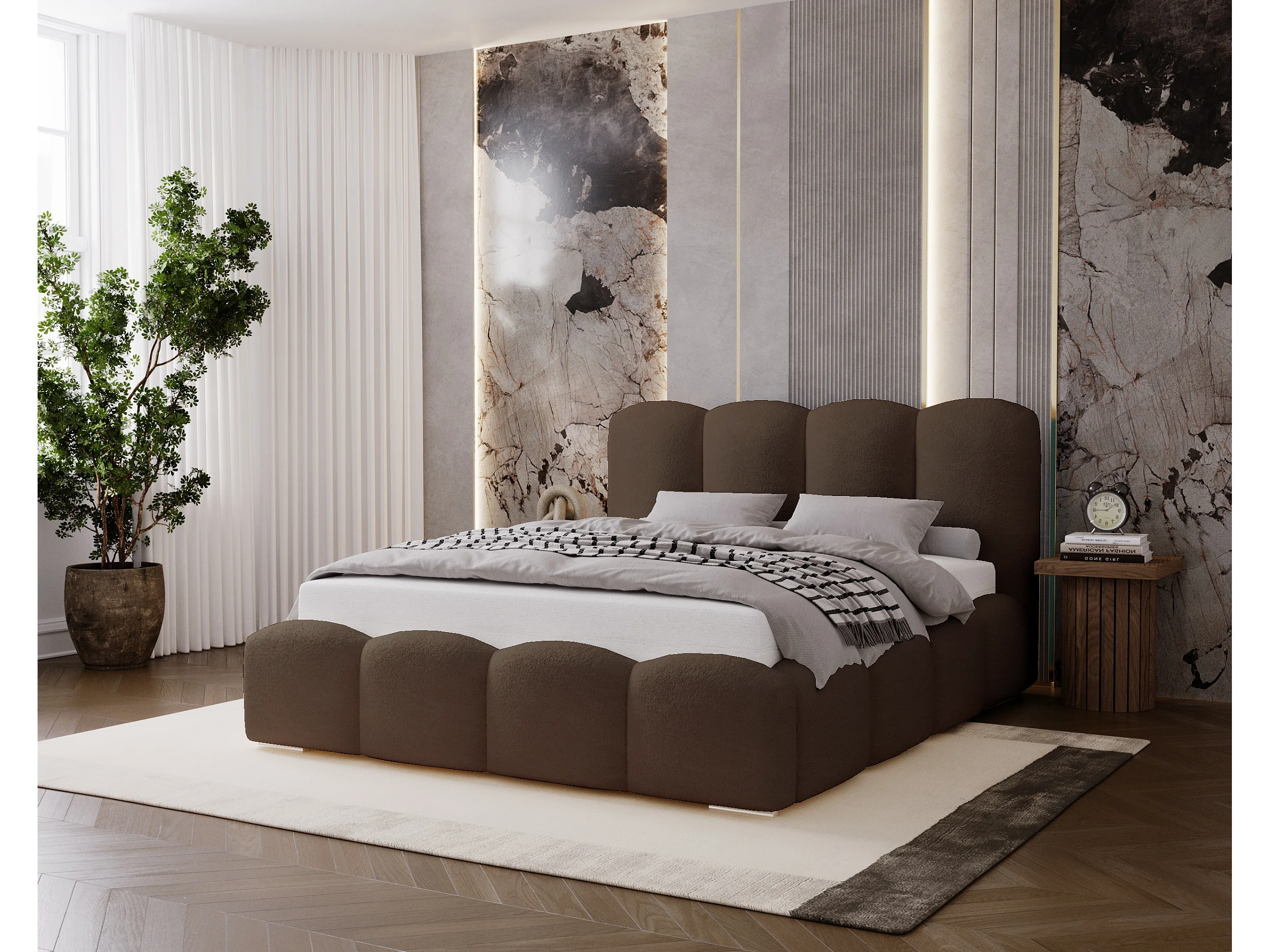 BESILIO Lit tapissé 160x200 Fluffy – lit nuage bouclé, lit avec coffre de rangement et sommier, mousse épaisse, lit coffre moderne pour chambre – Marron