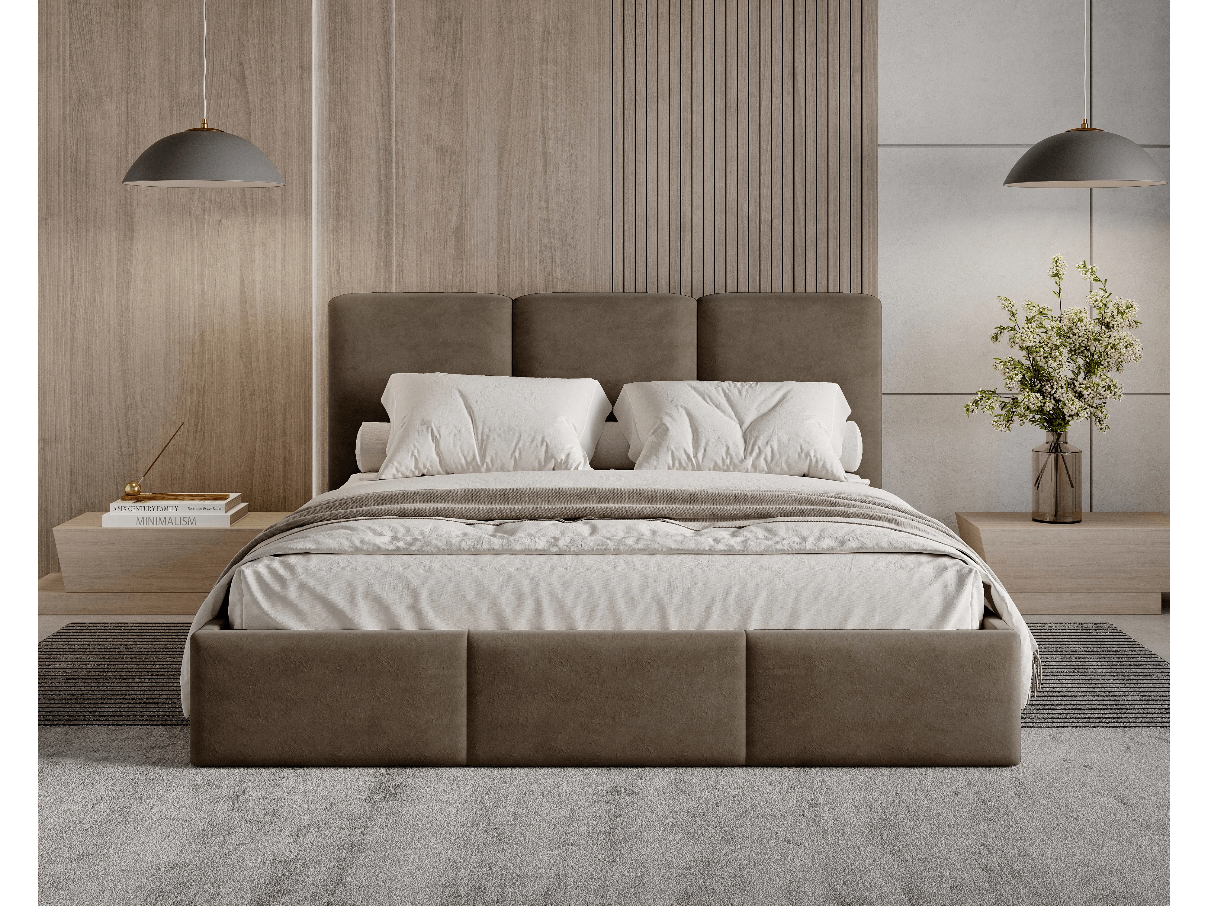 BESILIO Lit tapissé avec coffre de rangement 160x200 Elora – lit fin avec tête de lit décorative et cadre en métal – Marron