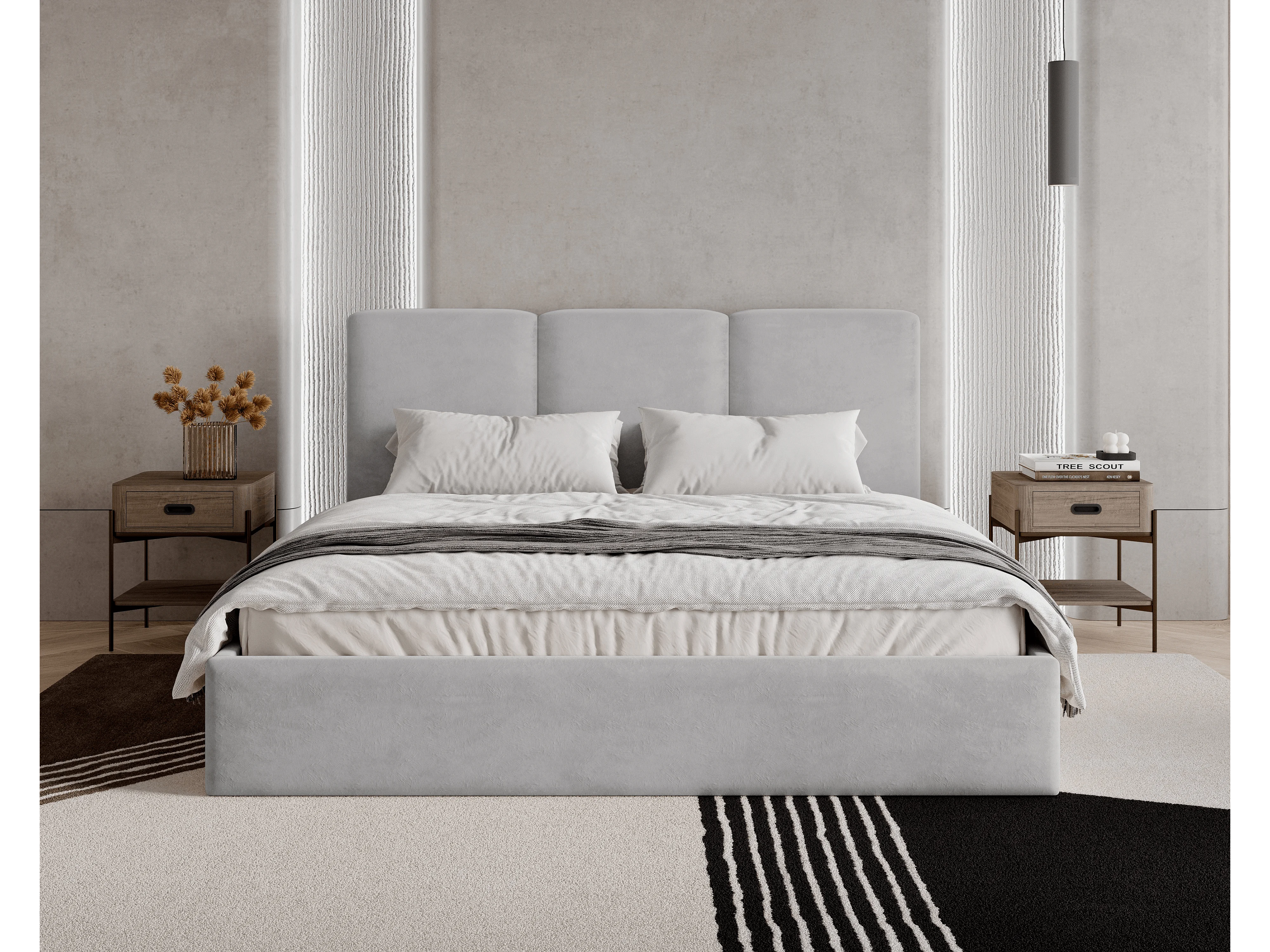 BESILIO Lit tapissé avec coffre de rangement 160x200 Mira – lit fin et minimaliste avec cadre en métal – Gris clair