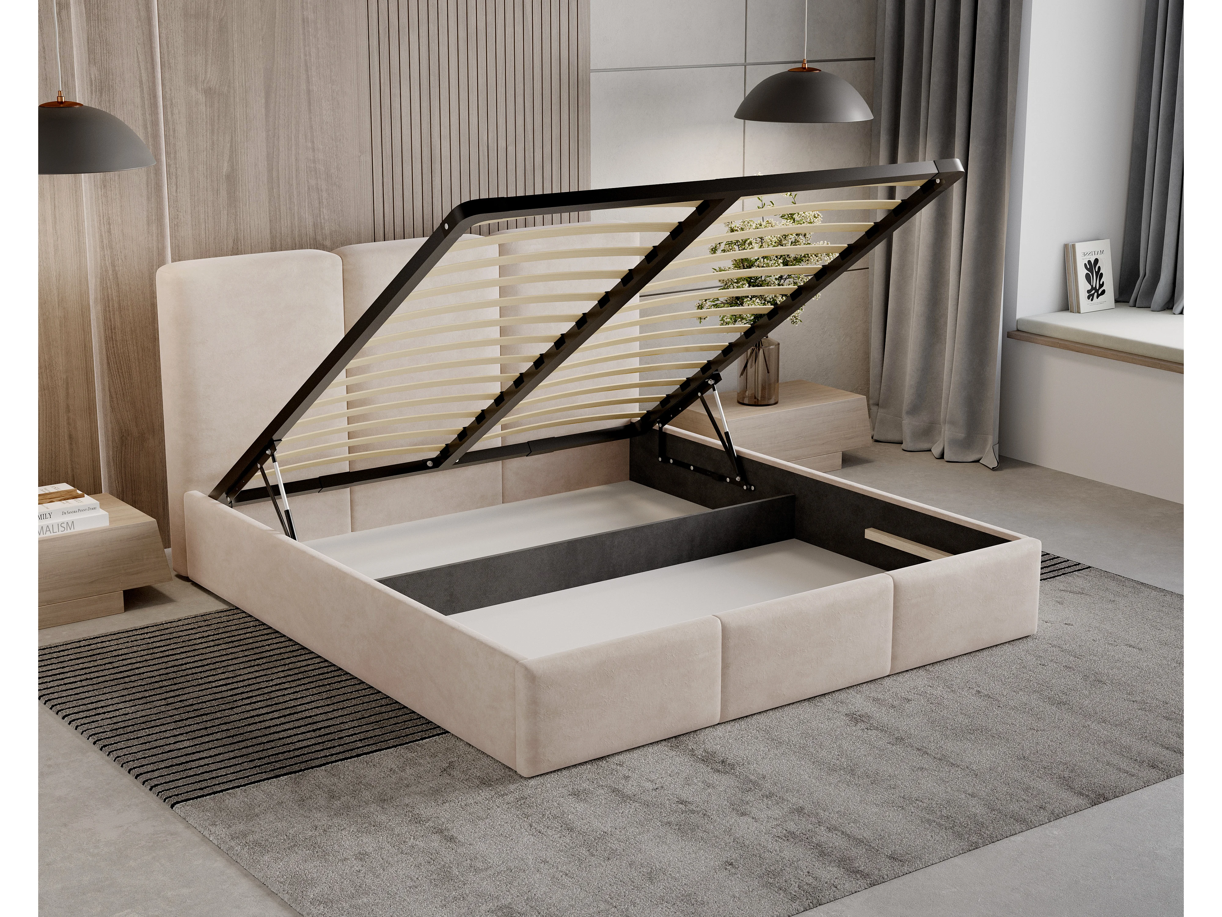 BESILIO Lit tapissé avec coffre de rangement 200x200 Elora – lit fin avec tête de lit décorative et cadre en métal – Gris