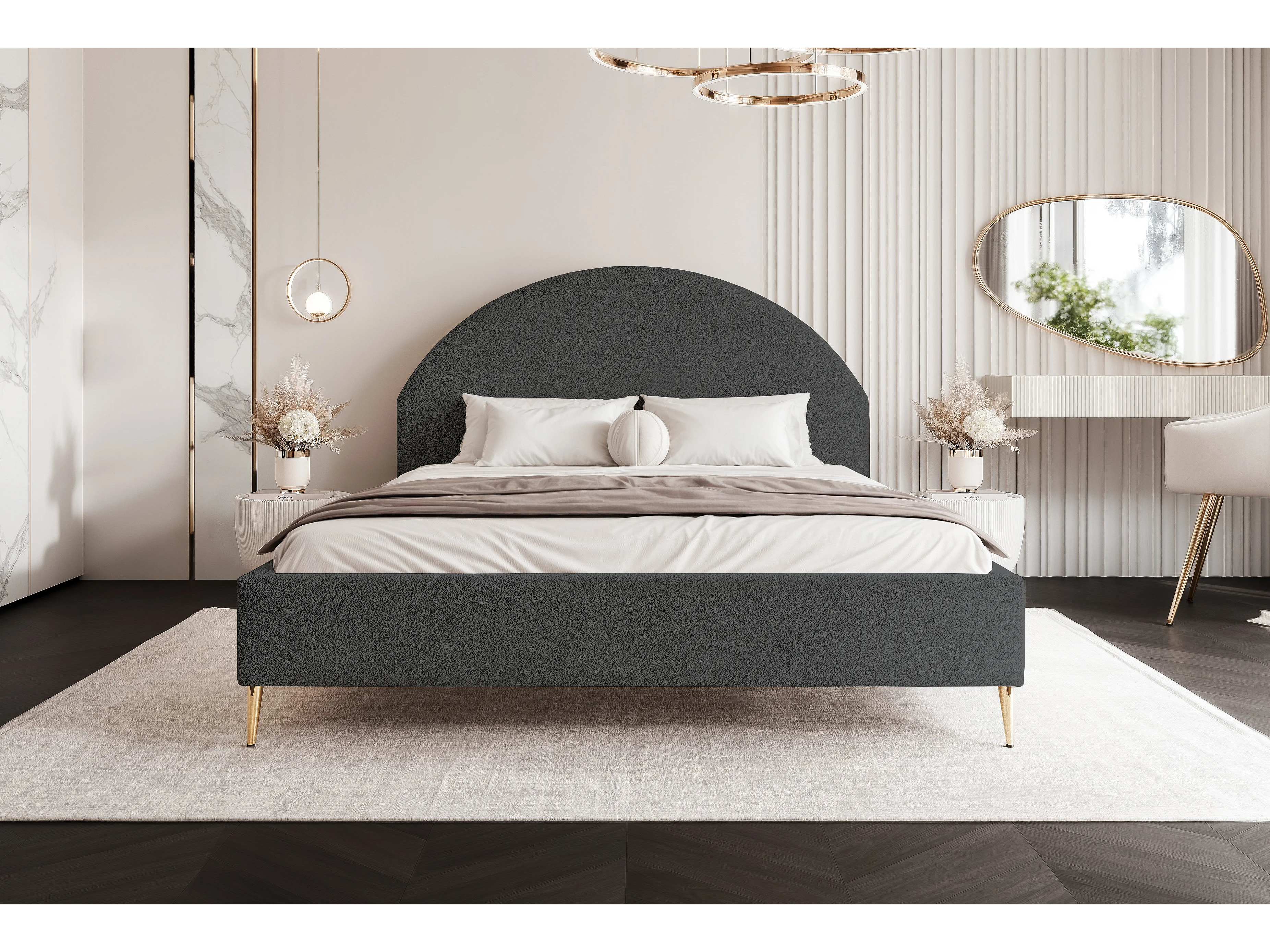BESILIO Lit tapissé Boucle 120x200 Velora II – sommier à lattes, tête de lit, coffre de rangement, lit fin, pieds hauts dorés – Gris