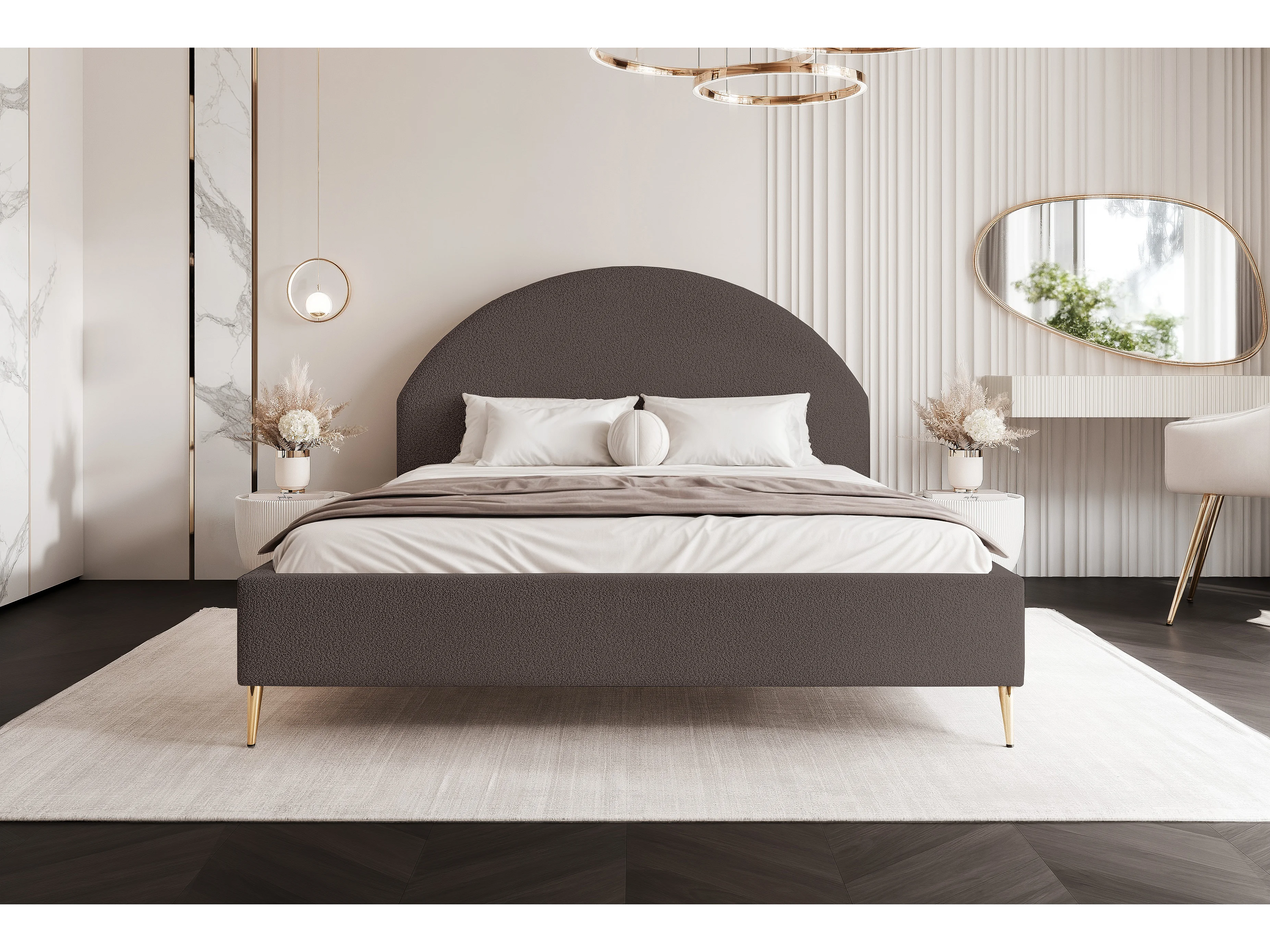 BESILIO Lit tapissé Boucle 180x200 Velora II – sommier à lattes, tête de lit, coffre de rangement, lit fin, pieds hauts dorés – Marron