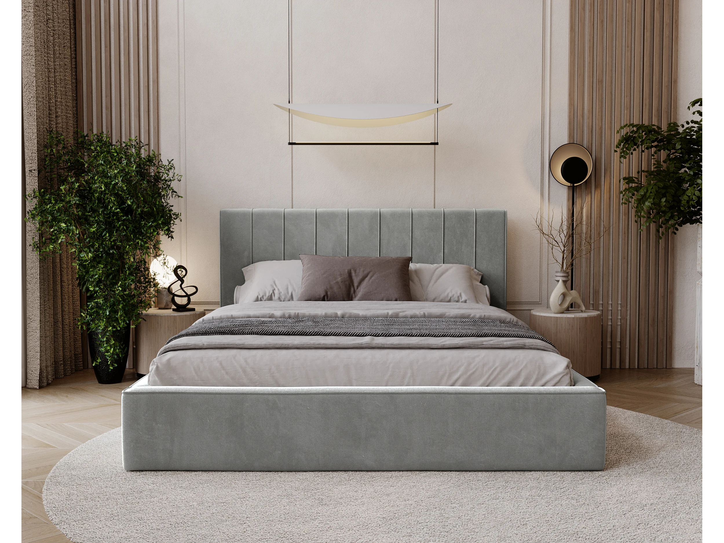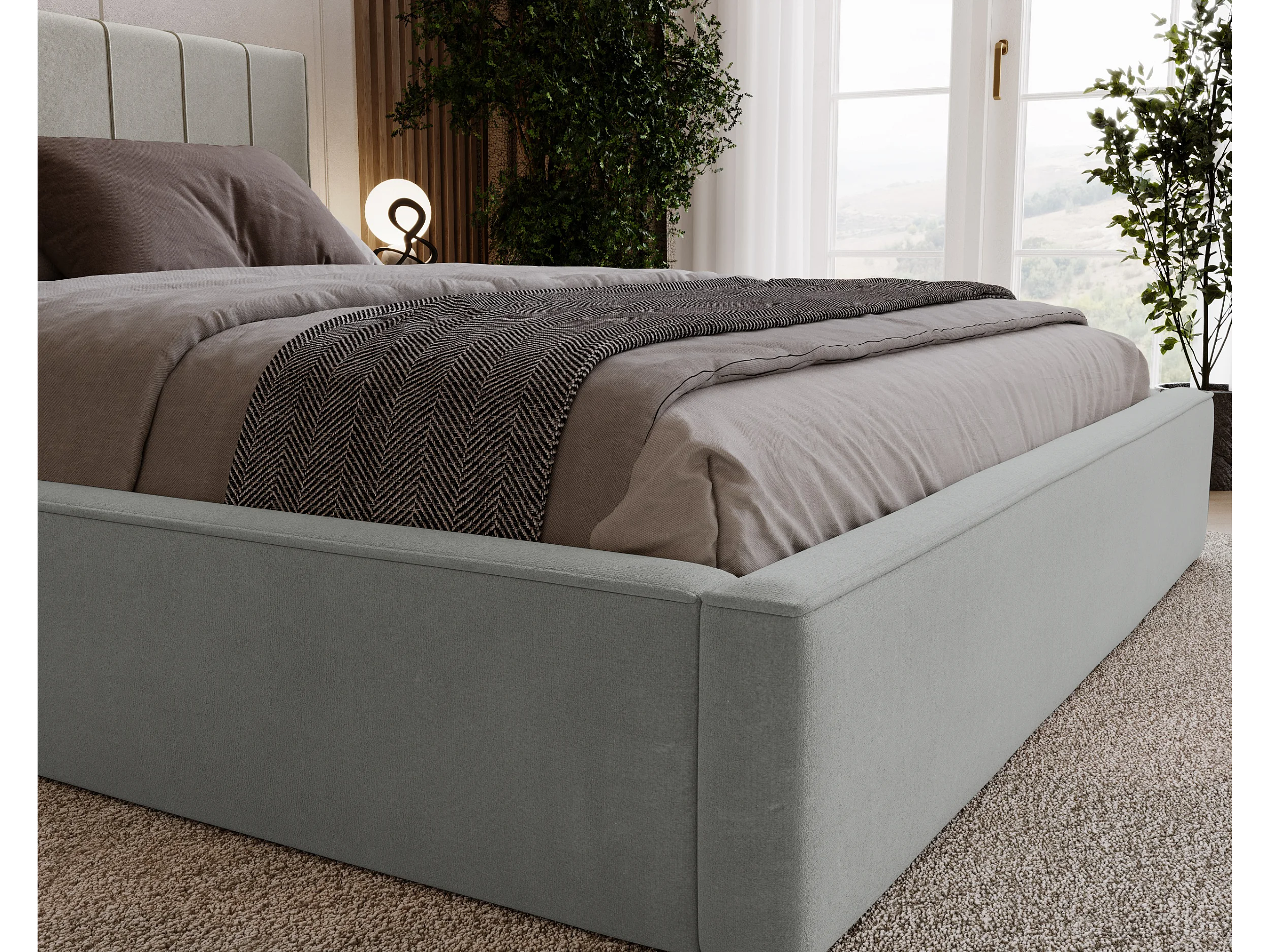 BESILIO Lit tapissé élégant 120x200 Persea – cadre en métal, coffre de rangement pour le linge de lit, passepoil décoratif – Gris