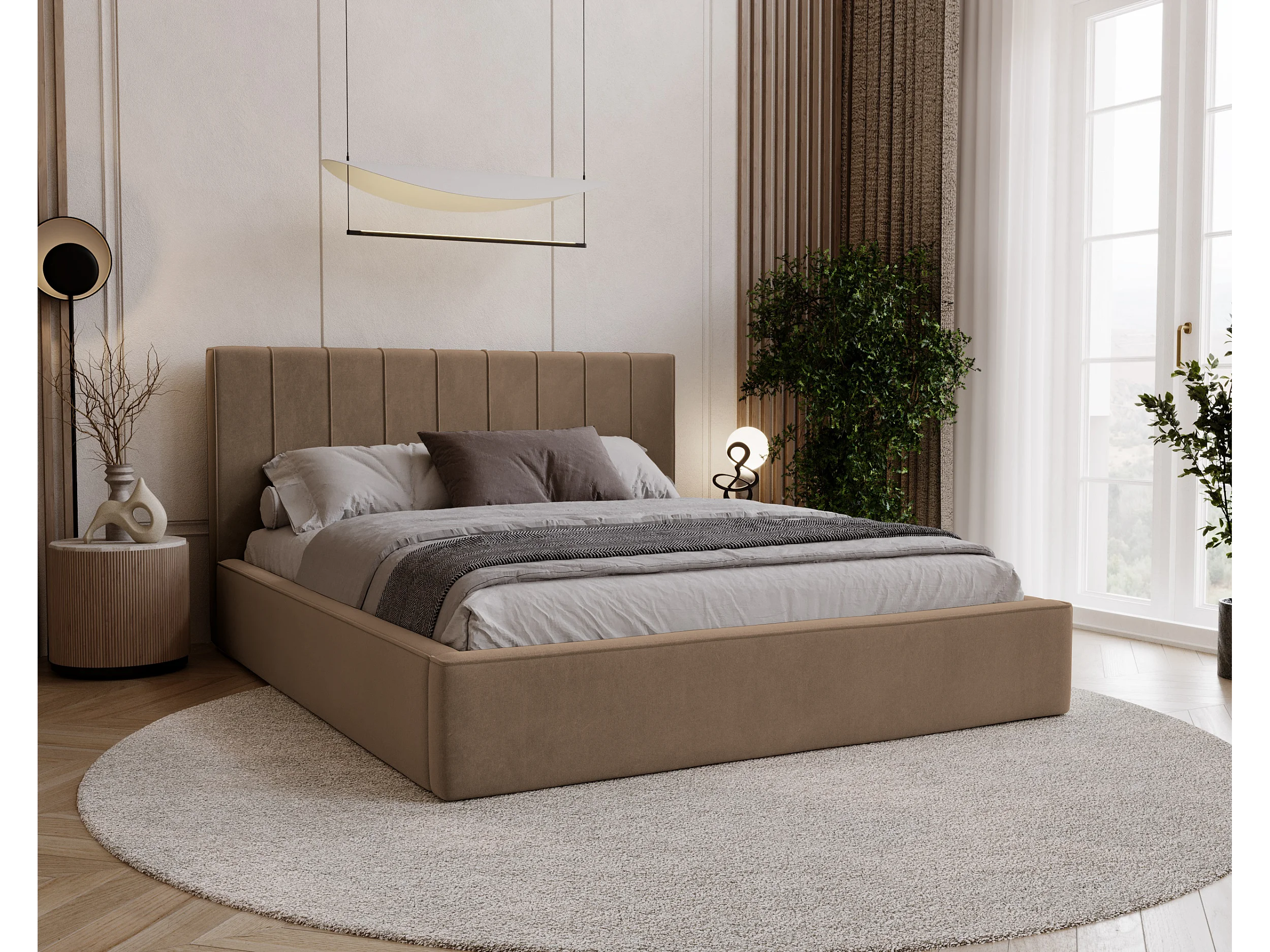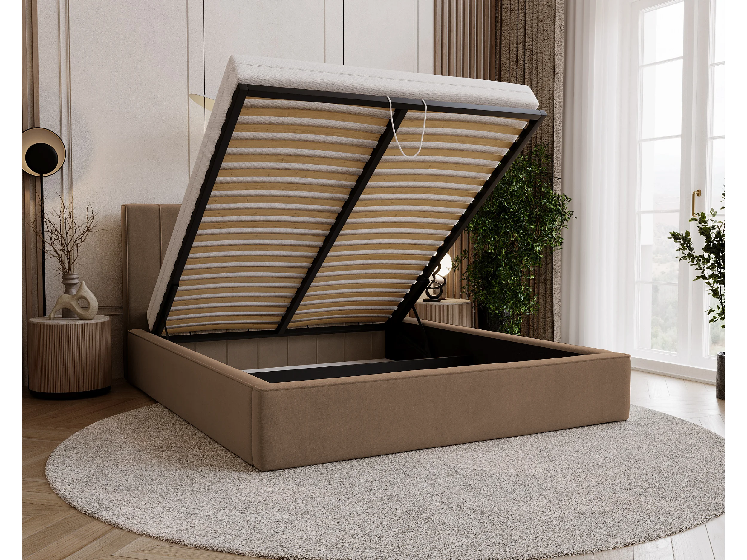 BESILIO Lit tapissé élégant 120x200 Persea – cadre en métal, coffre de rangement pour le linge de lit, passepoil décoratif – Marron