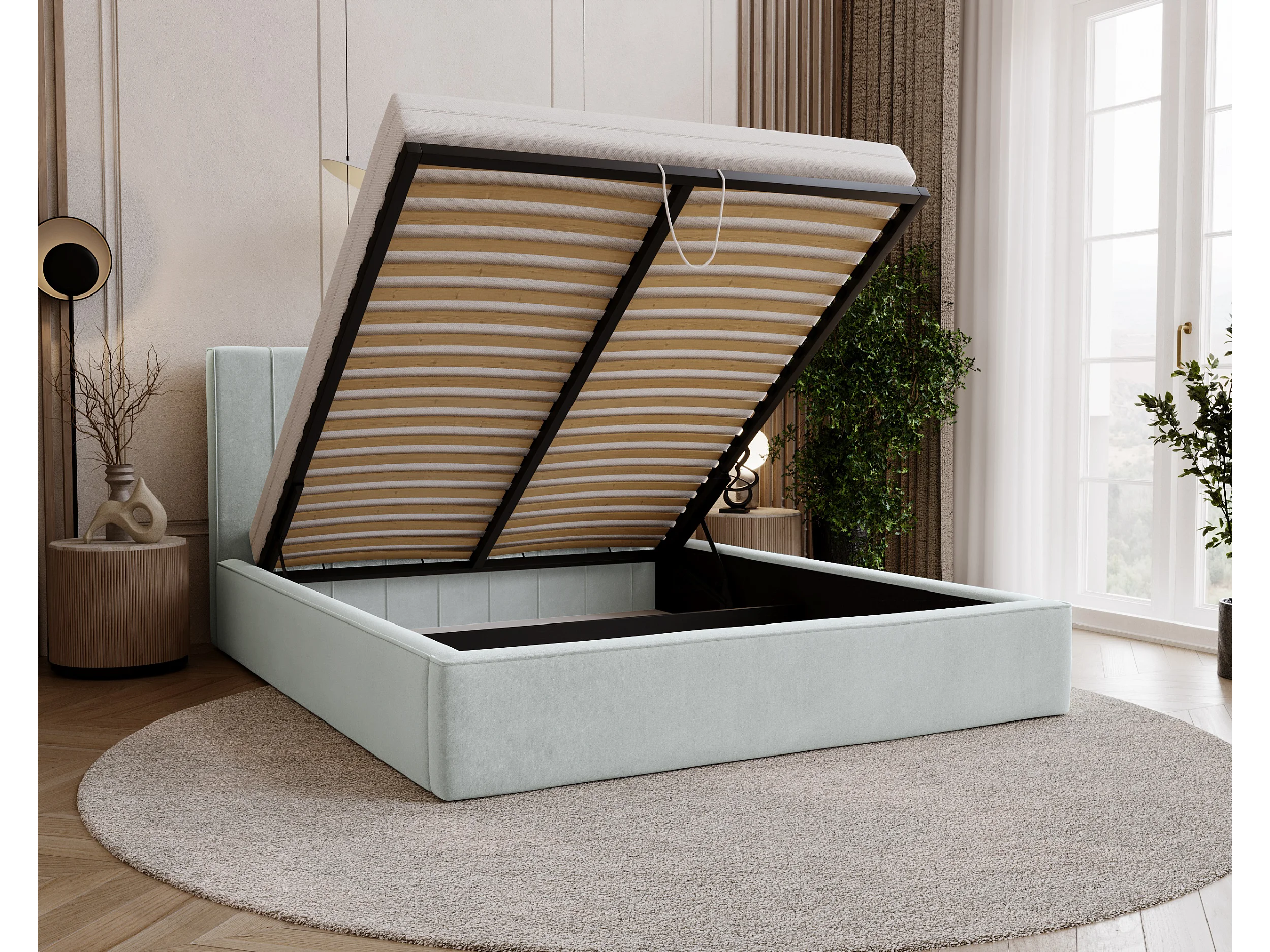 BESILIO Lit tapissé élégant 180x200 Persea – cadre en métal, coffre de rangement pour le linge de lit, passepoil décoratif – Gris clair