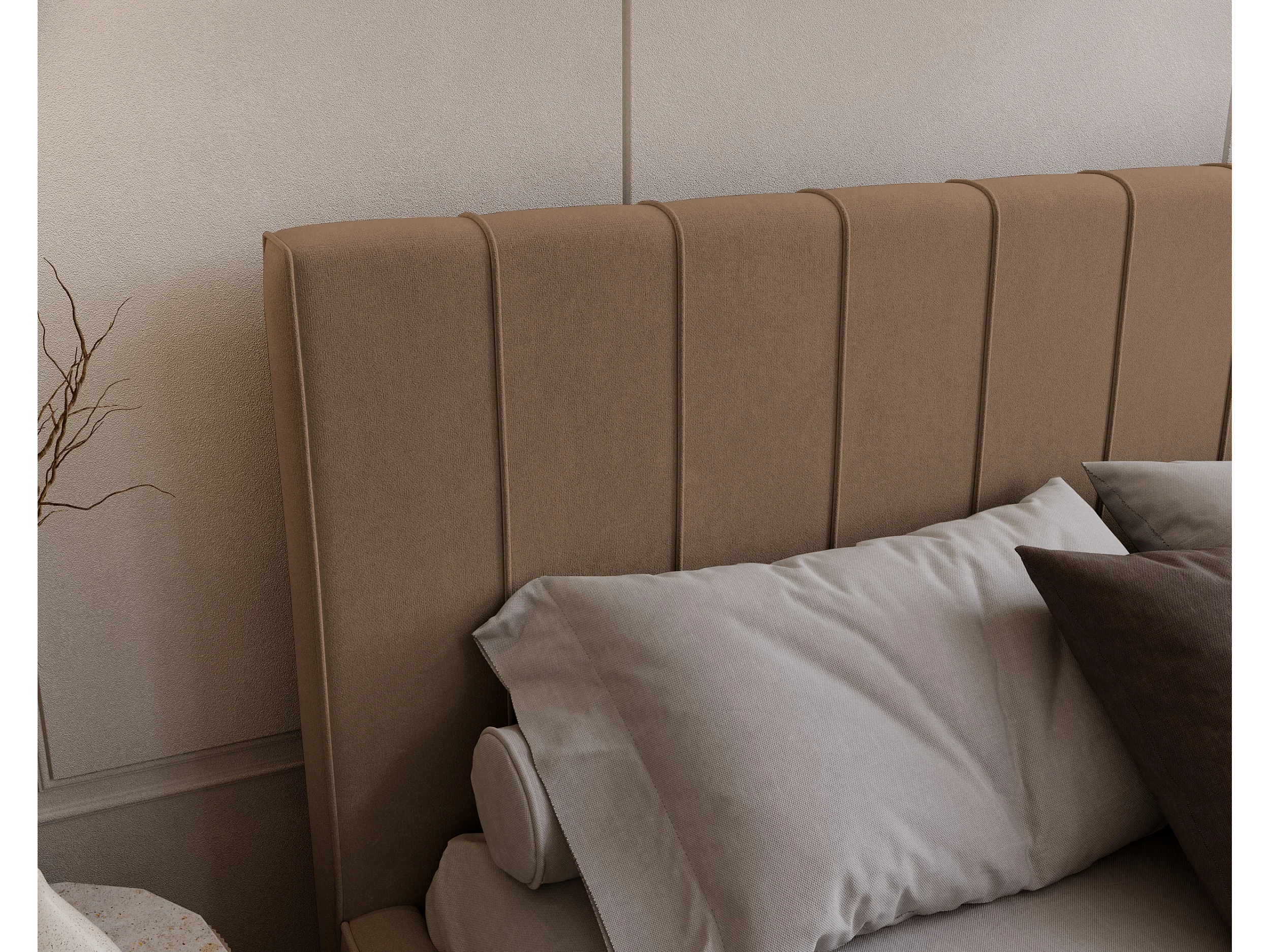 BESILIO Lit tapissé élégant 180x200 Persea – cadre en métal, coffre de rangement pour le linge de lit, passepoil décoratif – Marron