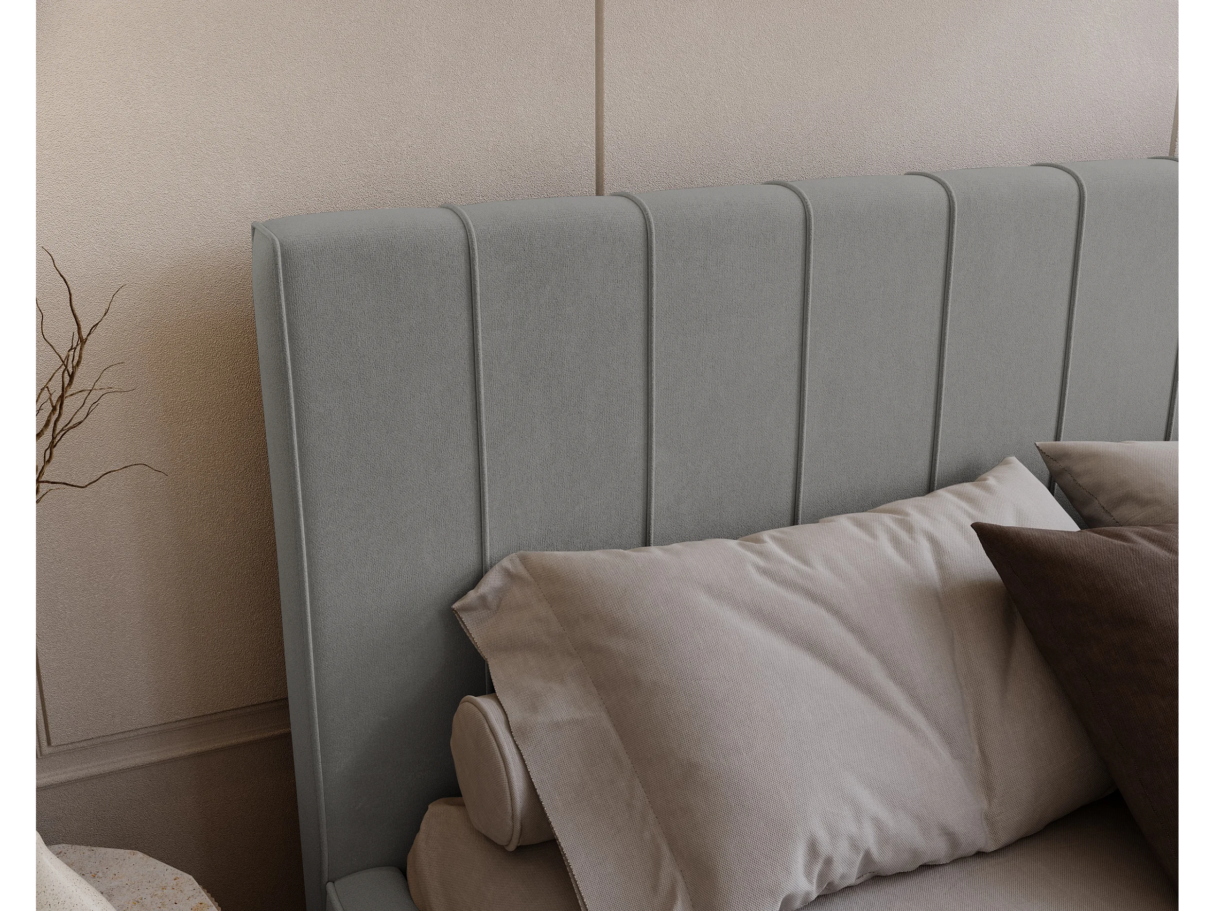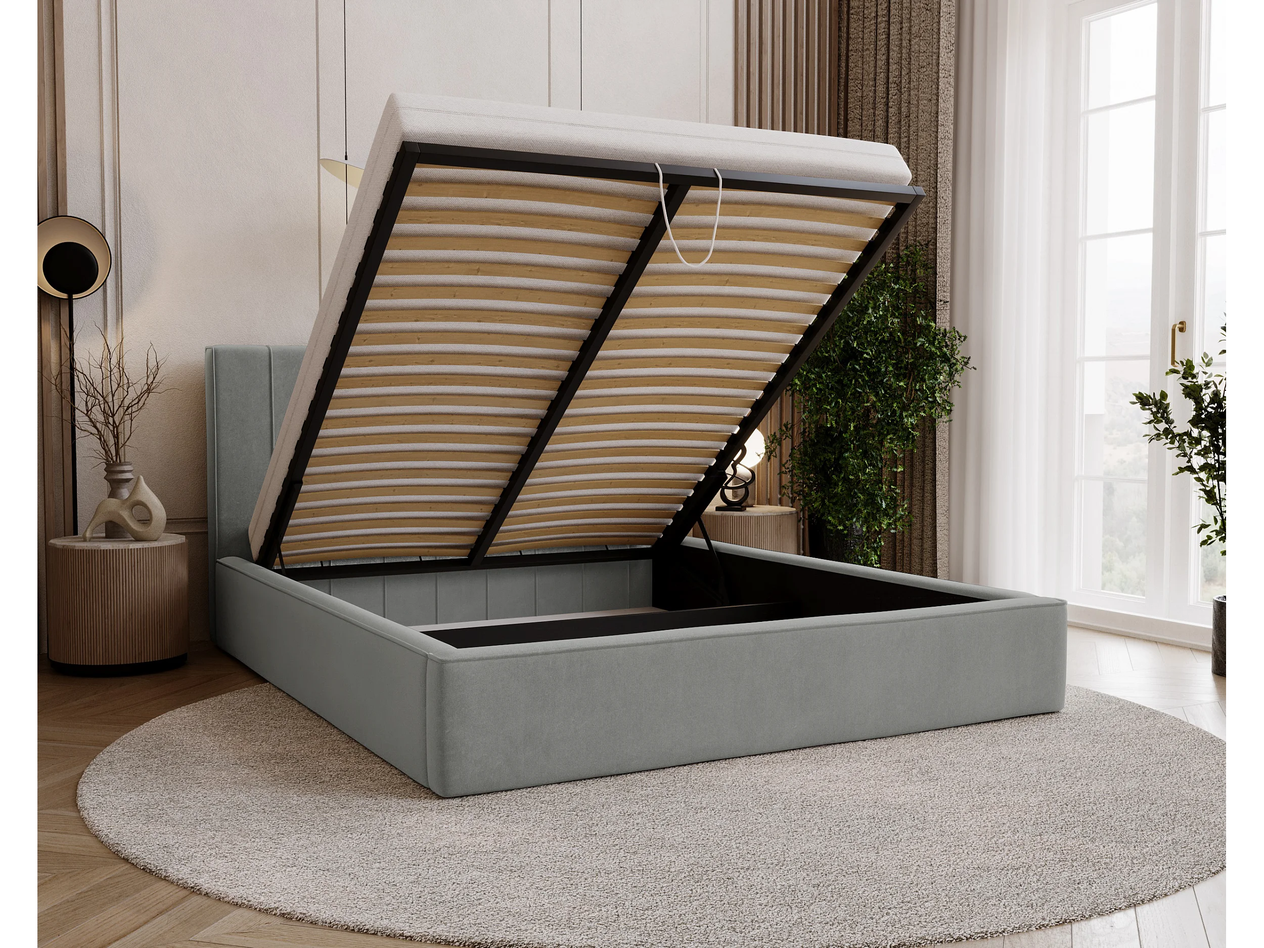 BESILIO Lit tapissé élégant 200x200 Persea – cadre en métal, coffre de rangement pour le linge de lit, passepoil décoratif – Gris