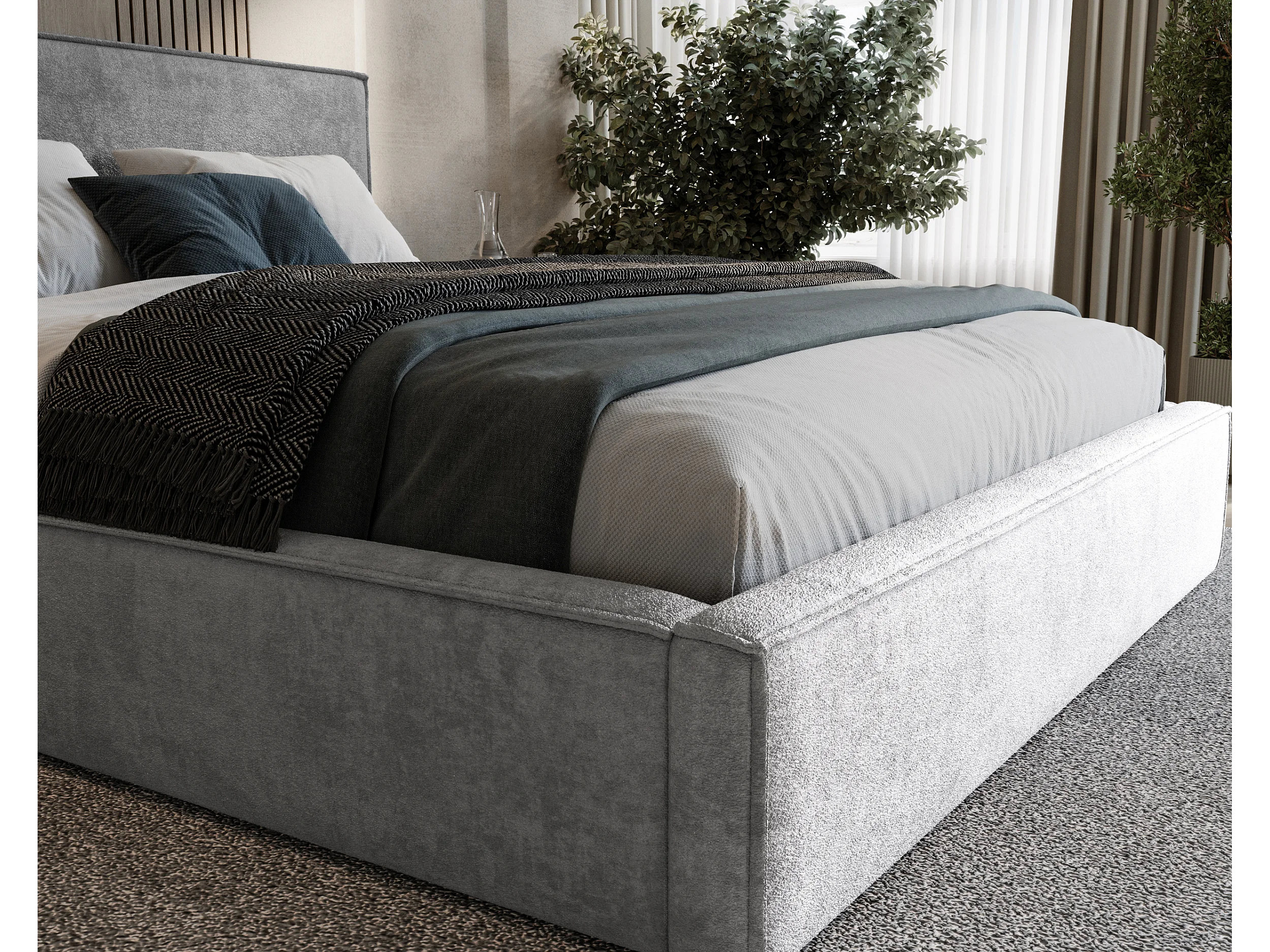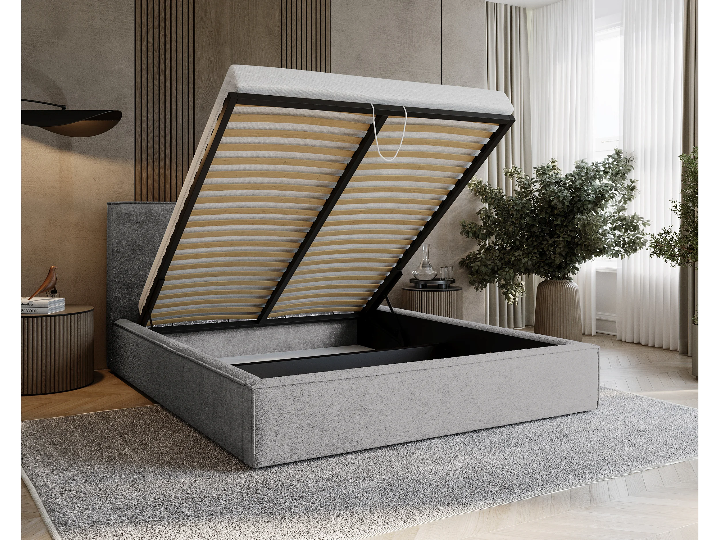 BESILIO Lit tapissé pour chambre à coucher 120x200 Zanzi - cadre métallique, coffre de rangement, bordure décorative, tissu chenille - Gris