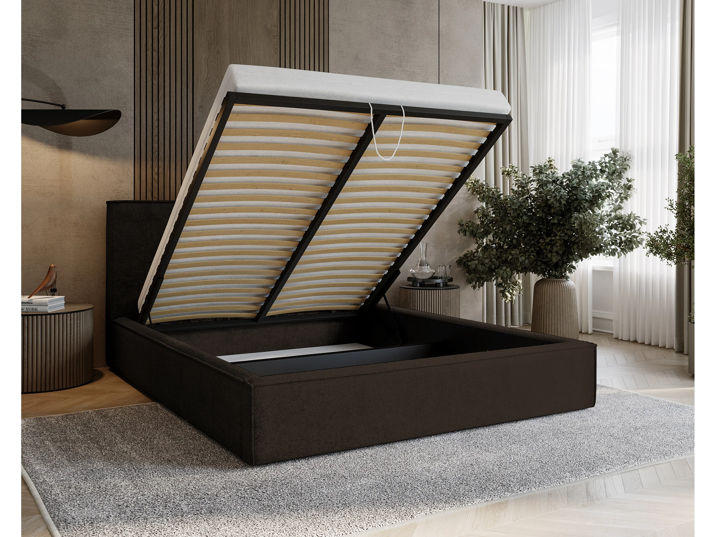 BESILIO Lit tapissé pour chambre à coucher 140x200 Zanzi - cadre métallique, coffre de rangement, bordure décorative, tissu chenille - Marron