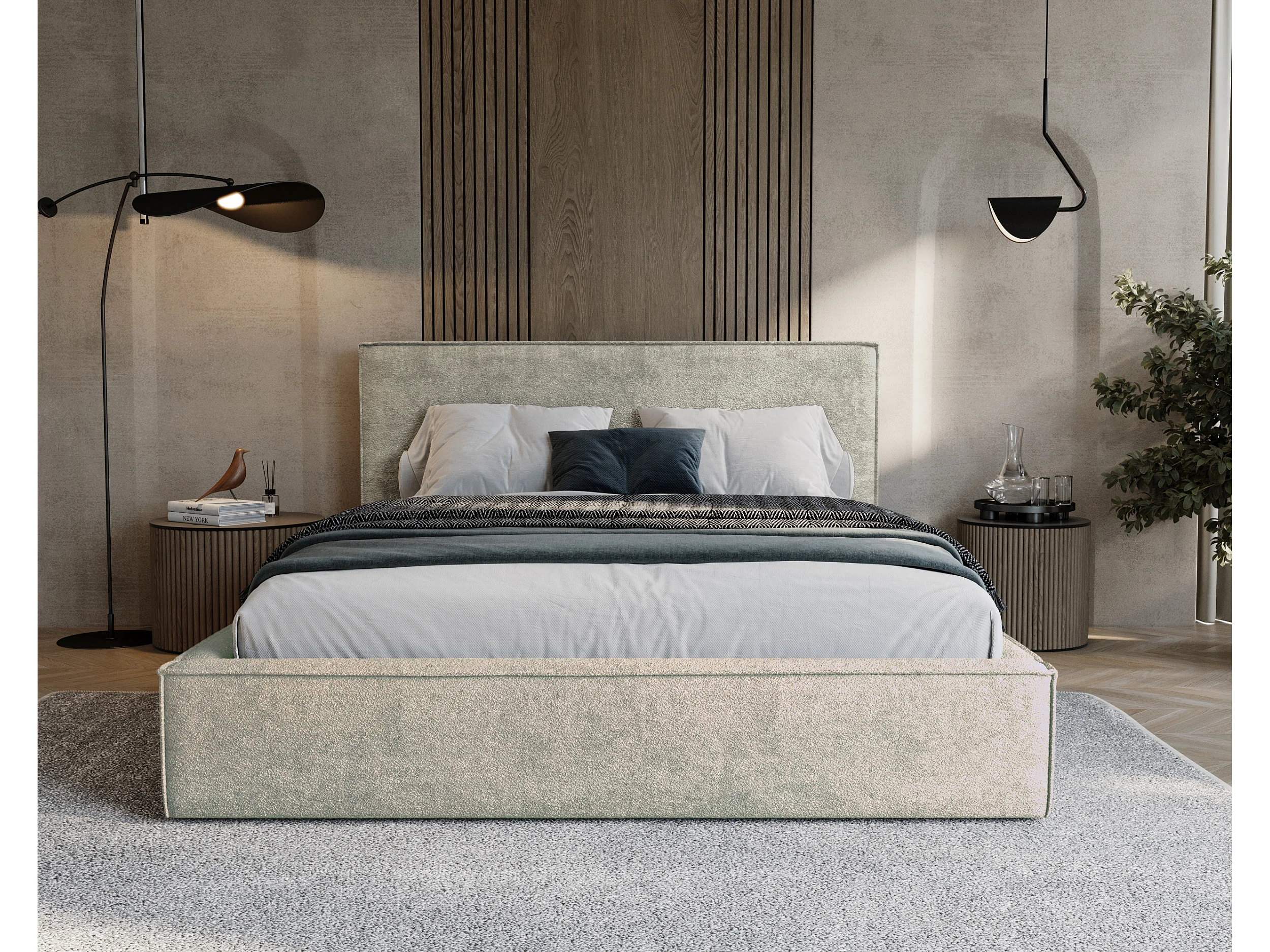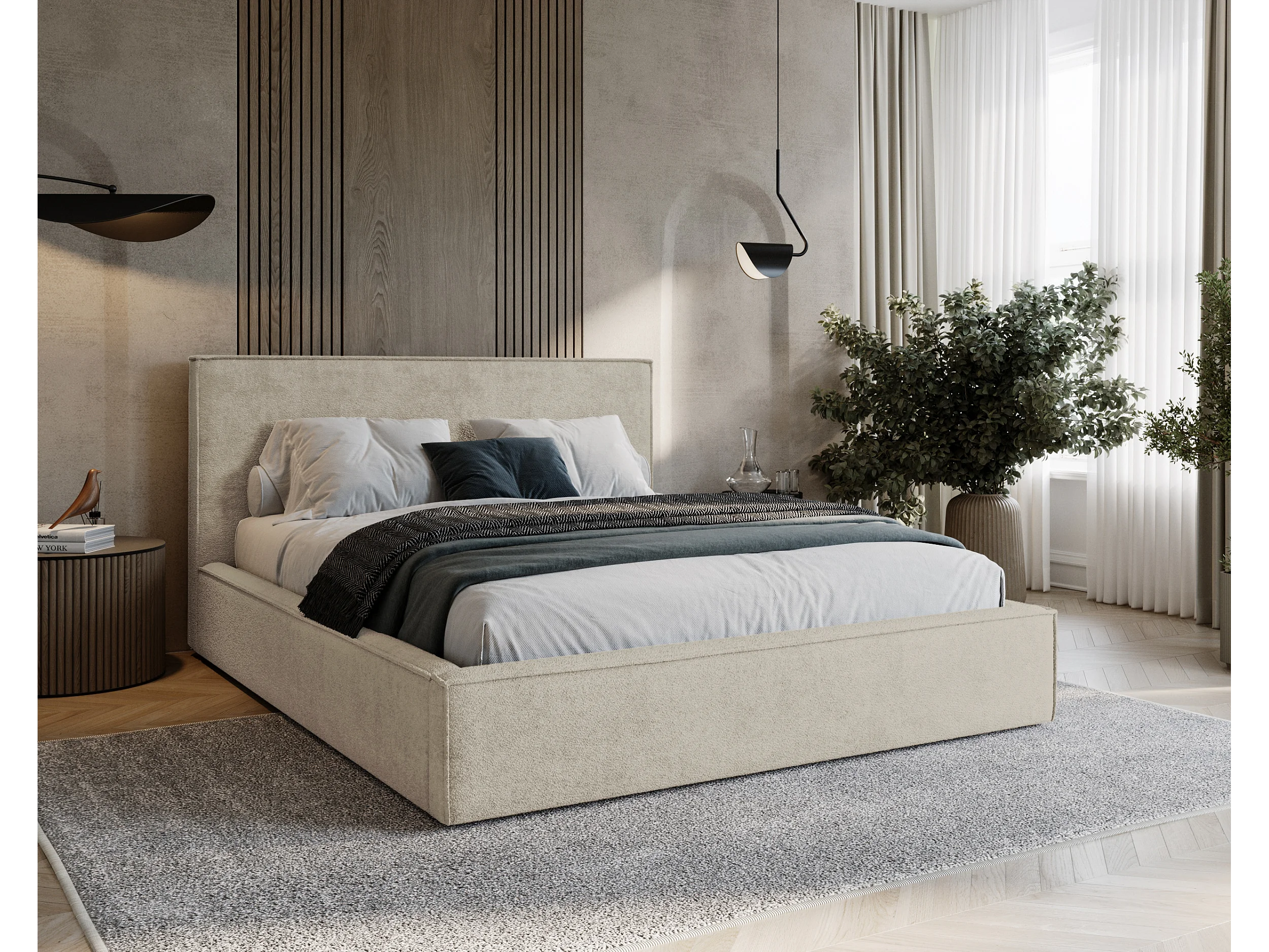 BESILIO Lit tapissé pour chambre à coucher 160x200 Zanzi - cadre métallique, coffre de rangement, bordure décorative, tissu chenille - Beige