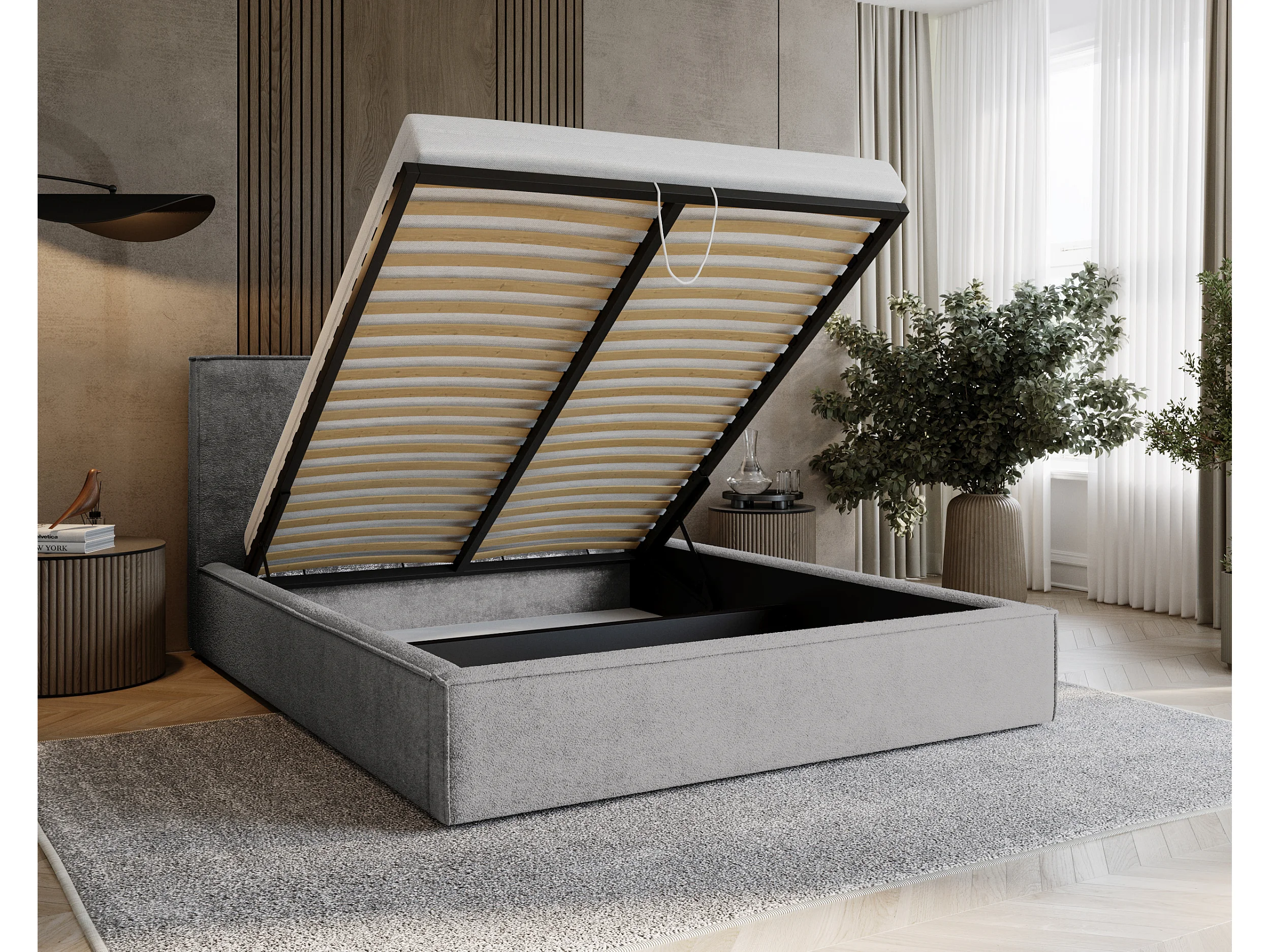 BESILIO Lit tapissé Boucle 160×200 Velora – sommier à lattes, tête de lit, coffre de rangement, lit slim – Gris clair