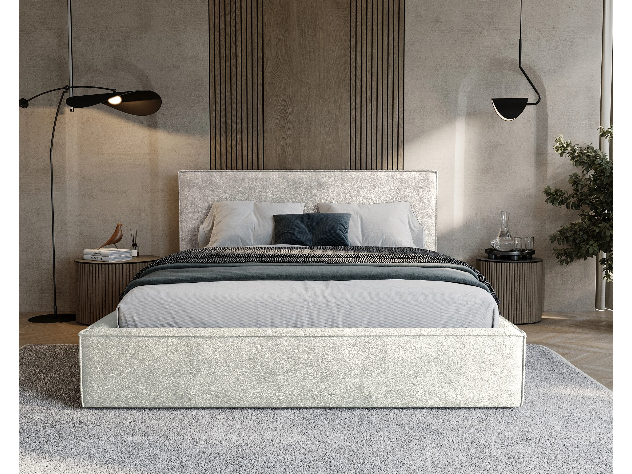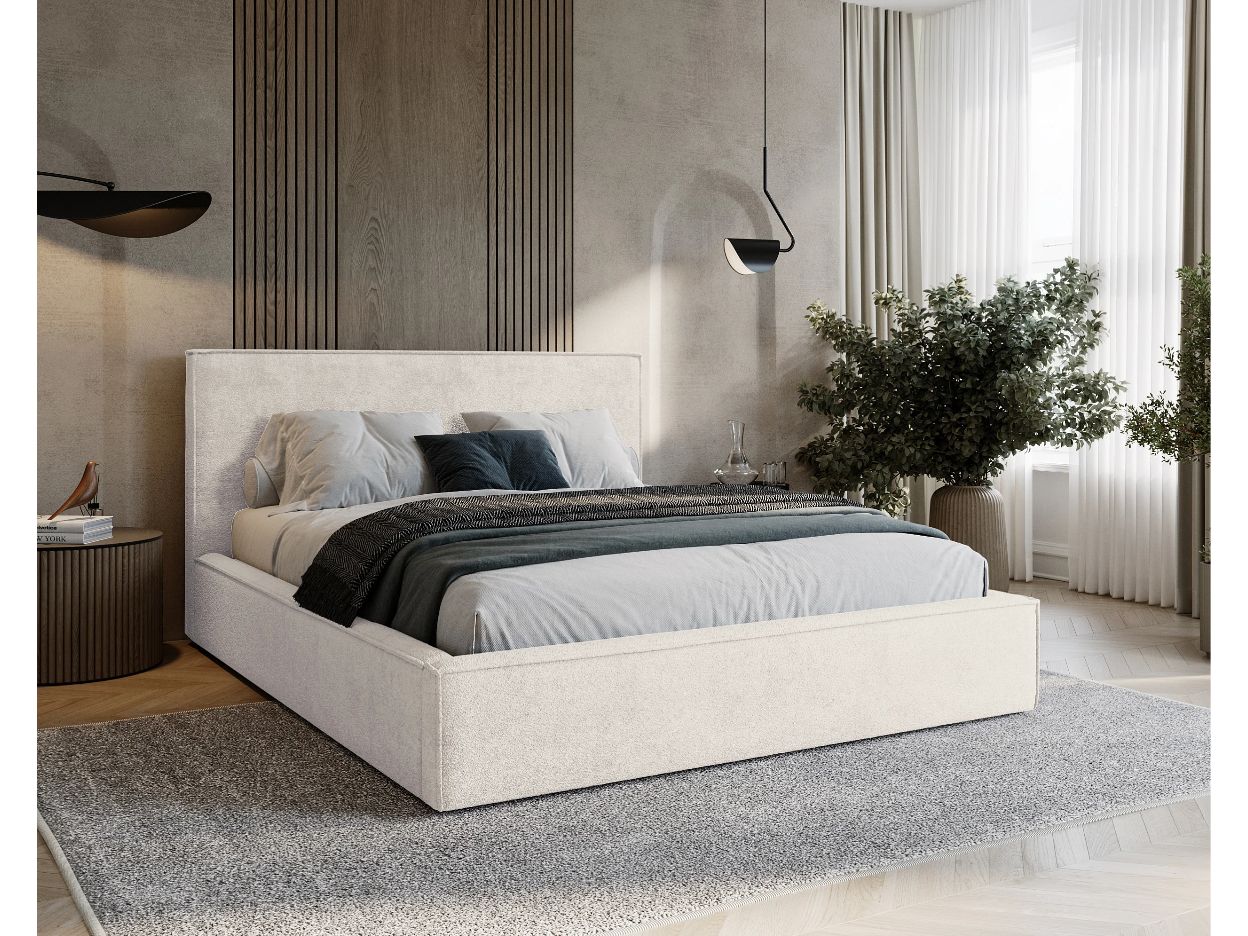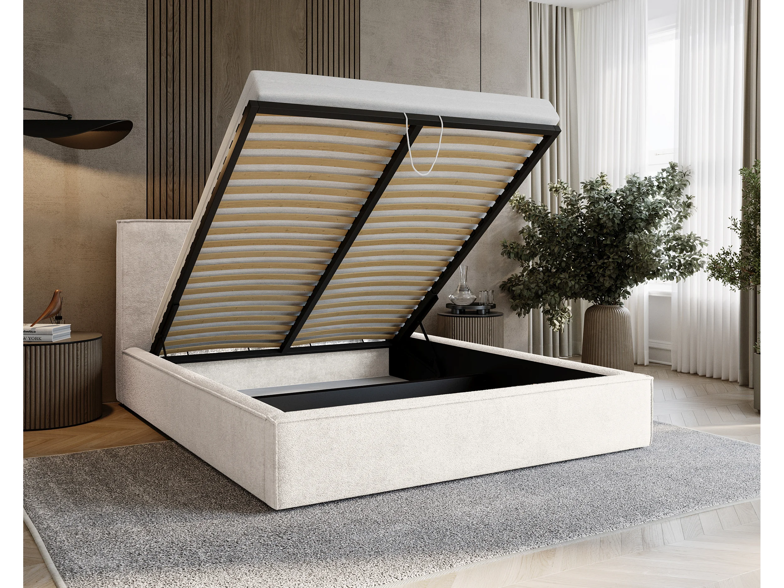 BESILIO Lit tapissé pour chambre à coucher 180x200 Zanzi - cadre métallique, coffre de rangement, bordure décorative, tissu chenille - Crème