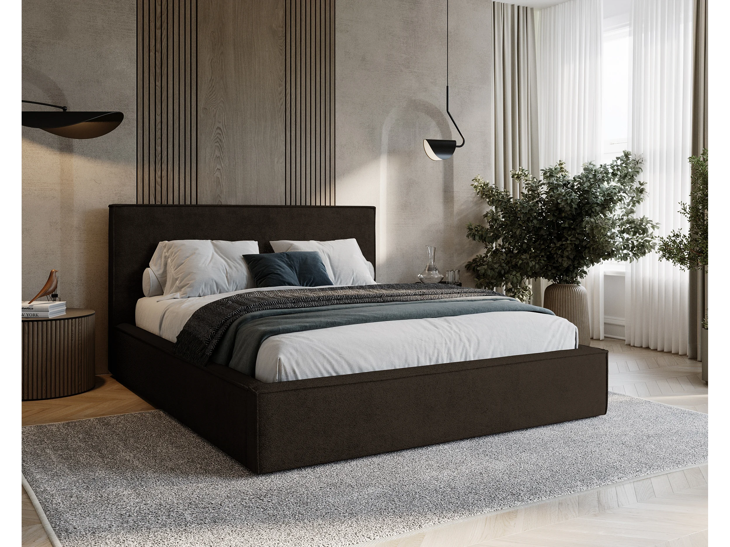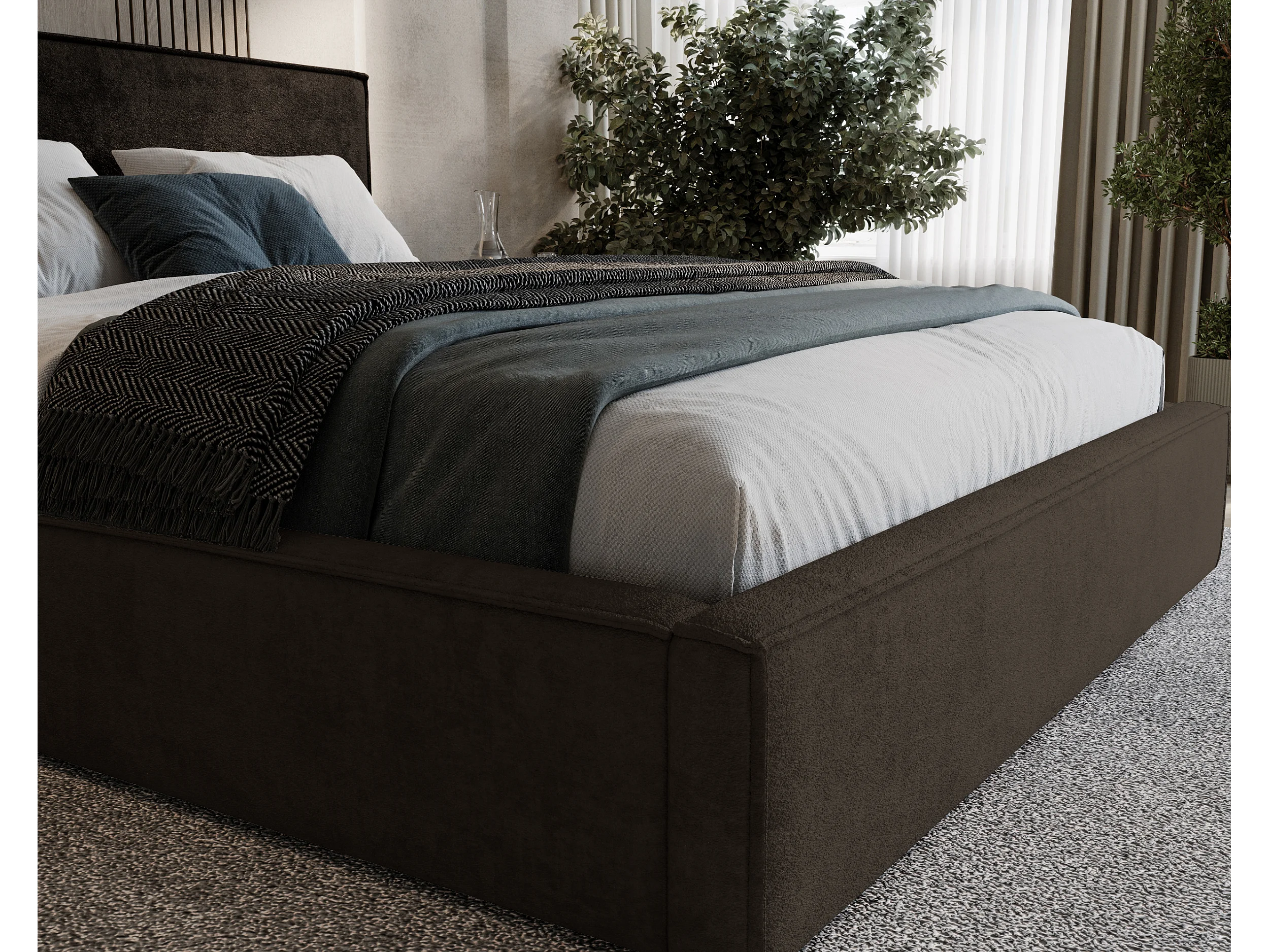 BESILIO Lit tapissé pour chambre à coucher 200x200 Zanzi - cadre métallique, coffre de rangement, bordure décorative, tissu chenille - Marron