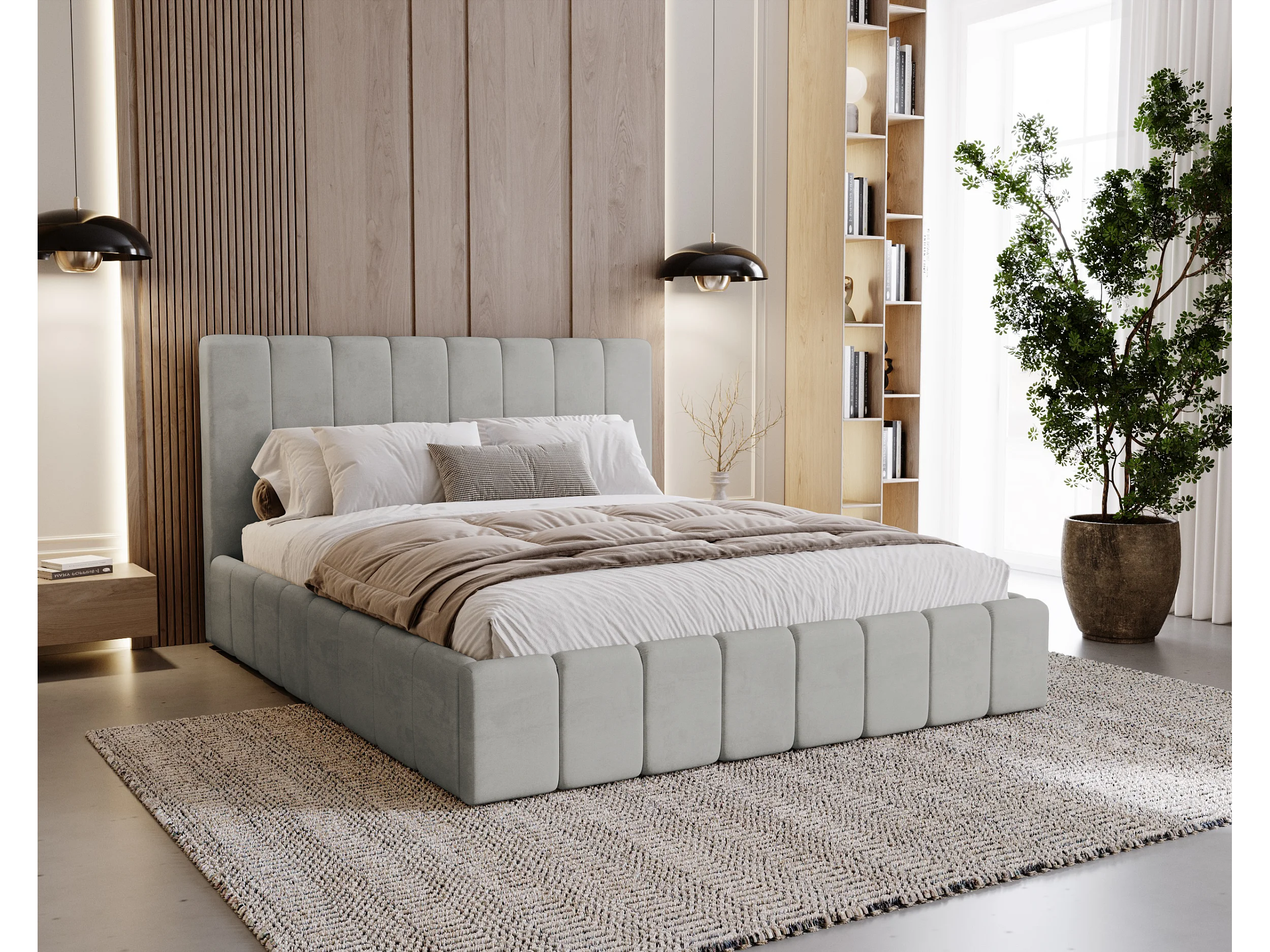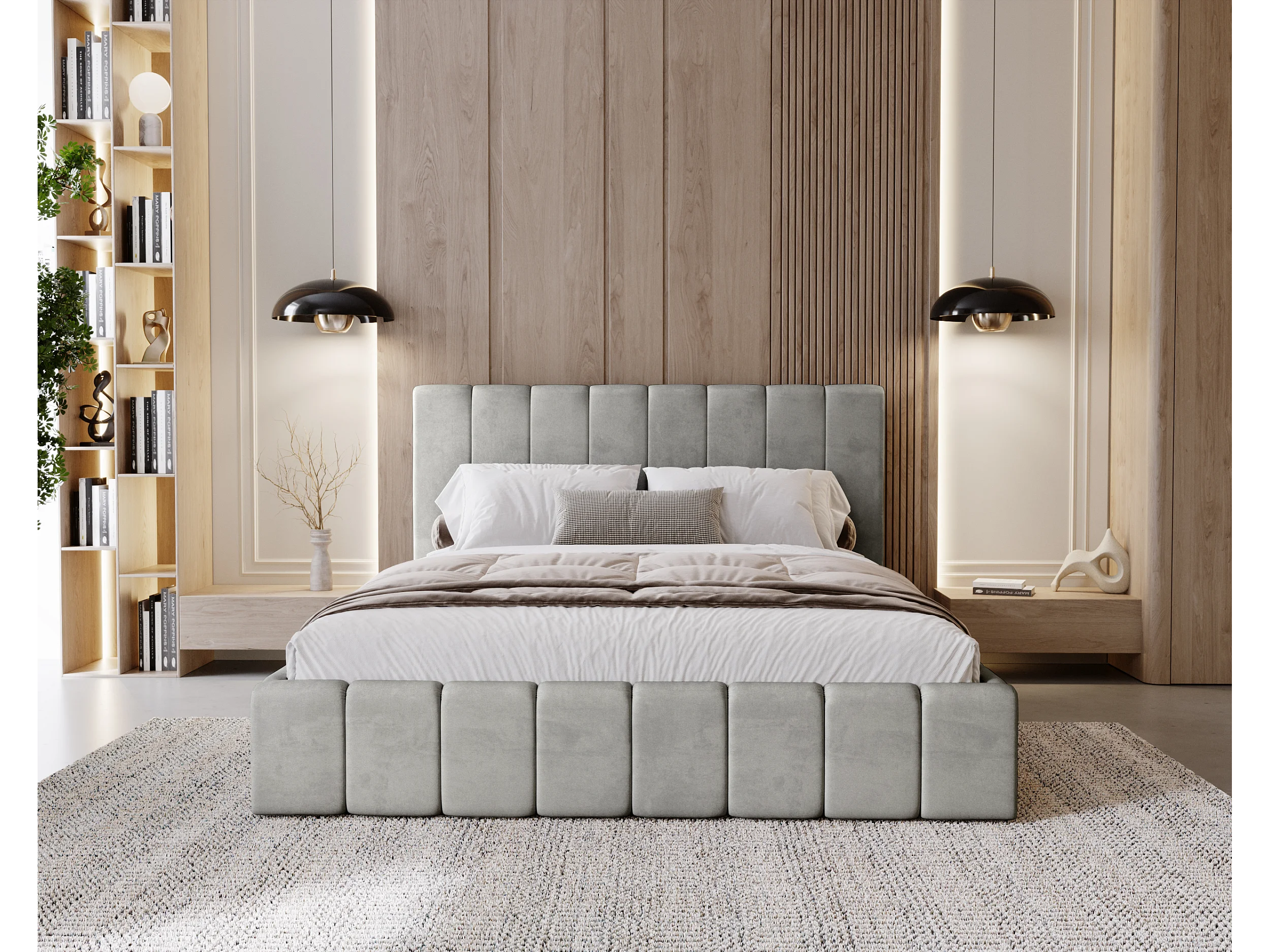 BESILIO Lit tapissé Slim 180x200 Lexy – cadre en métal, coffre de rangement pour le linge de lit, lit fin, tissu velours – Gris clair