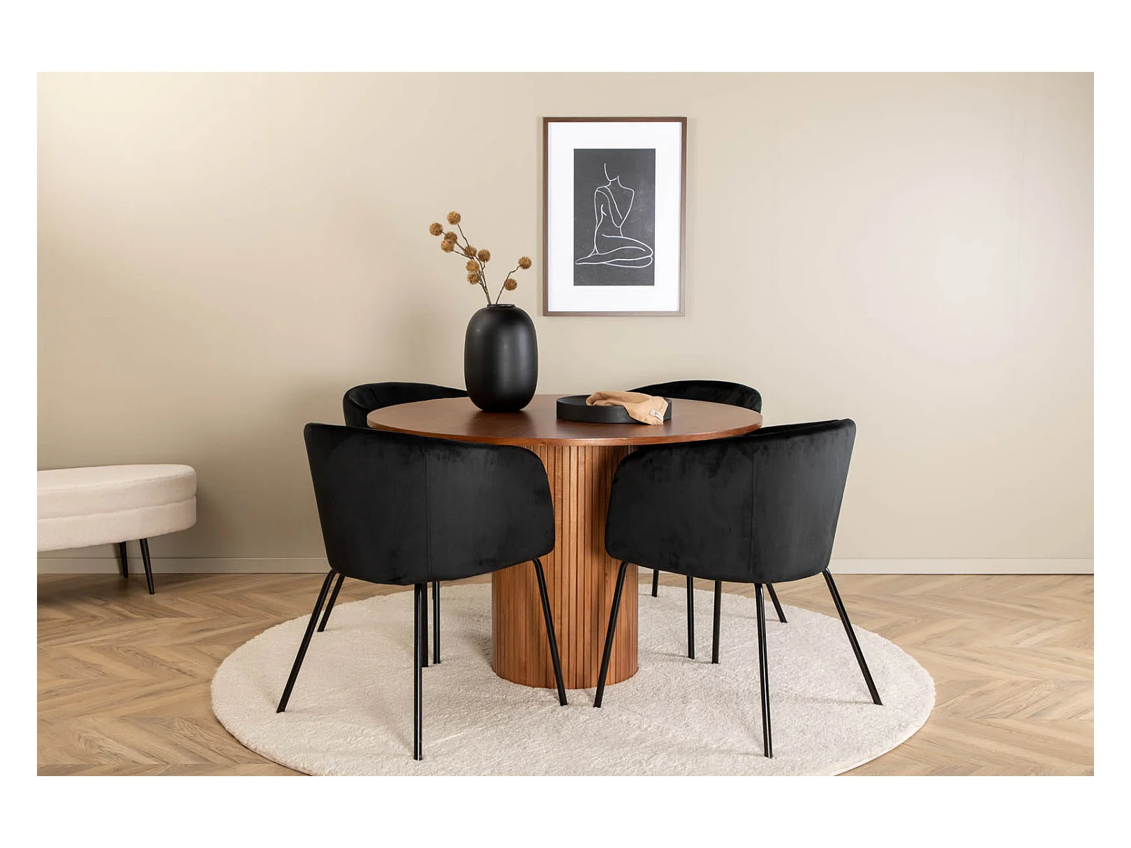 BiancaROWA ensemble table, table chêne plaqué et 4 Berit chaises Velours noir.