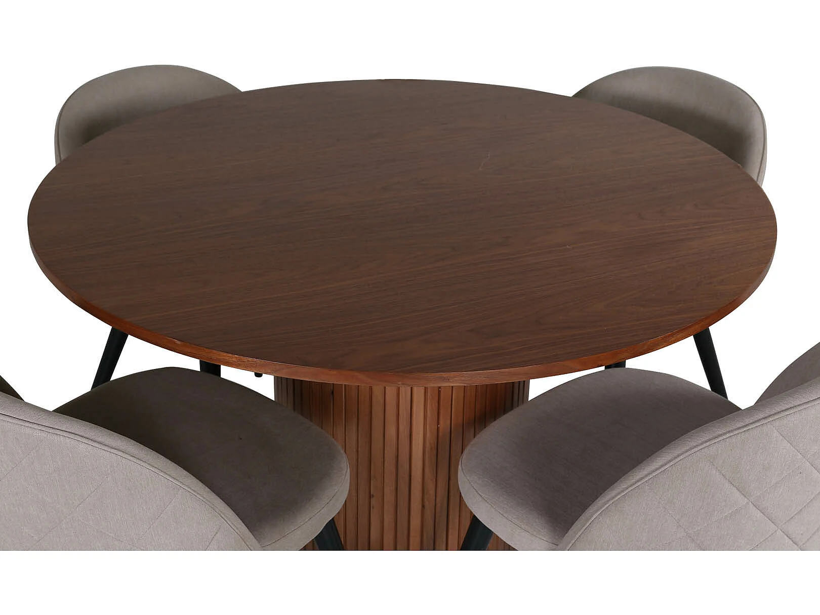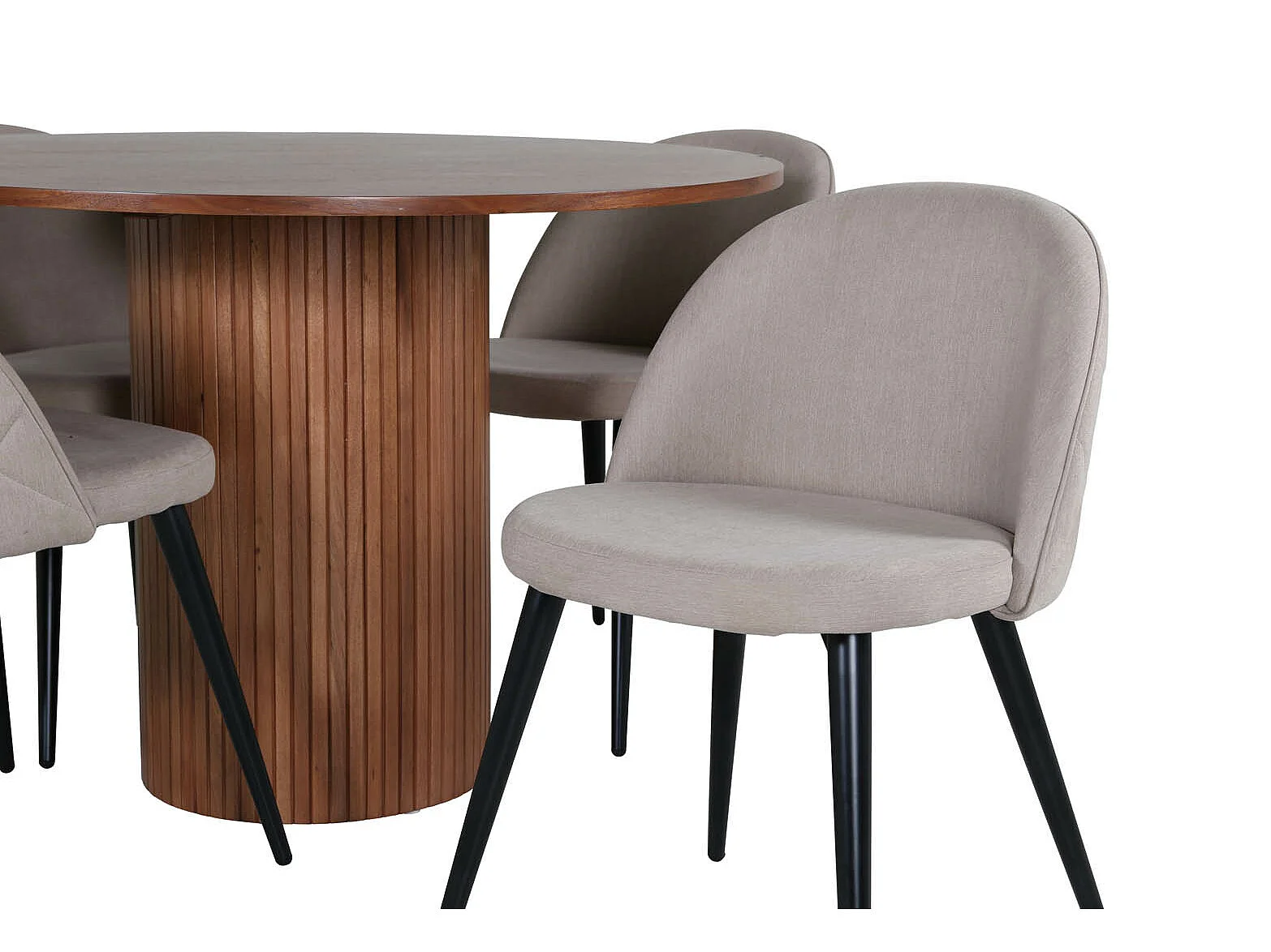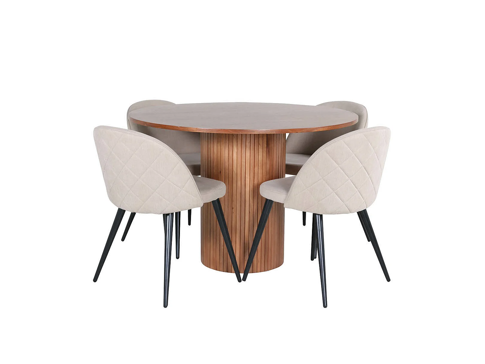 BiancaROWA ensemble table, table chêne plaqué et 4 Velvet Stitches chaises beige.