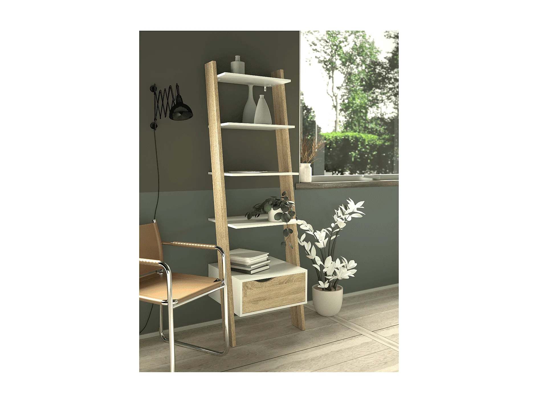 Bibliothèque 4 étagères, 1 tiroir blanc et décor chêne H180,4 cm - BILLUND