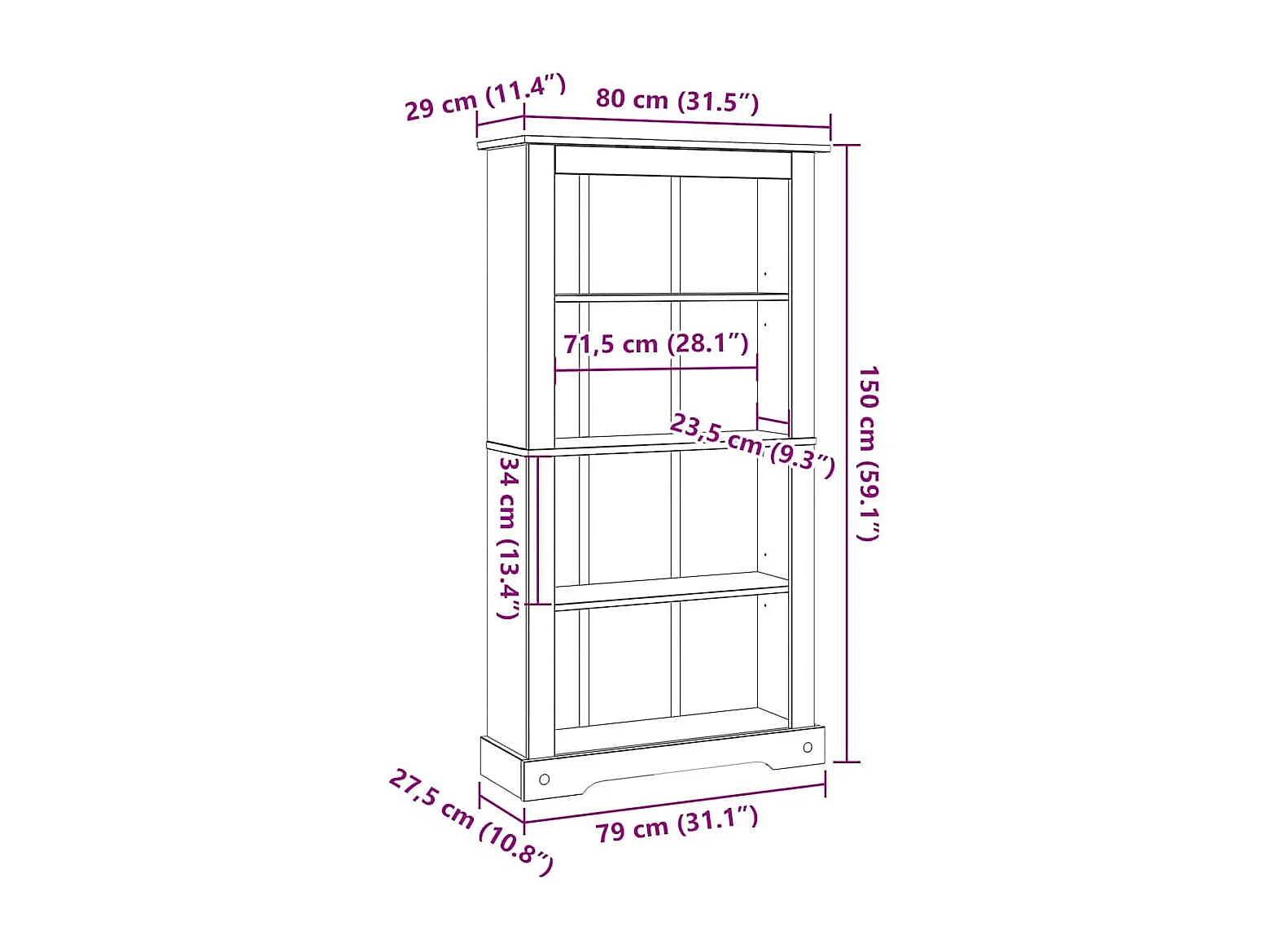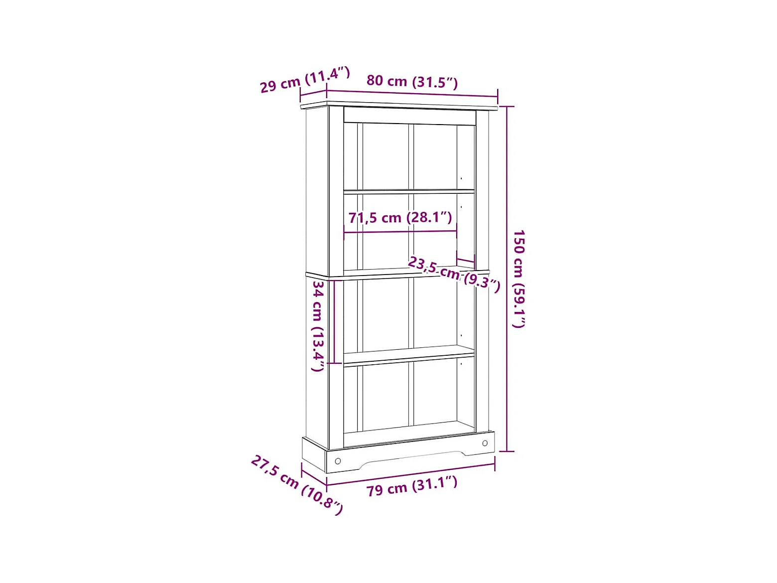 Bibliothèque 4 niveaux Gamme Corona Pin mexicain 80x29x150 cm