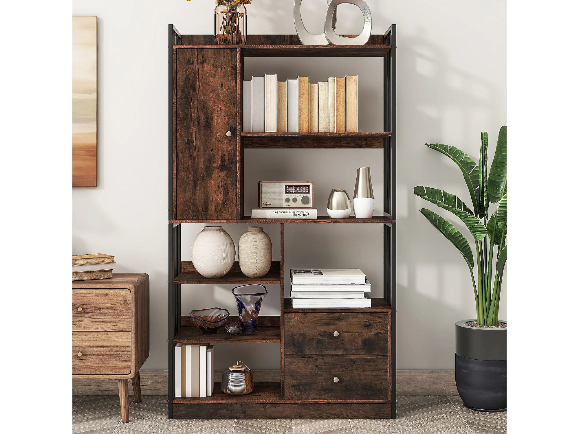 Bibliothèque à 6 étagères avec une porte et 2 tiroirs - 100 x 30 x 173.5 - Panneau de particules et métal - marron + noir